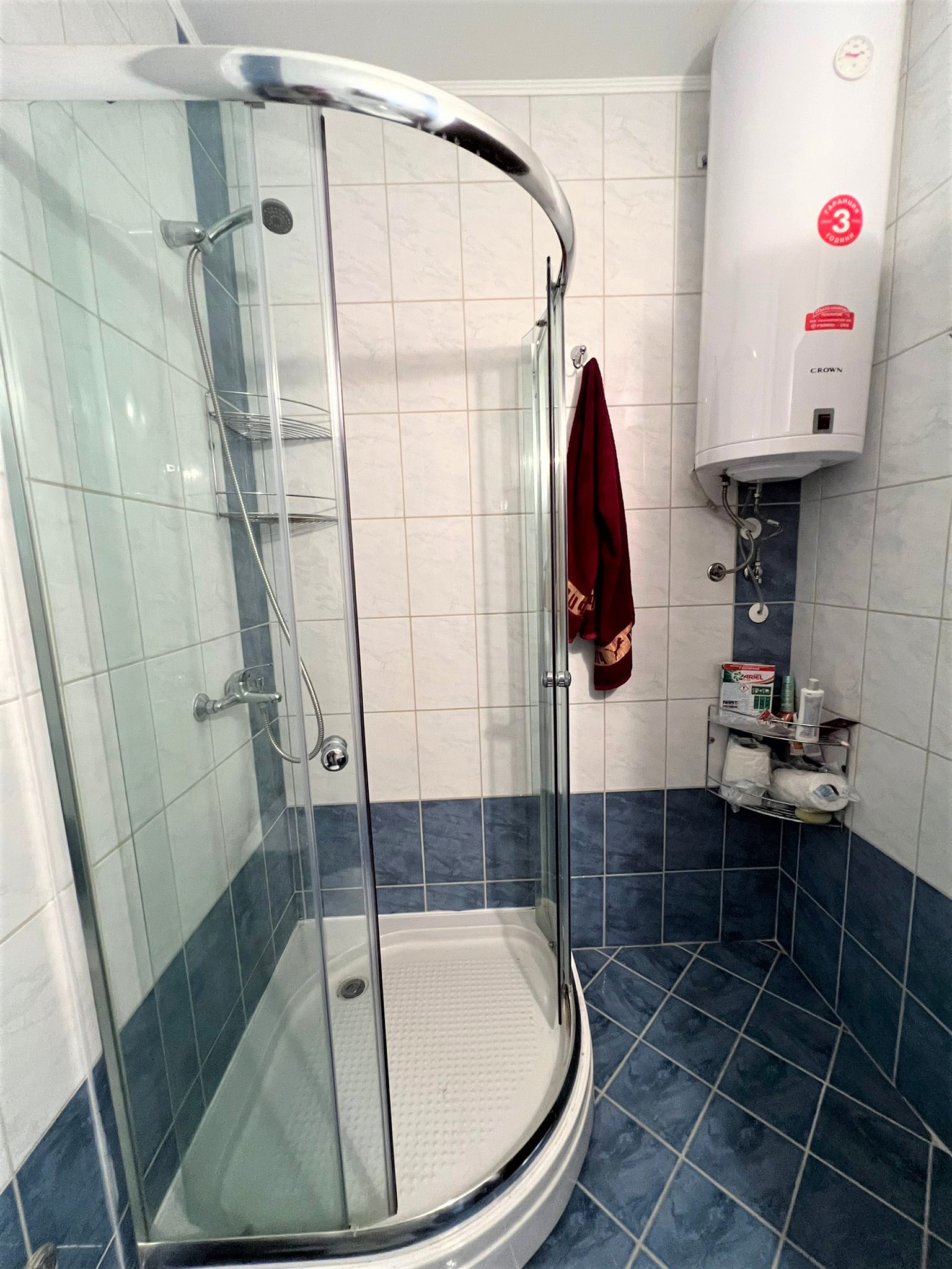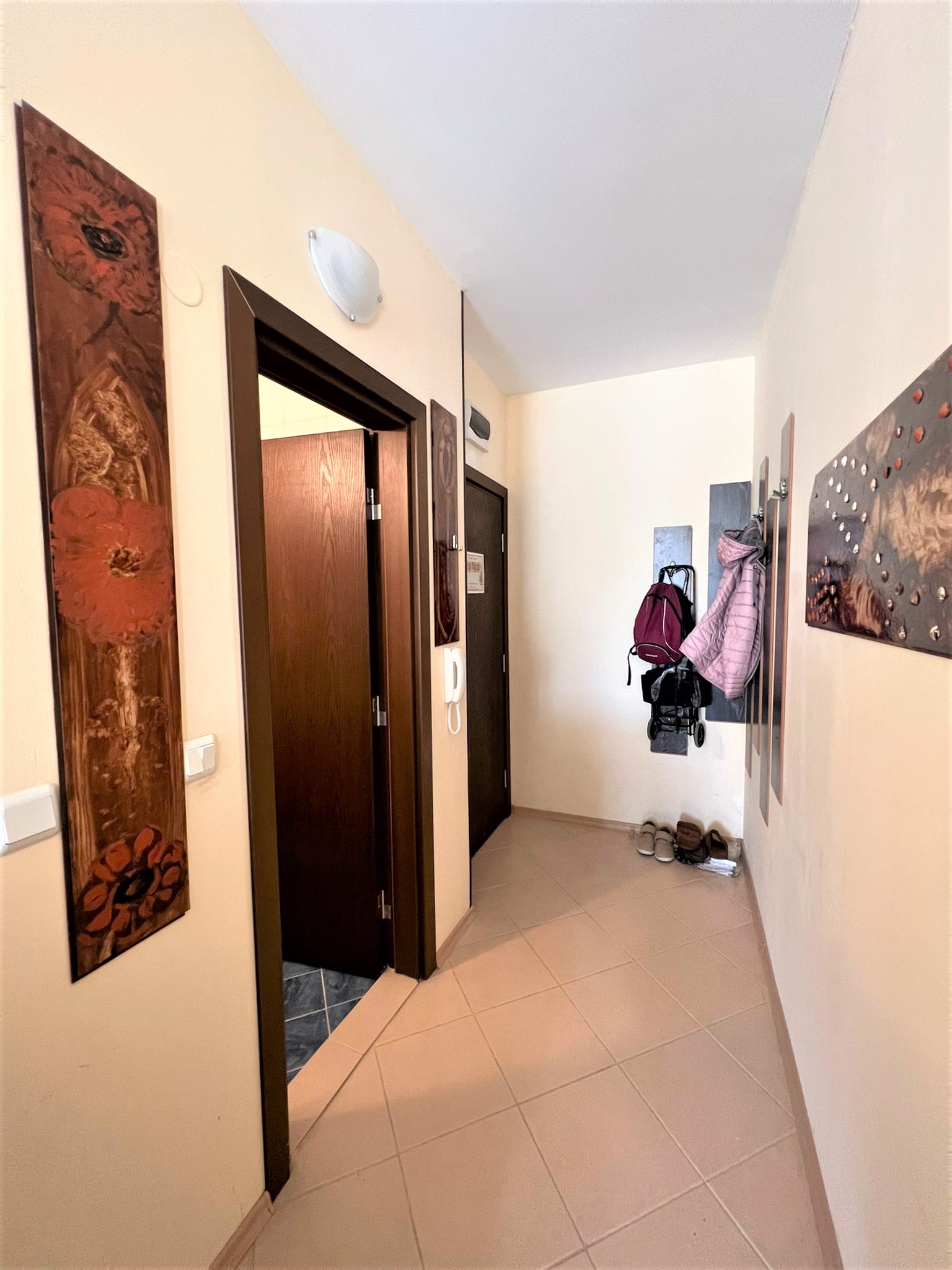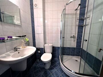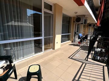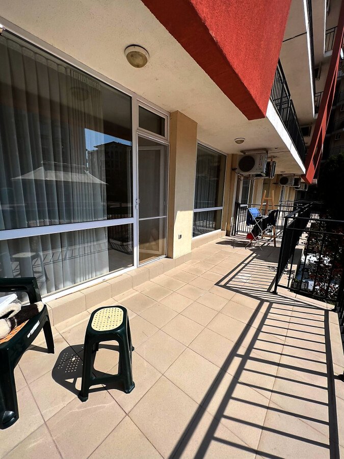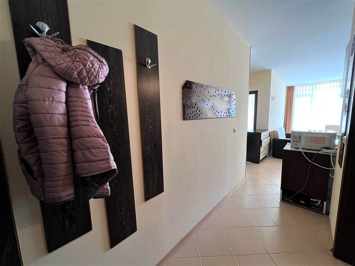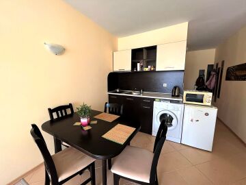 Апартаментът е светъл, просторен и много функционален, със следното разпределение – входно антре, всекидневна с обособена зона за хранене и кухненски бокс, две спални, тоалетна, баня с тоалетна и душ кабина, тераса с прекрасна гледка към вътрешната озеленена част на комплекса и към басейна. Продава се в отлично състояние, напълно оборудван и мебелиран, както е на снимките, готов за нанасяне.