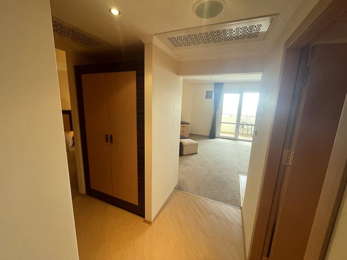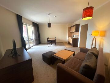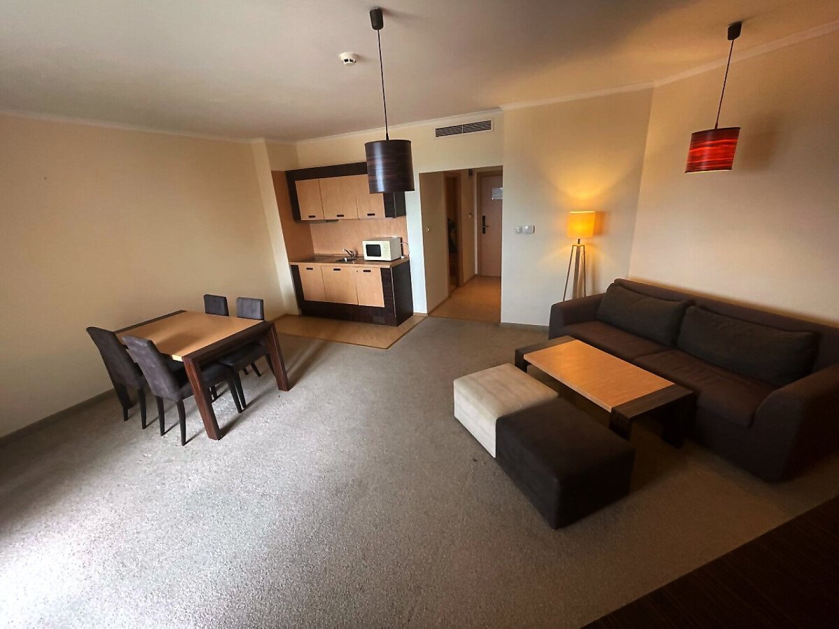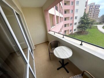 Апартаментът е със следното разпределение – входно антре, всекидневна с малък кухненски бокс и обособена зона за хранене, спалня, баня с тоалетна и вана, тераса с красива гледка към озеленената вътрешна част на комплекса, басейна и морето. Продава се в отлично състояние, много добре оборудван и мебелиран, готов за нанасяне.