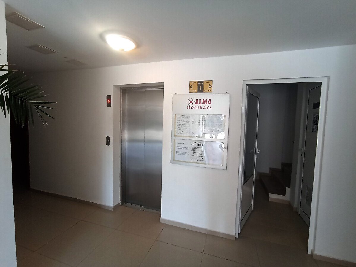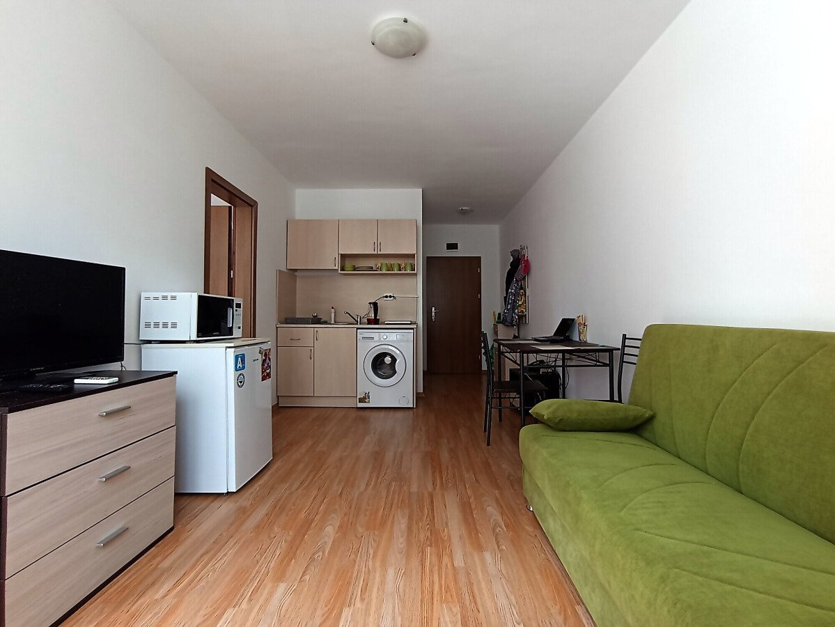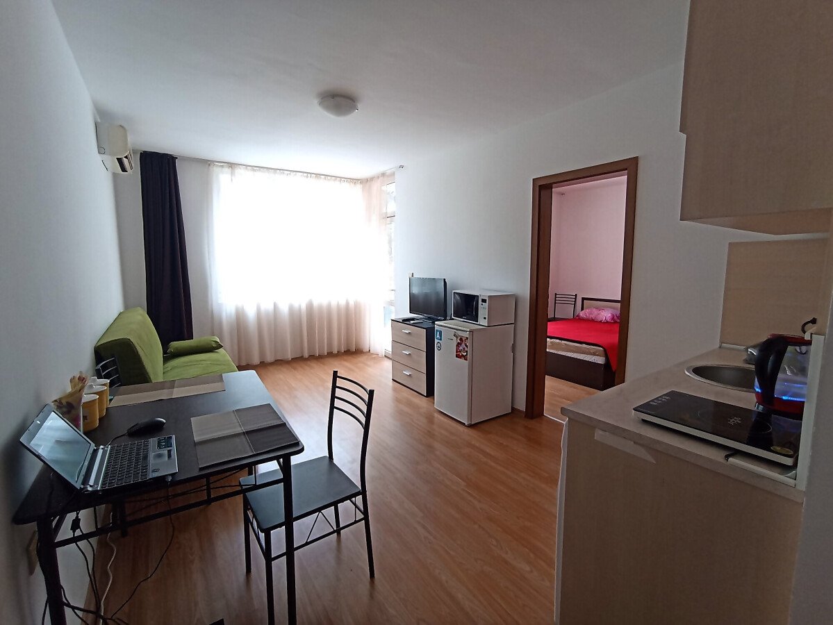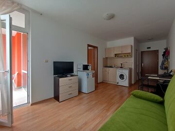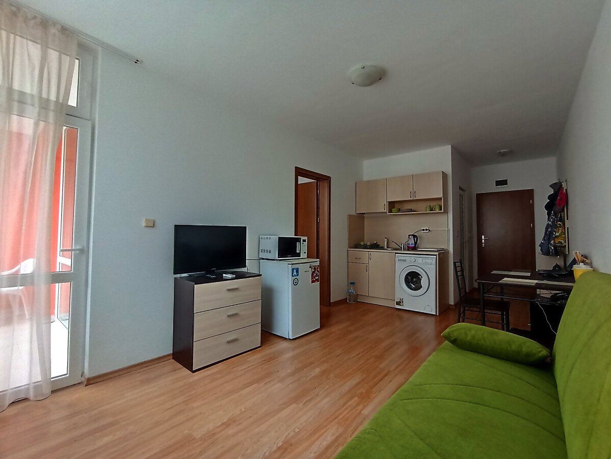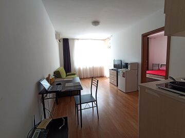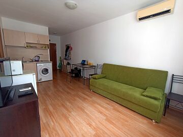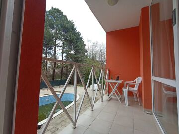 Апартаментът е разположен на втори етаж и има следното разпределение – всекидневна с малък кухненски бокс и кът за хранене, спалня, баня с тоалетна и вана, тераса с чудесна гледка към басейна и вътрешната част на комплекса. Продава се в много добре състояние, напълно оборудван и обзаведен с всичко необходимо, готов за нанасяне.