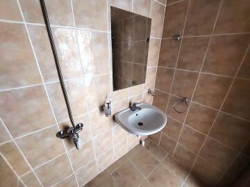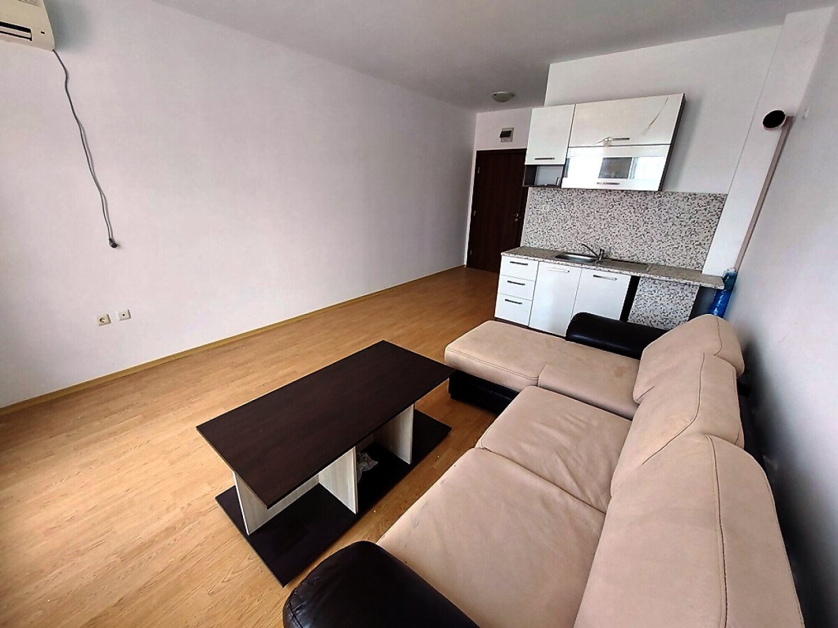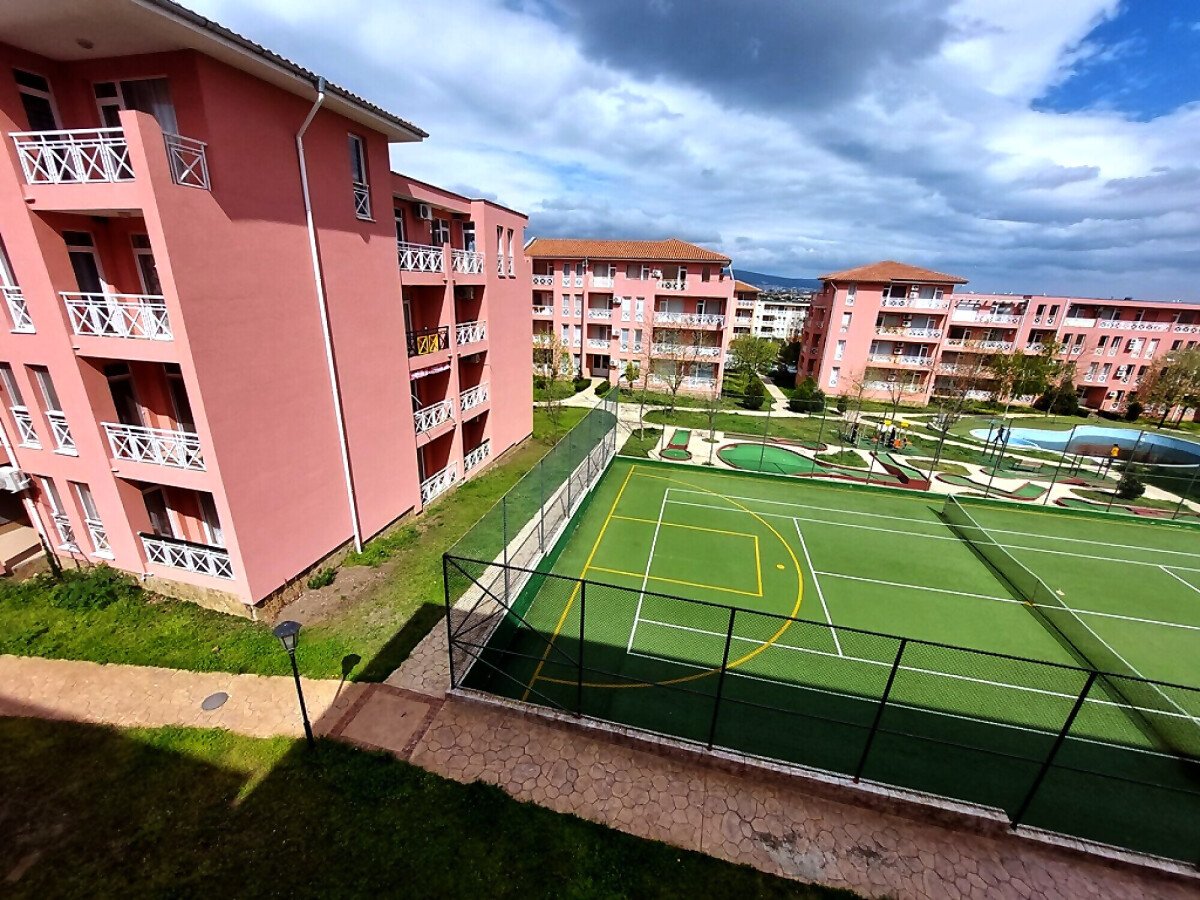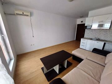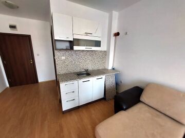 Студиото е разположено на трети, предпоследен етаж и има следното разпределение – входно антре, всекидневна с малък кухненски бокс, баня с тоалетна. Жилището има красив изглед към вътрешната част на комплекса, спортните площадки и басейна. Продава се в много добро състояние, обзаведено и оборудвано с всичко необходимо за комфортен престой, готово за нанасяне.