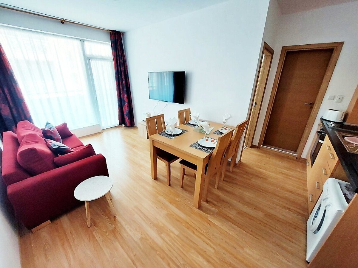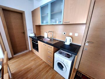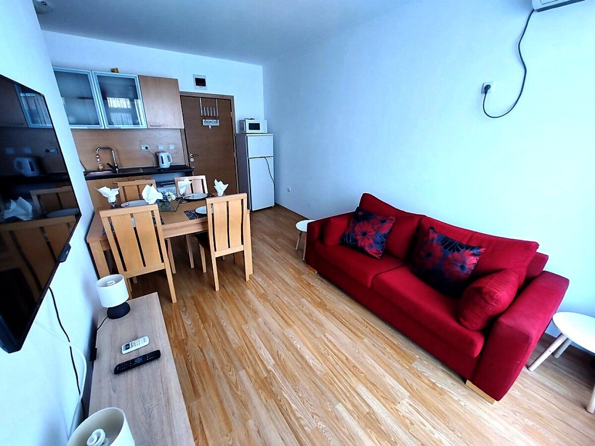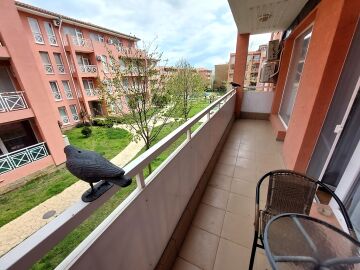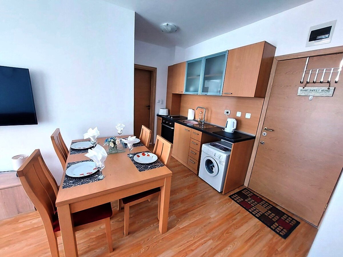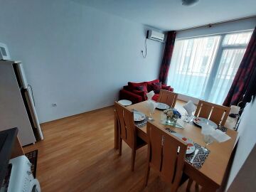 Апартаментът е разположен на втори етаж и има следното разпределение – всекидневна с малък кухненски бокс и зона за хранене, спалня, баня с тоалетна и душ кабина, тераса с чудесна гледка към озеленената част на комплекса и към басейна. Продава се в много добро състояние, обзаведен и напълно оборудван – и в двете стаи има климатик.