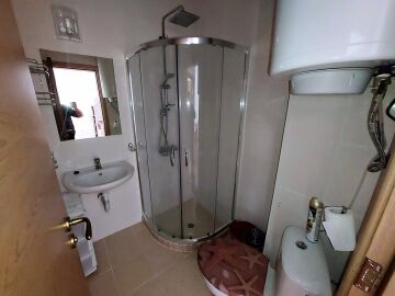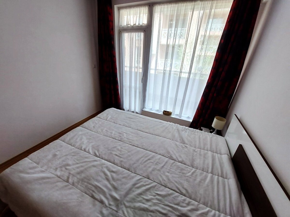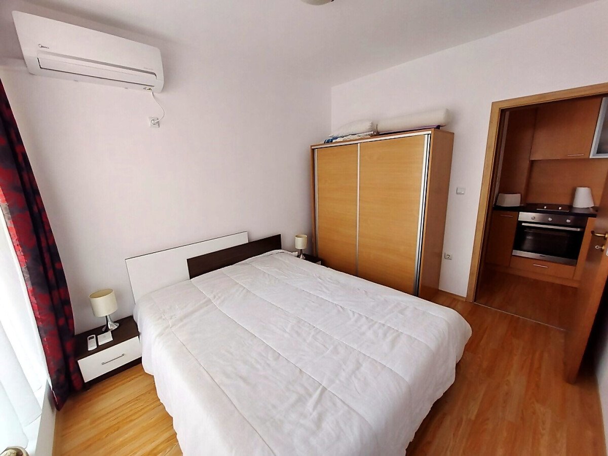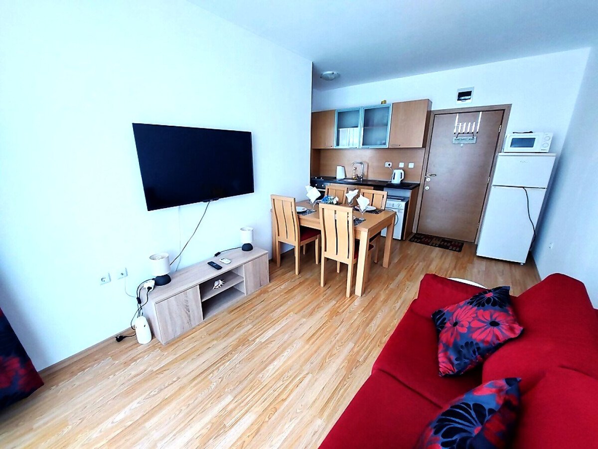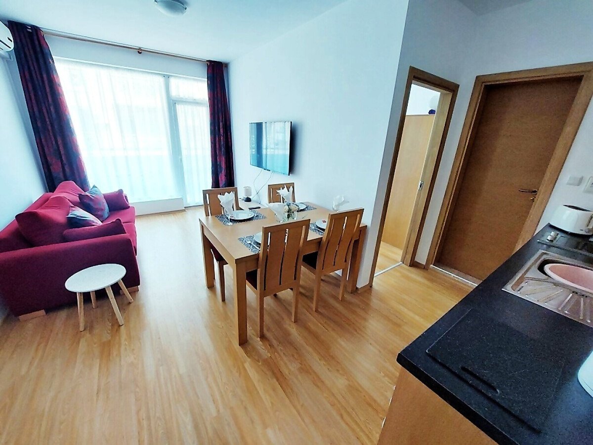 Апартаментът е разположен на втори етаж и има следното разпределение – всекидневна с малък кухненски бокс и зона за хранене, спалня, баня с тоалетна и душ кабина, тераса с чудесна гледка към озеленената част на комплекса и към басейна. Продава се в много добро състояние, обзаведен и напълно оборудван – и в двете стаи има климатик.