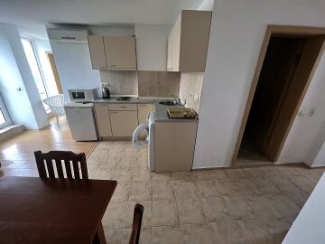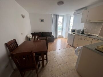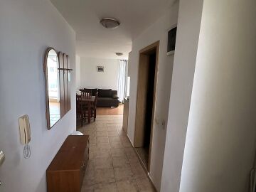 Апартаментът е разположен на шести етаж и има следното разпределение – входно антре, всекидневна с кухненски бокс и трапезария, спалня, баня с тоалетна, тераса с панорамна гледка към курорта. Продава се с обзавеждане и оборудване, в отлично състояние, готов за живеене.