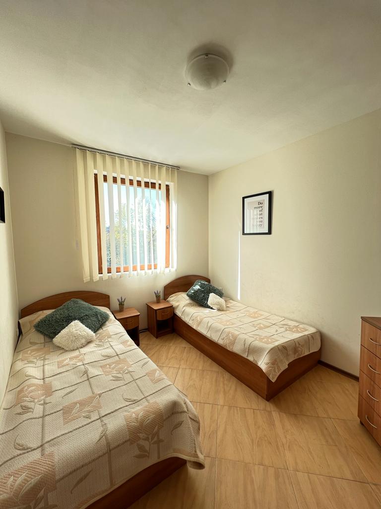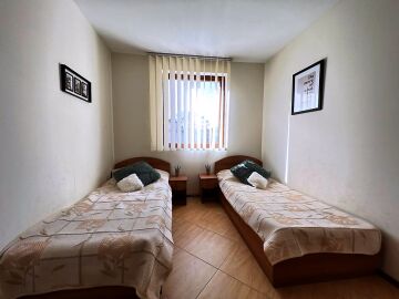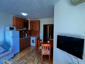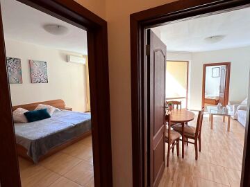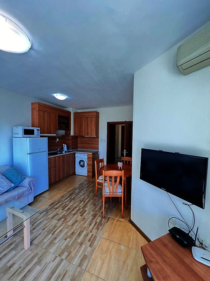 Апартаментът е разположен на четвърти етаж, много функционален, със следното разпределение – входно антре, всекидневна с кът за хранене и обособен кухненски бокс, две спални, баня с тоалетна, тераса с красива гледка към басейна и вътрешната територия на комплекса.