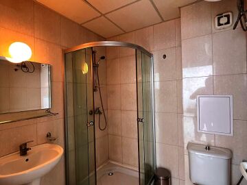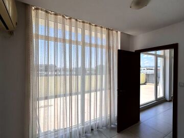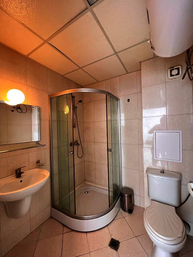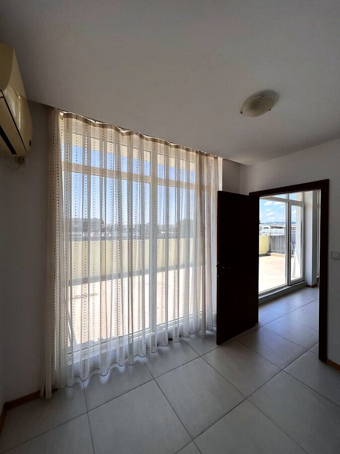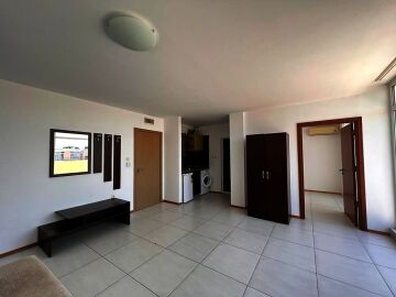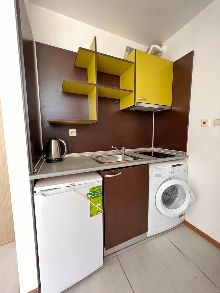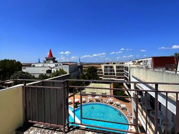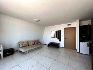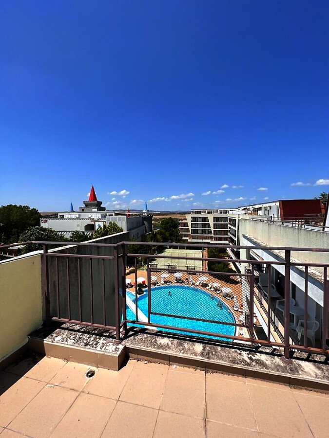 Апартаментът е разположен на шести, последен етаж, като в сградата има асансьор. Жилището е много функционално и има следното разпределение – просторна всекидневна с малък кухненски бокс, спалня, баня с тоалетна и душ кабина, тераса с прекрасна гледка към басейна, вътрешната част на комплекса и към планината. Имотът се продава в добро състояние след направен ремонт, частично обзаведен и оборудван, което е отлична възможност да го мебелирате според Вашия стил и предпочитания.