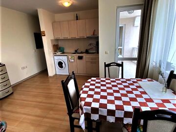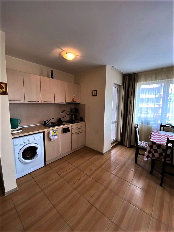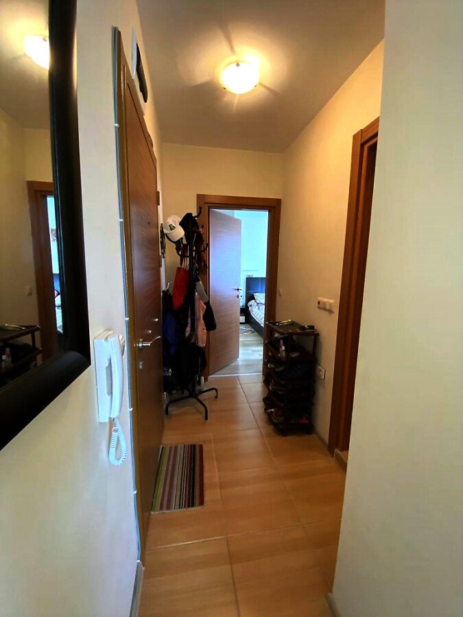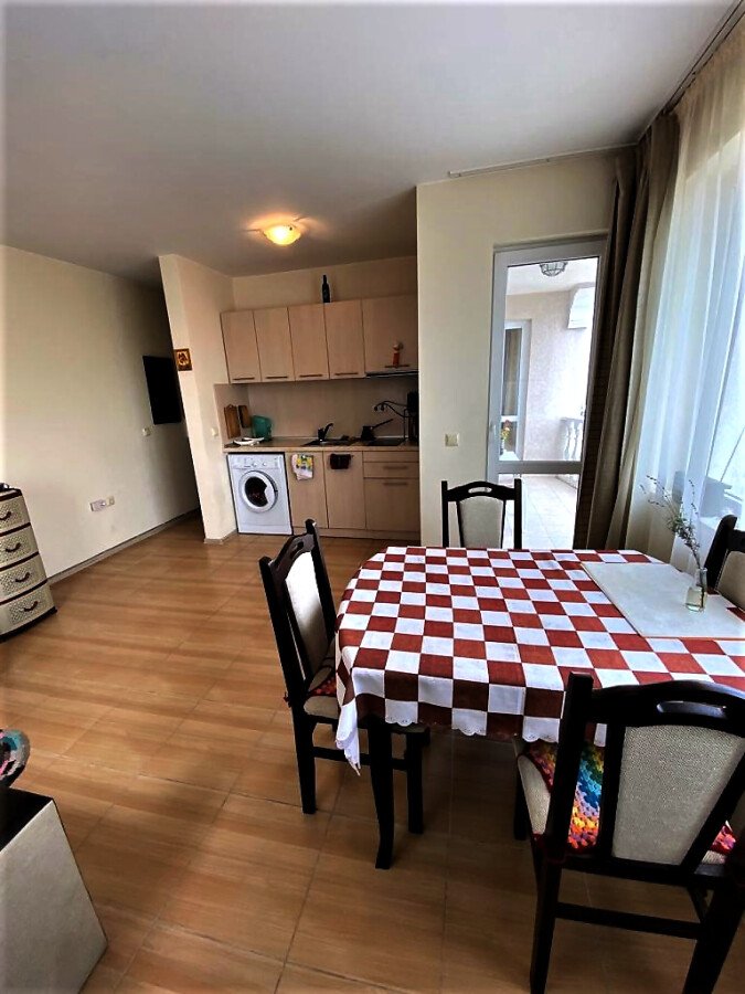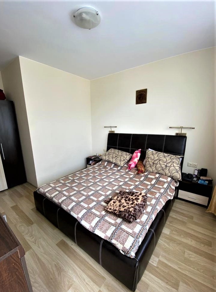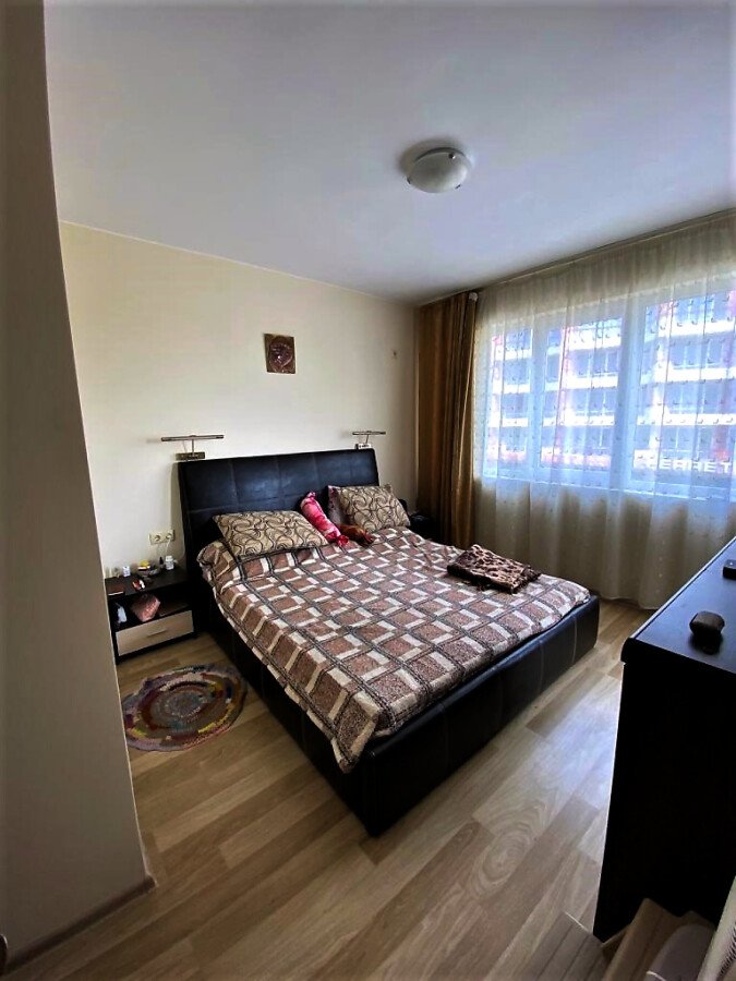 Апартаментът е разположен на трети етаж и има следното разпределение – входно антре, всекидневна с кухненски бокс и обособена зона за хранене, спалня, баня с тоалетна и душ кабина, тераса с изглед към града. Продава се готов за живеене, в много добро състояние, обзаведен и напълно оборудван.