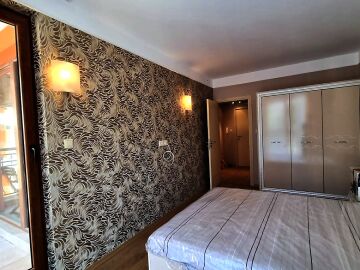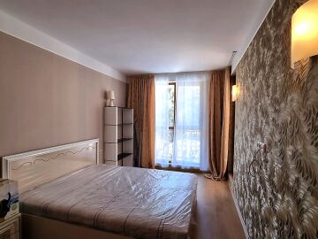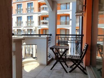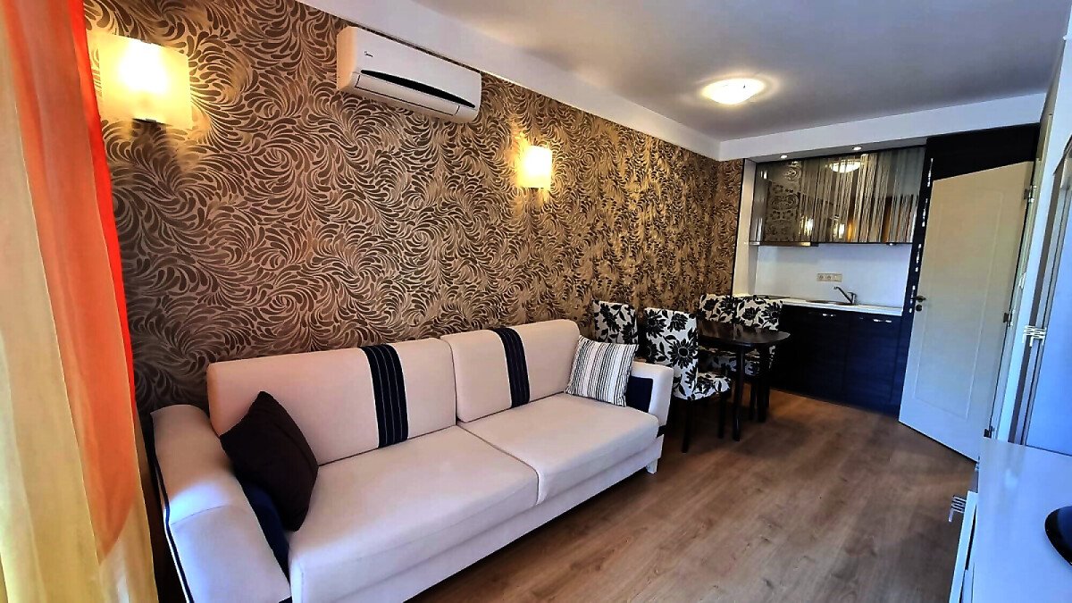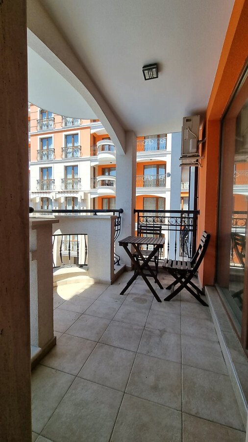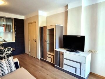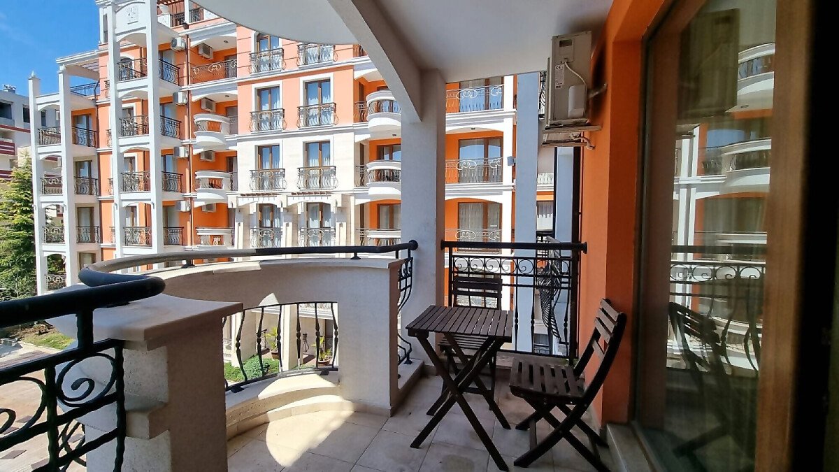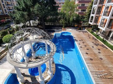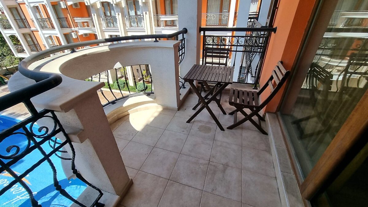 Предлагаме за продажба стилно обзаведен двустаен апартамент с гледка към басейна в чудесния комплекс „Хармони Палас“, разположен в един от най-популярните и атрактивни курорти на българското крайбрежие – Слънчев бряг, само на 400 метра от плажа и морето. Комплексът се намира в комуникативен район с добре развита инфраструктура – в близост има голям супермаркет, магазини, ресторанти и кафенета, барове, летни атракции. Благодарение на това имотът е много подходящ за постоянно живеене.