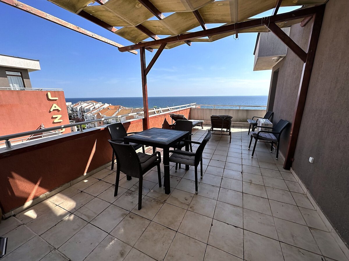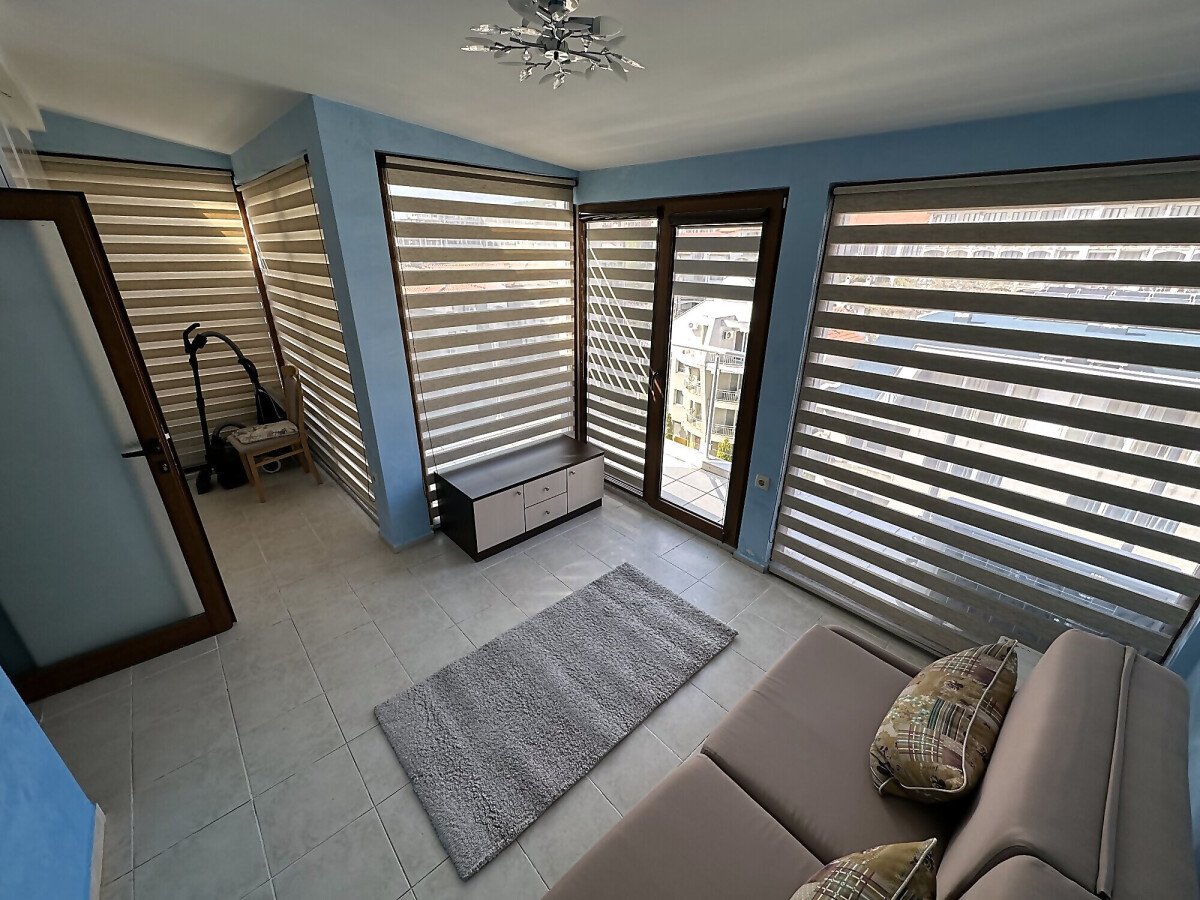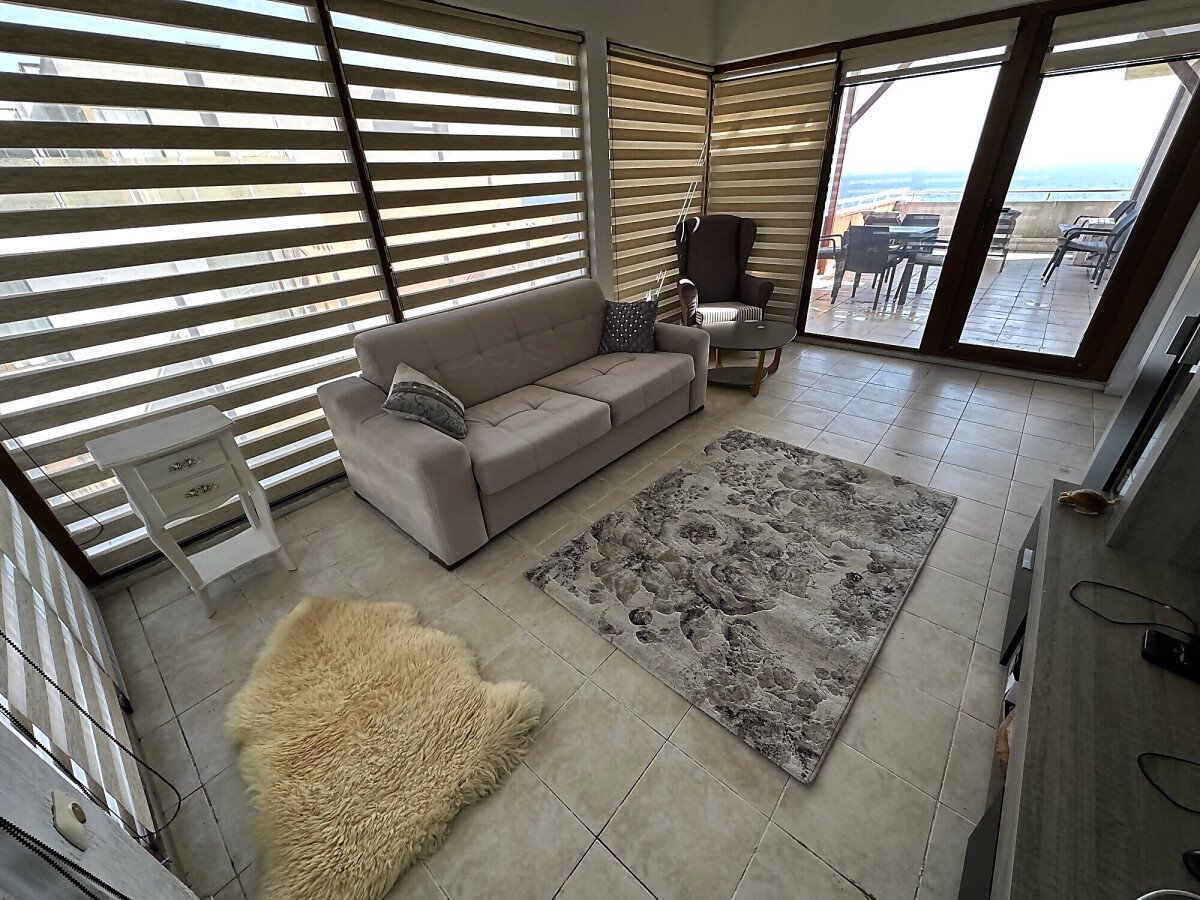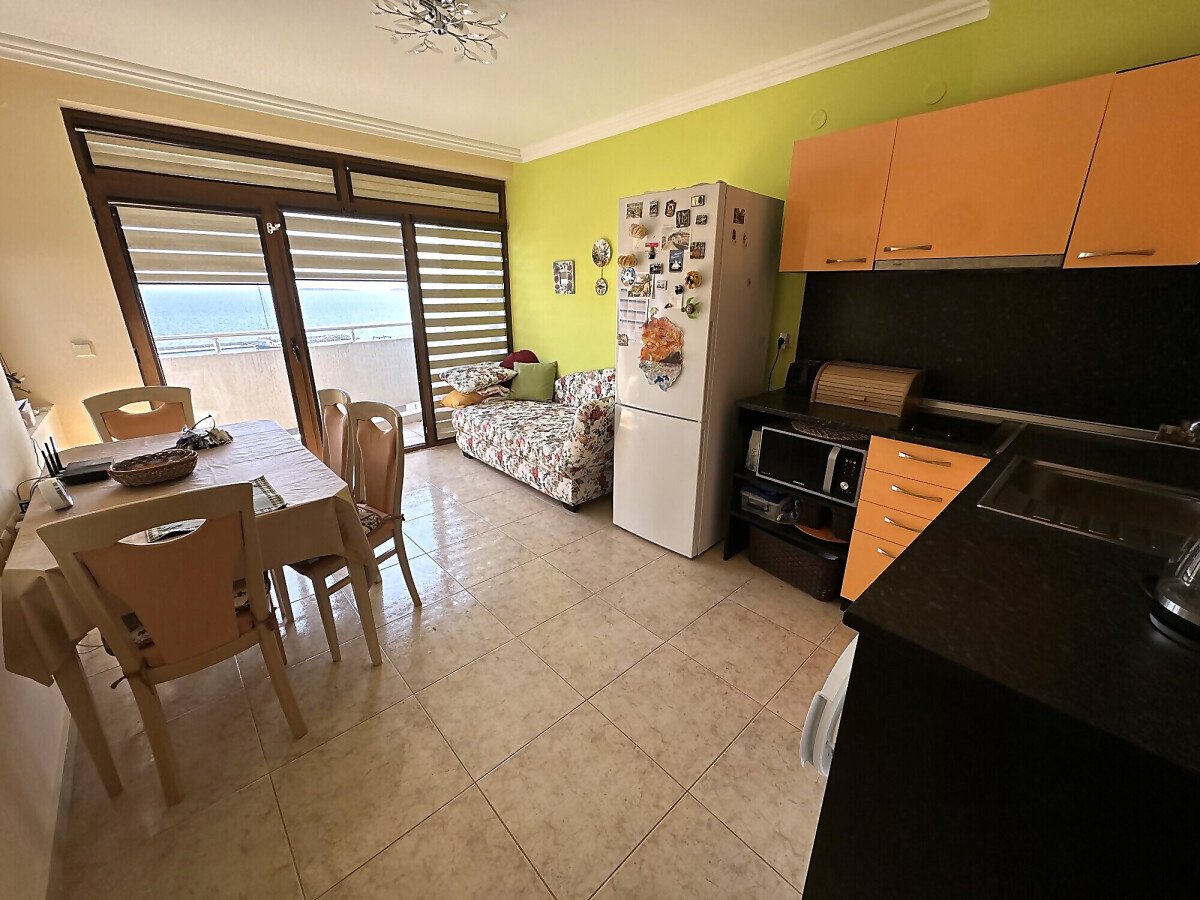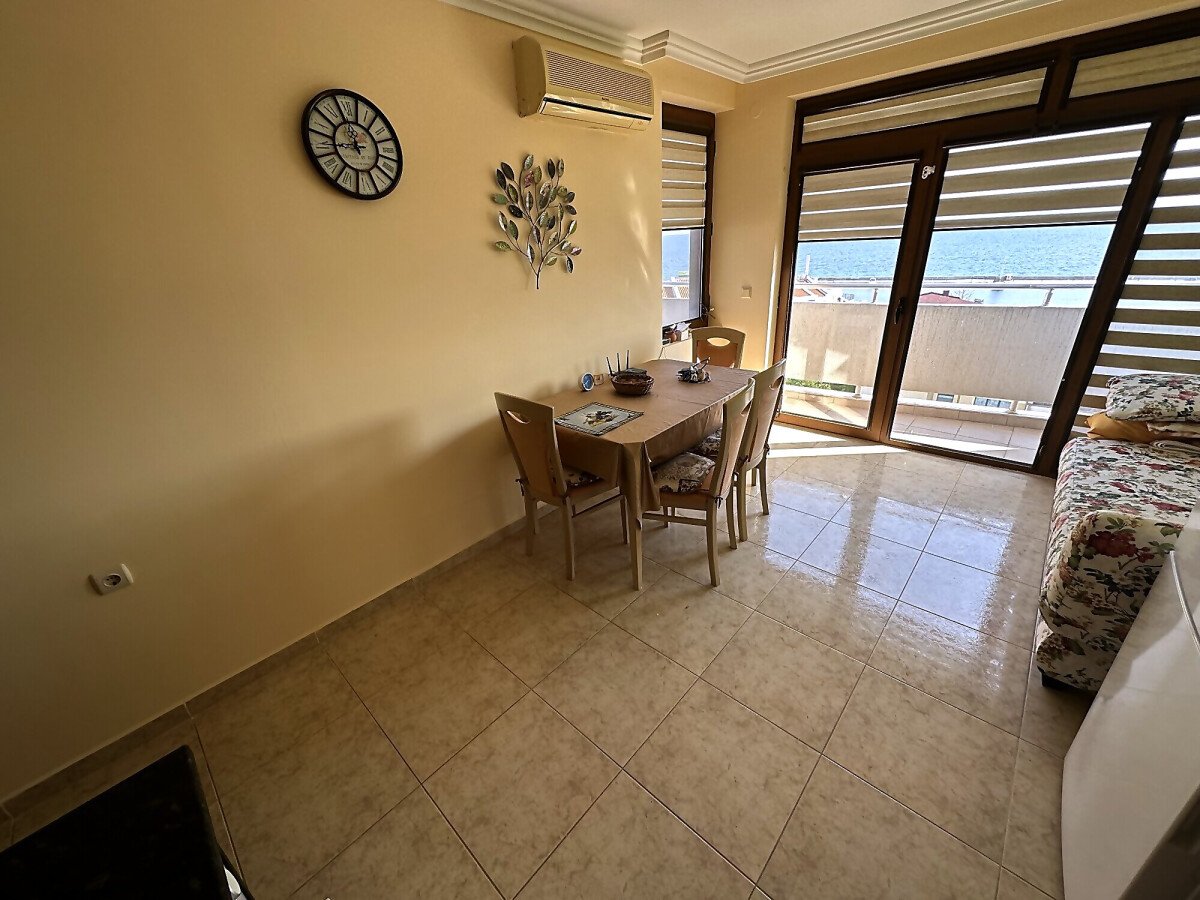Апартаментът е просторен и много функционален, със следното разпределение – входно антре, всекидневна с малък кухненски бокс и трапезария, две спални, баня с тоалетна и душ кабина, голяма тераса с невероятна панорамна гледка към морето. Продава се напълно обзаведен и оборудван, и в трите стаи има климатик, готов за живеене!