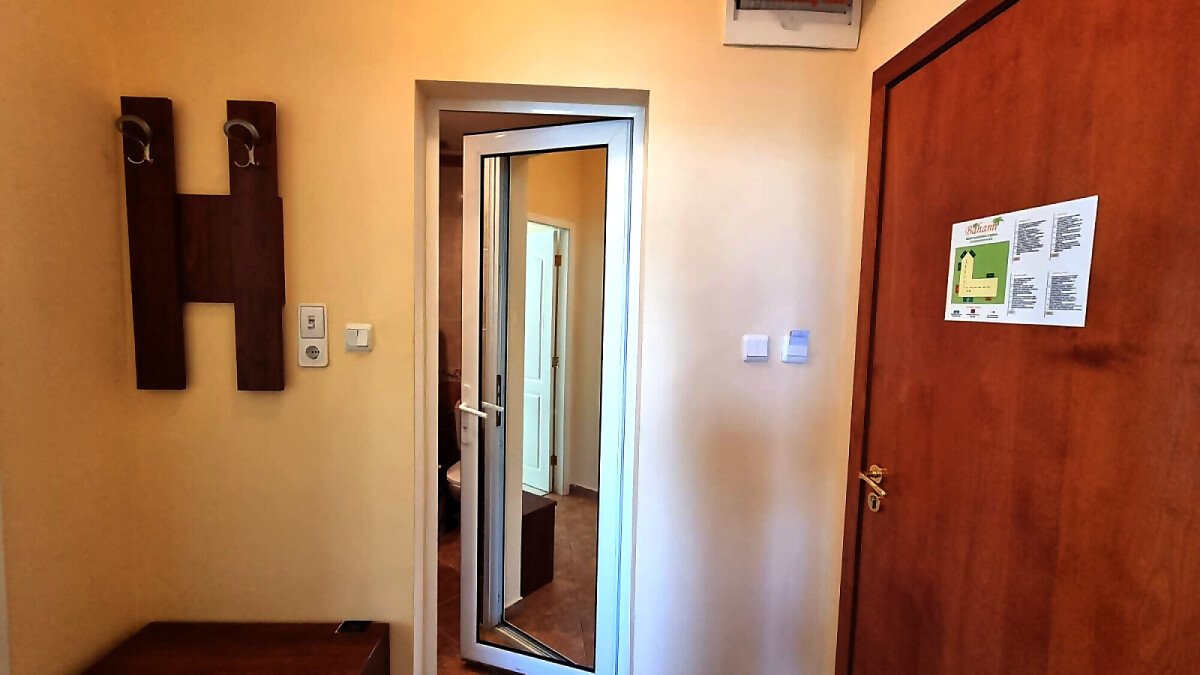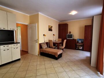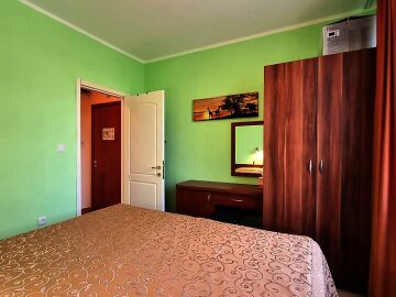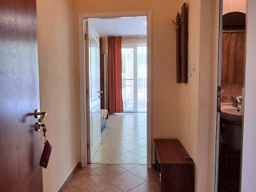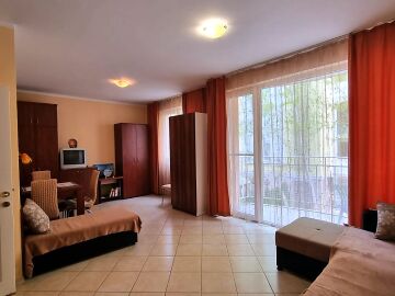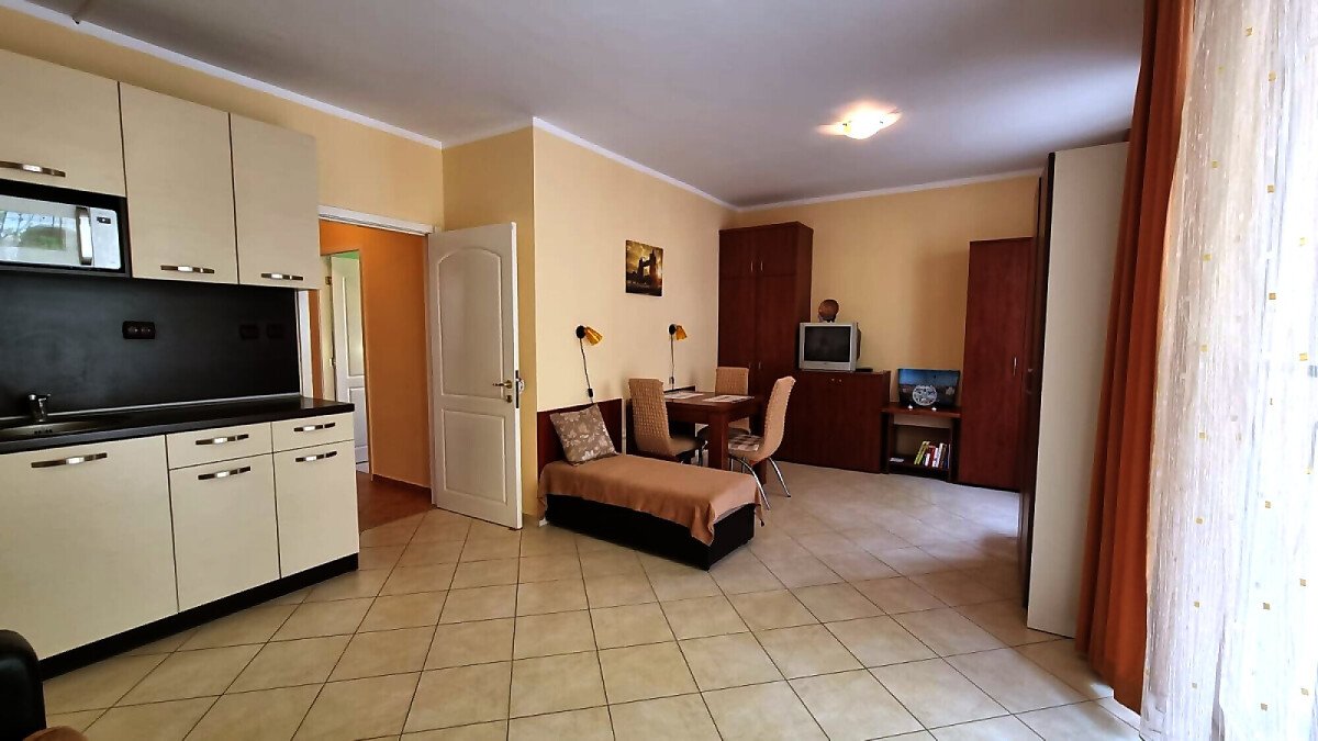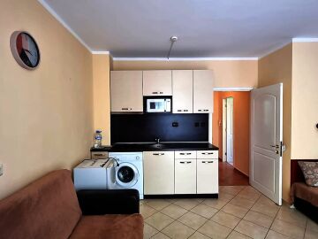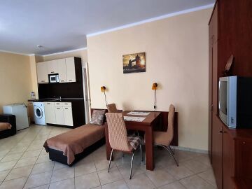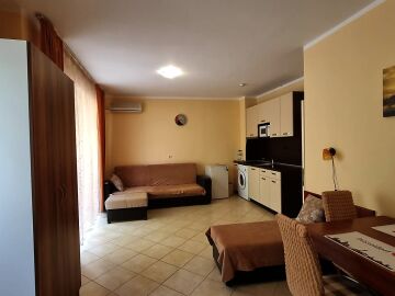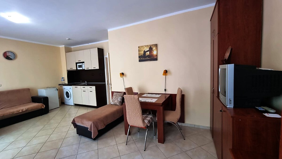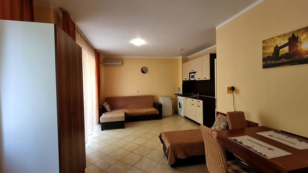 Апартаментът е много функционален и има следното разпределение – входно антре, голяма всекидневна с кухненски бокс и зона за хранене, спалня, баня с тоалетна, тераса с изглед към курорта.