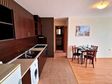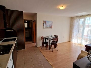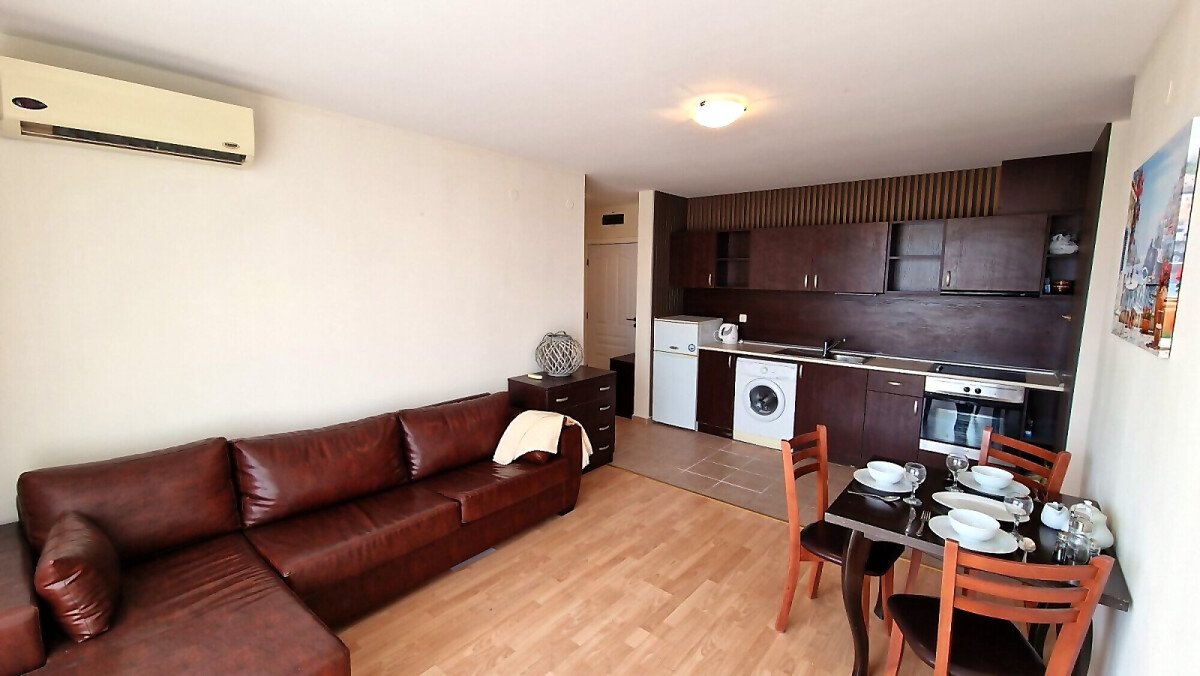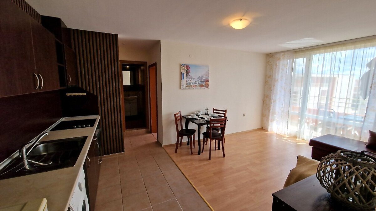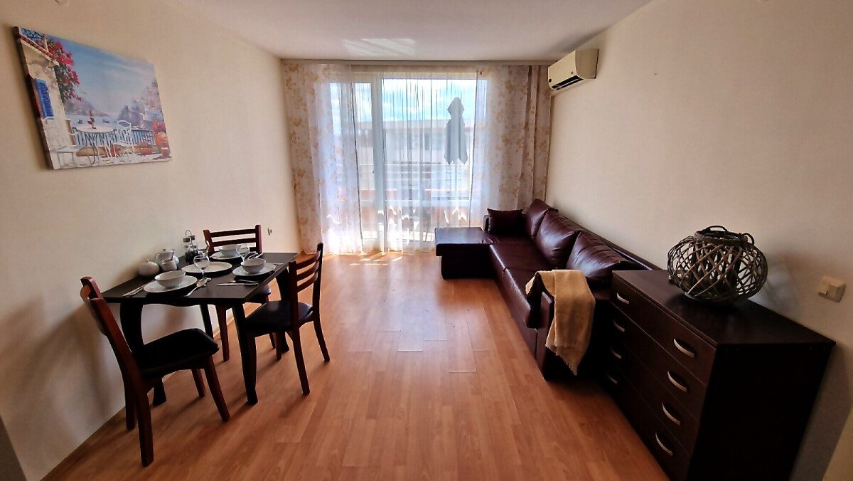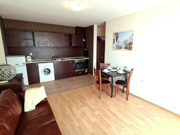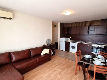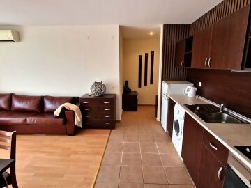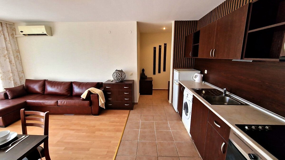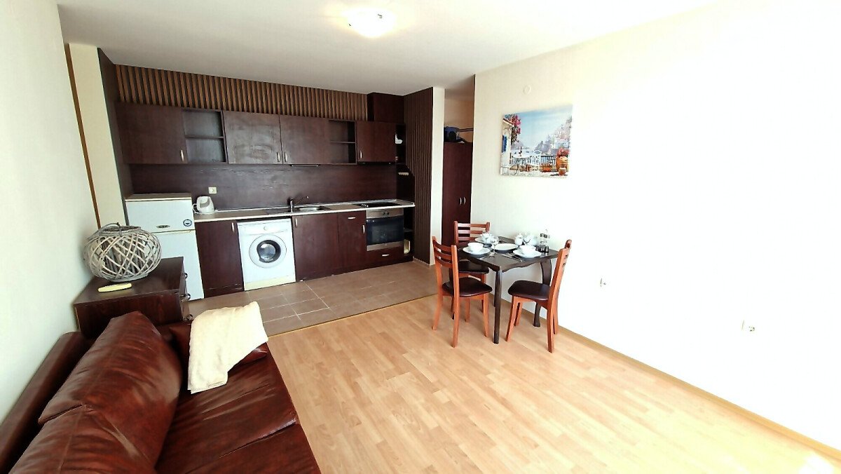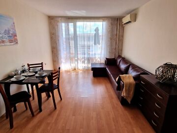 Апартаментът се продава в отлично състояние, напълно обзаведен и оборудван с всичко необходимо, готов за живеене. Състои се от входно антре, стилна и голяма всекидневна с кухня и кът за хранене, спалня, баня с тоалетна и душ кабина, тераса с красива гледка към басейна и двора.