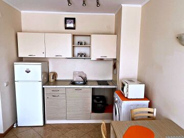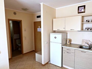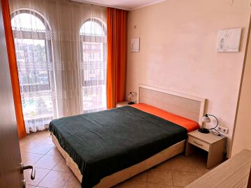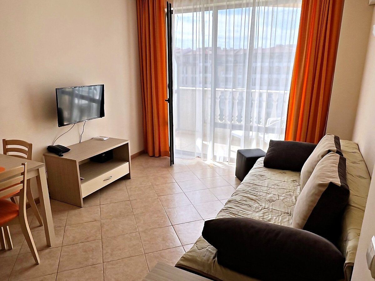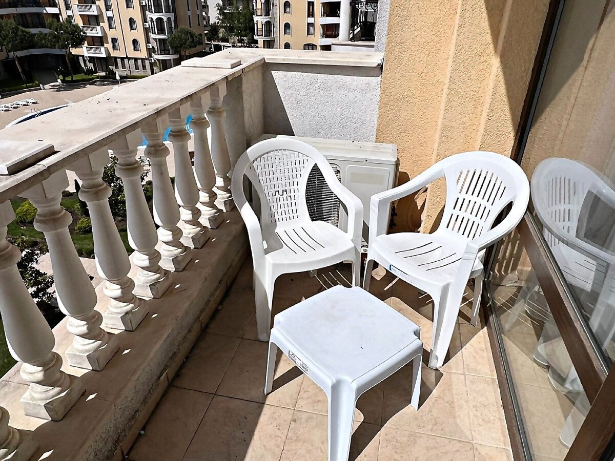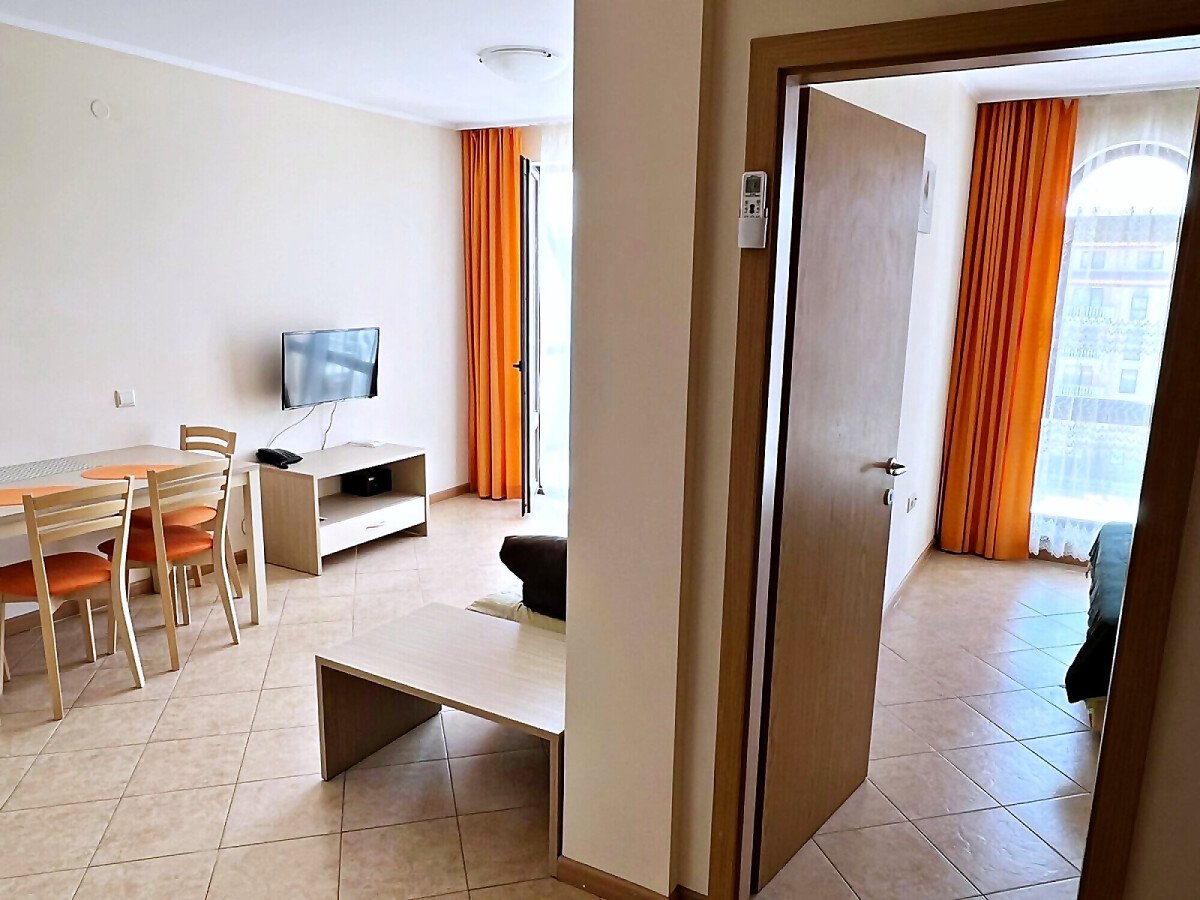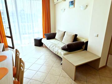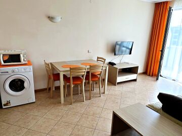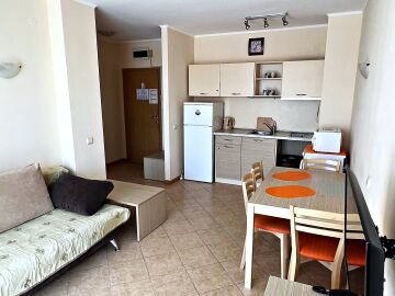 Апартаментът е разположен на пети, предпоследен етаж и има следното разпределение – входно антре, всекидневна с кухненски бокс и зона за хранене, спалня, баня с тоалетна и вана, чудесна тераса с красива гледка към басейна. Продава се в отлично състояние, напълно оборудван и мебелиран, готов за живеене.