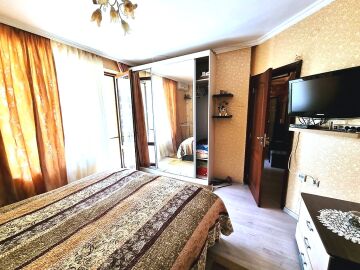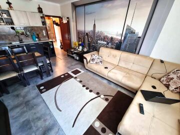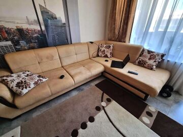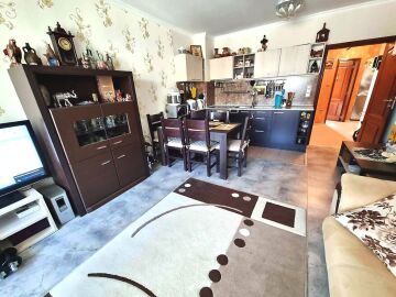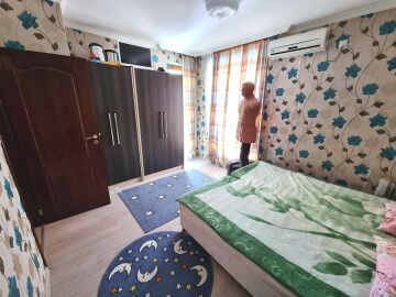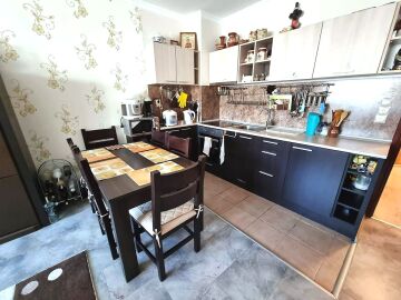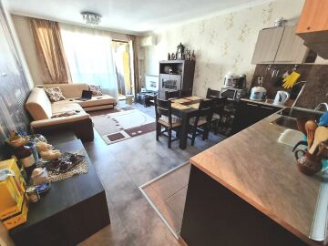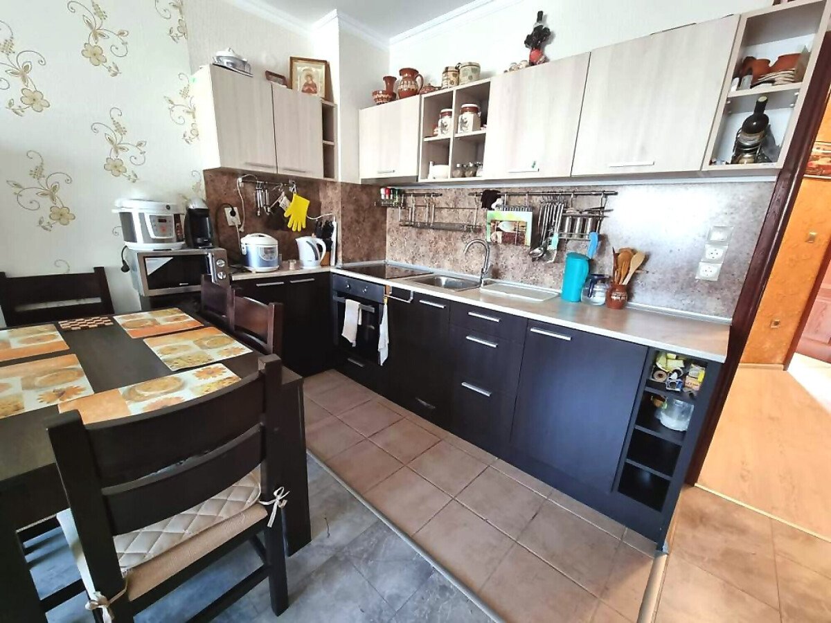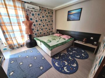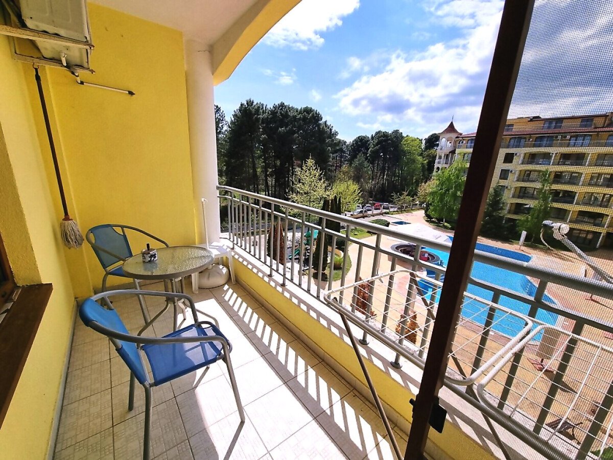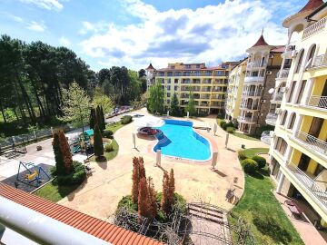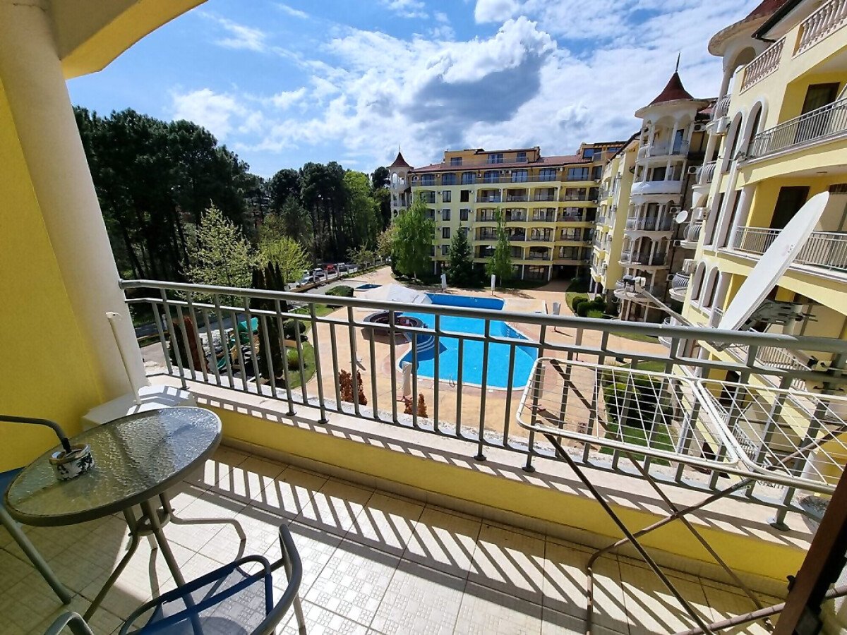 Апартаментът е много функционален, в отлично състояние, стилно мебелиран и оборудван. Състои се от входно антре, всекидневна с обособен кът за хранене и кухня, голям коридор, две спални, две тераси, две бани с тоалетна и душ кабина. И от двете тераси има красив изглед към басейна и вътрешната част на комплекса.