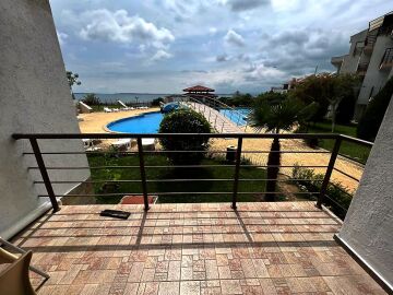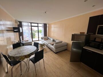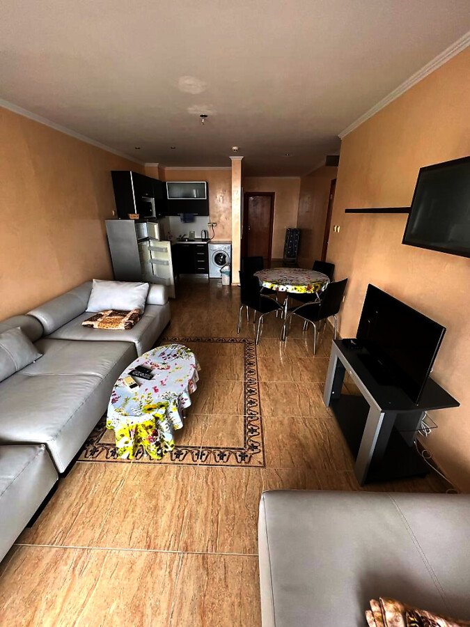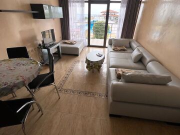 Апартаментът е разположен на първи етаж и има следното разпределение – всекидневна с обособена зона за хранене и кухненски бокс, спалня, баня с тоалетна и душ кабина, тераса с красива панорамна гледка към морето и басейна.