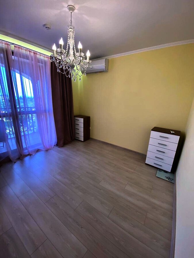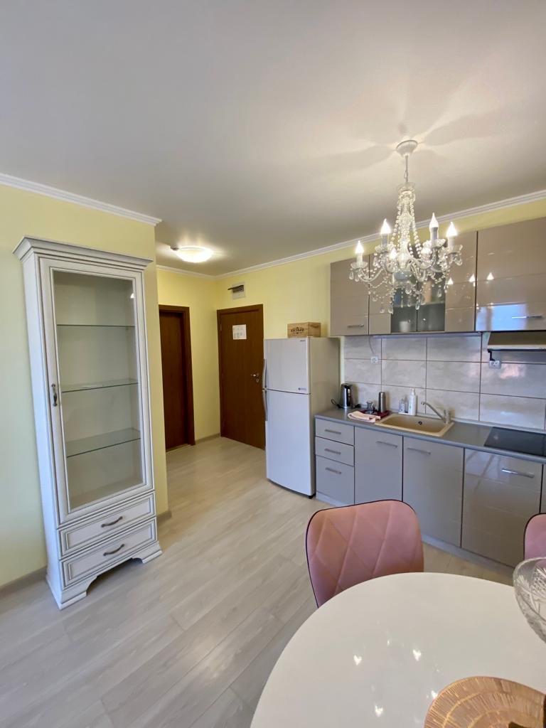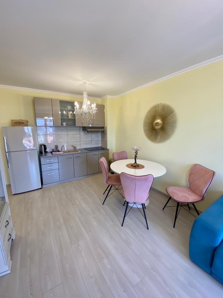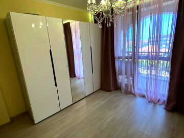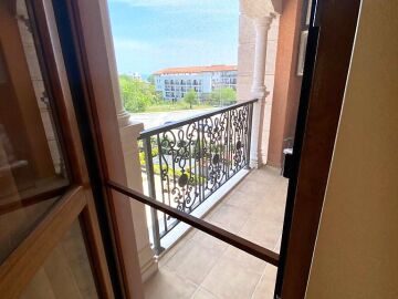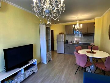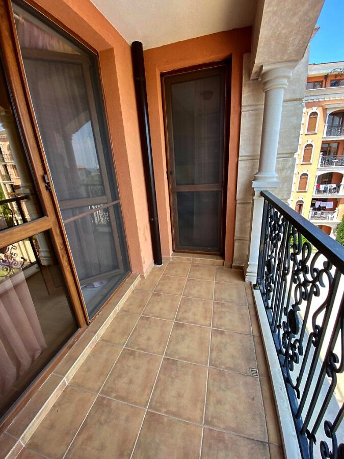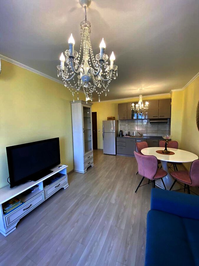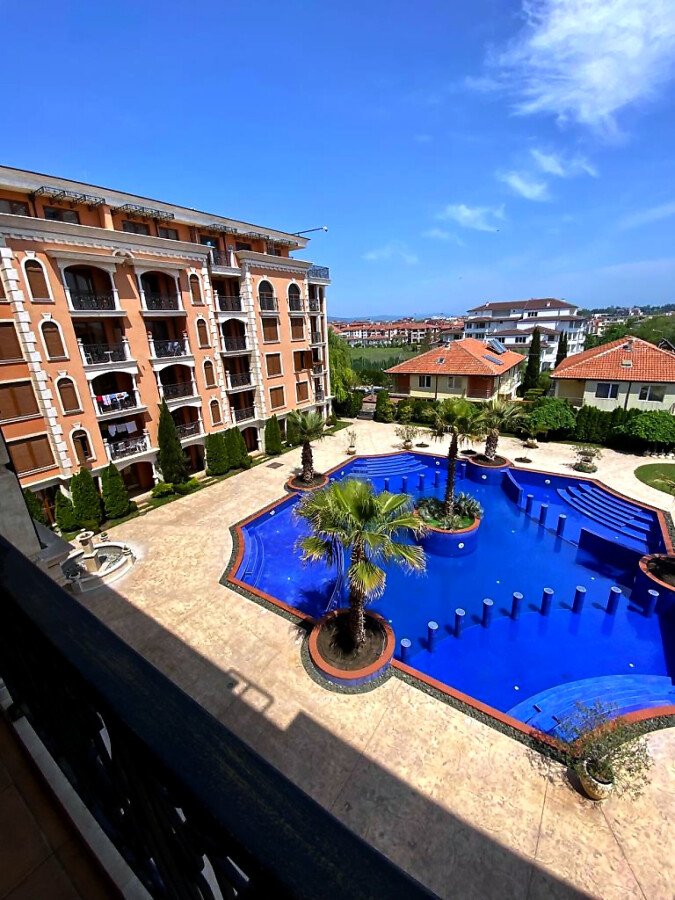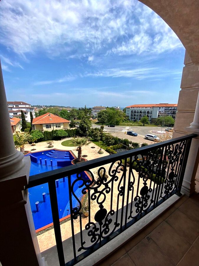 Апартаментът е разположен на четвърти етаж в сграда с асансьор и има следното разпределение – входно антре, всекидневна с обособена зона за хранене и кухненски бокс, спалня, баня с тоалетна и душ кабина, голяма тераса. От терасата се разкрива невероятна гледка към басейна, вътрешната територия на комплекса и частична гледка към морето.