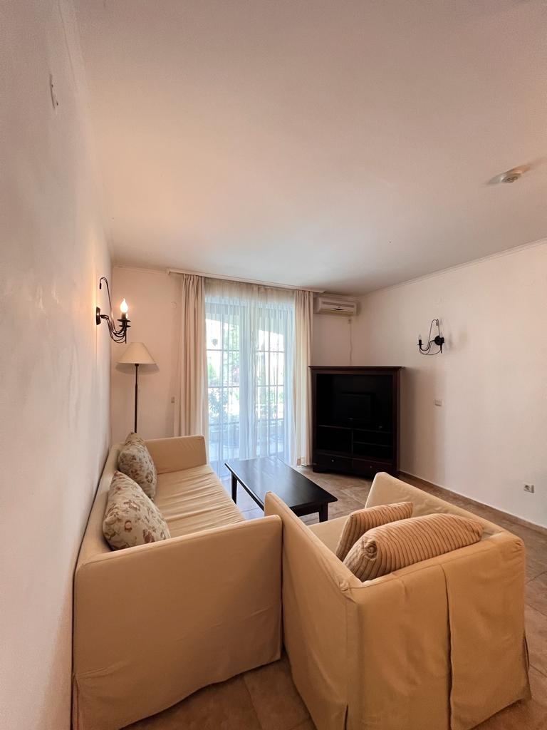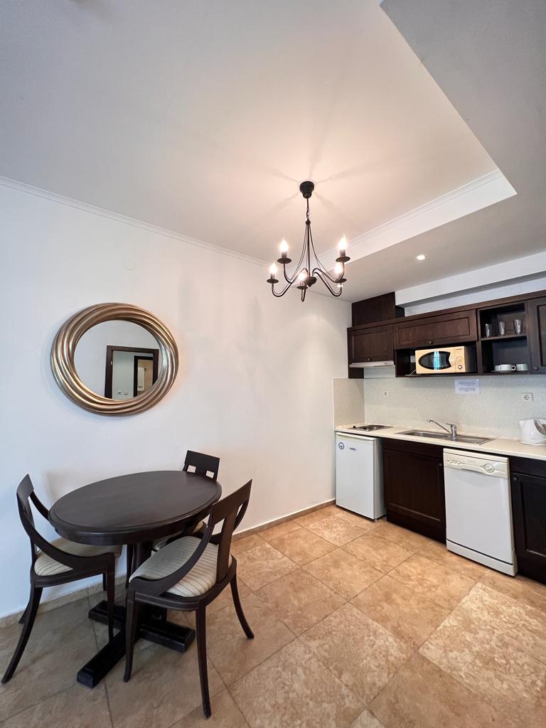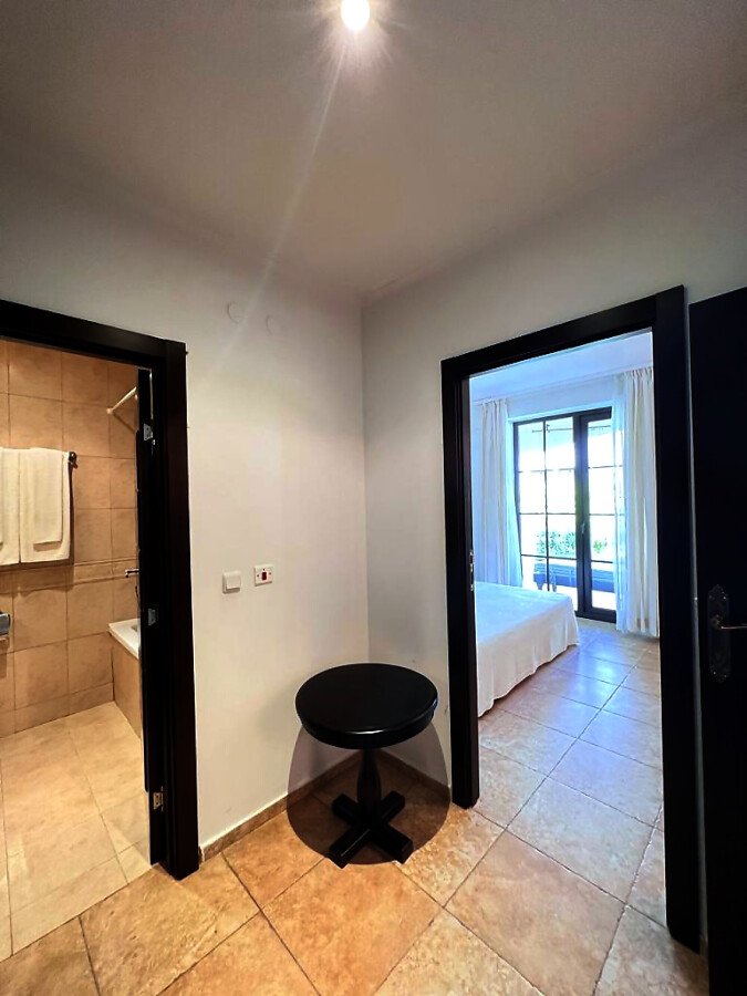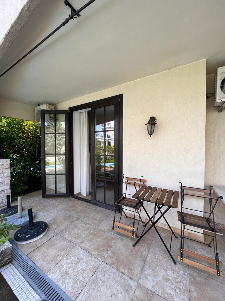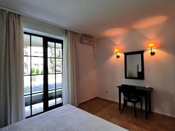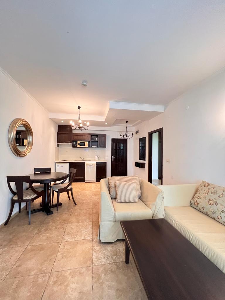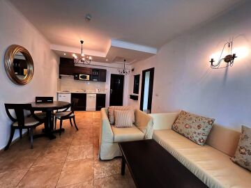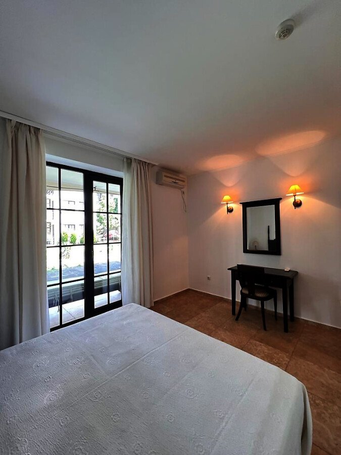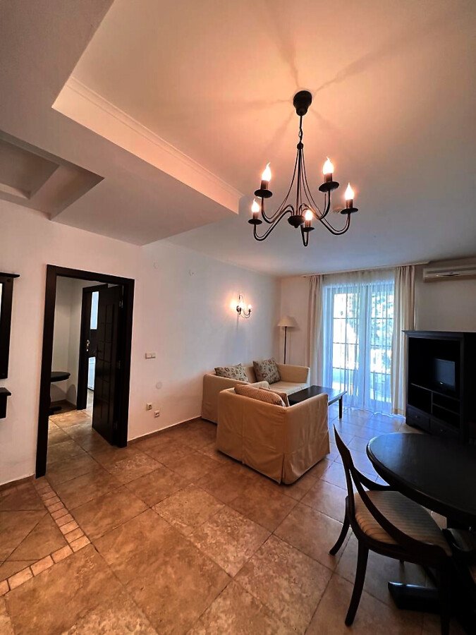 Апартаментът е много функционален, със следното разпределение – голяма всекидневна с обособена зона за хранене и кухненски бокс, спалня, баня с тоалетна и вана, самостоятелна веранда с гледка към басейна и озеленения двор.