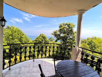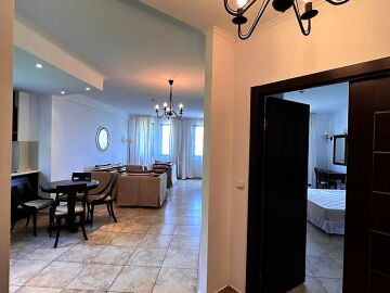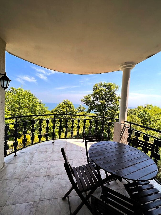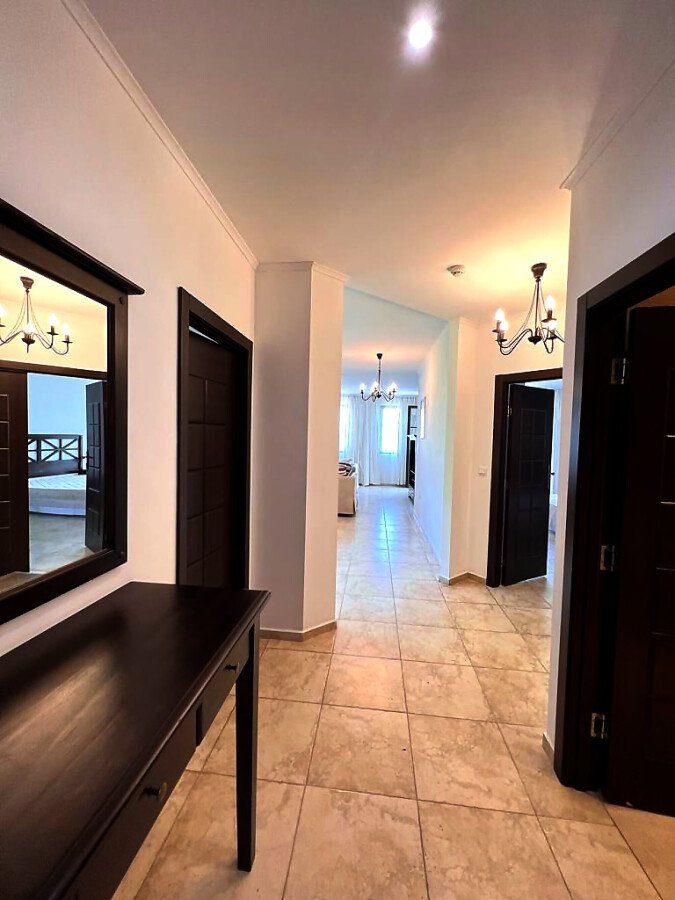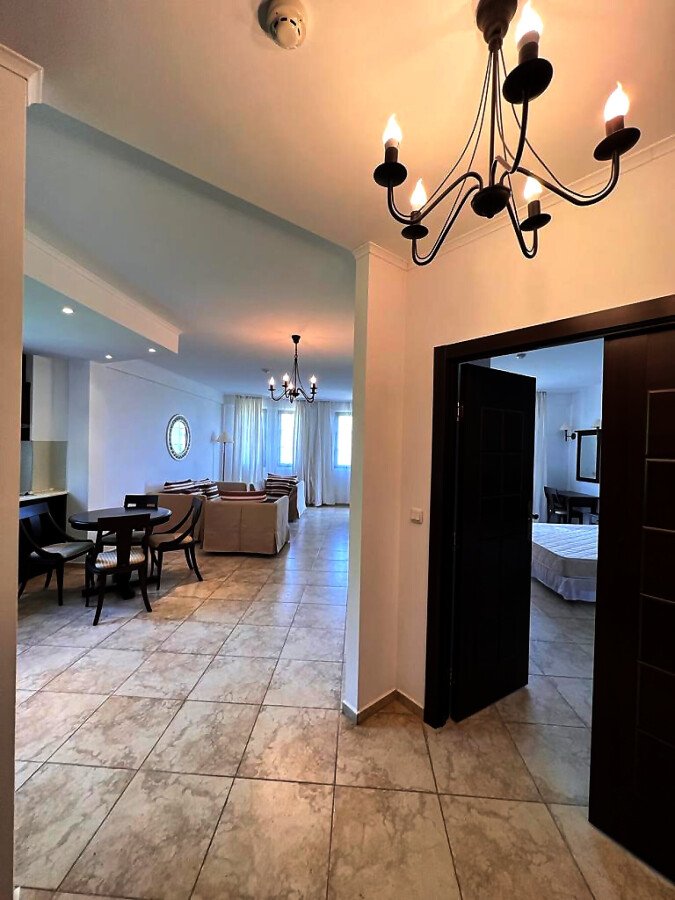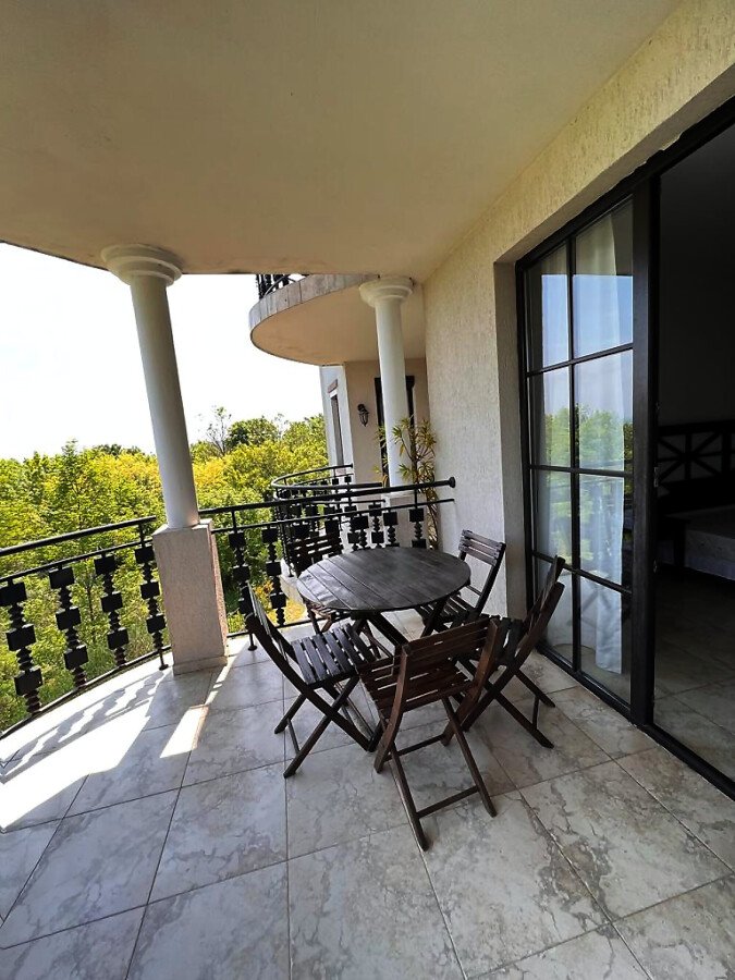 Апартаментът е много просторен и функционален, със следното разпределение – входно антре, много голяма всекидневна с кухненски бокс и зона за хранене, тераса с уникална гледка към морето, две спални, баня с тоалетна и вана, баня с тоалетна и душ кабина. Продава се в отлично състояние, добре мебелиран и оборудван, готов за нанасяне.