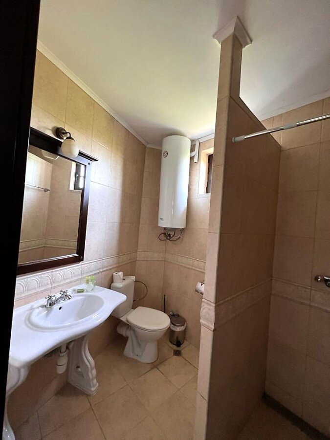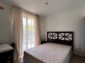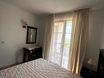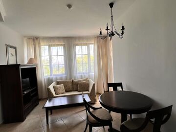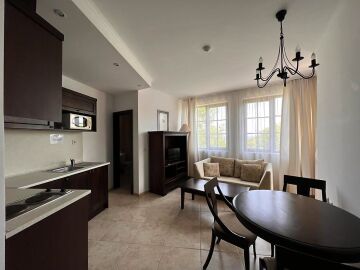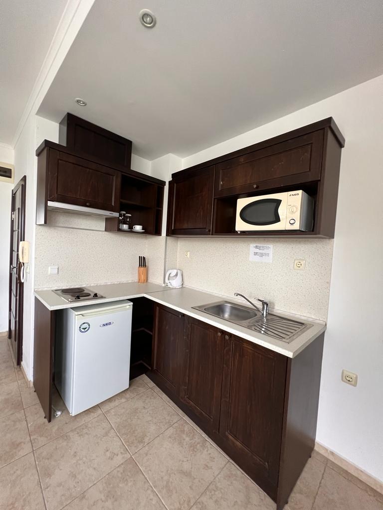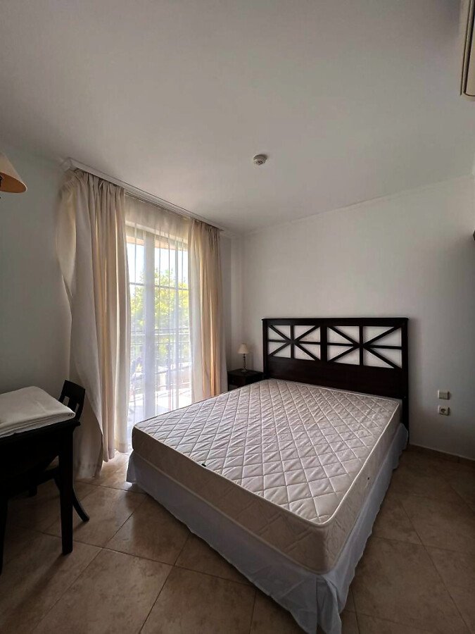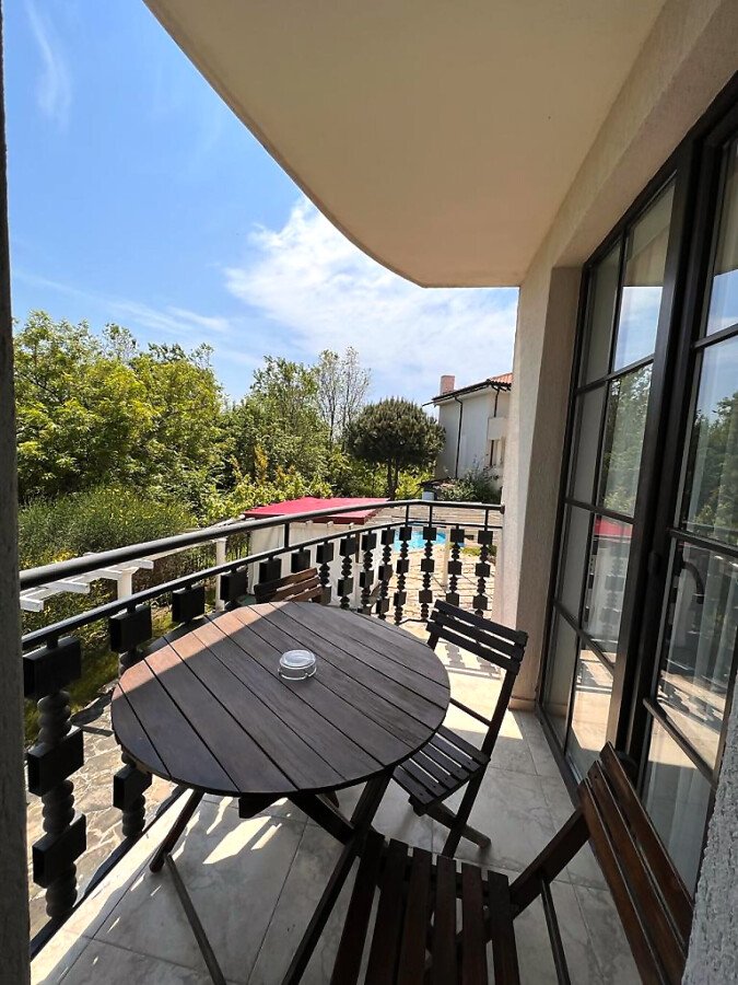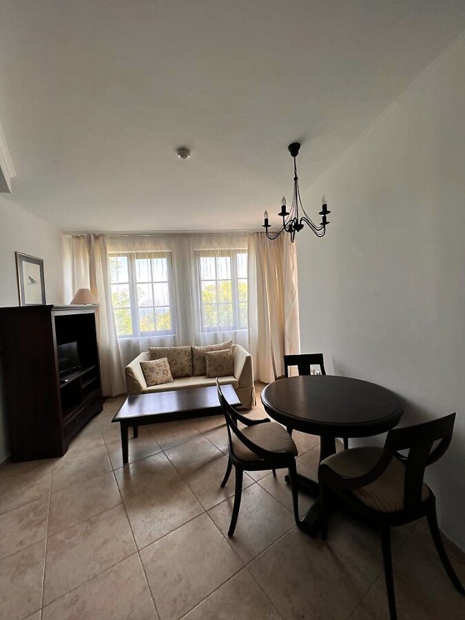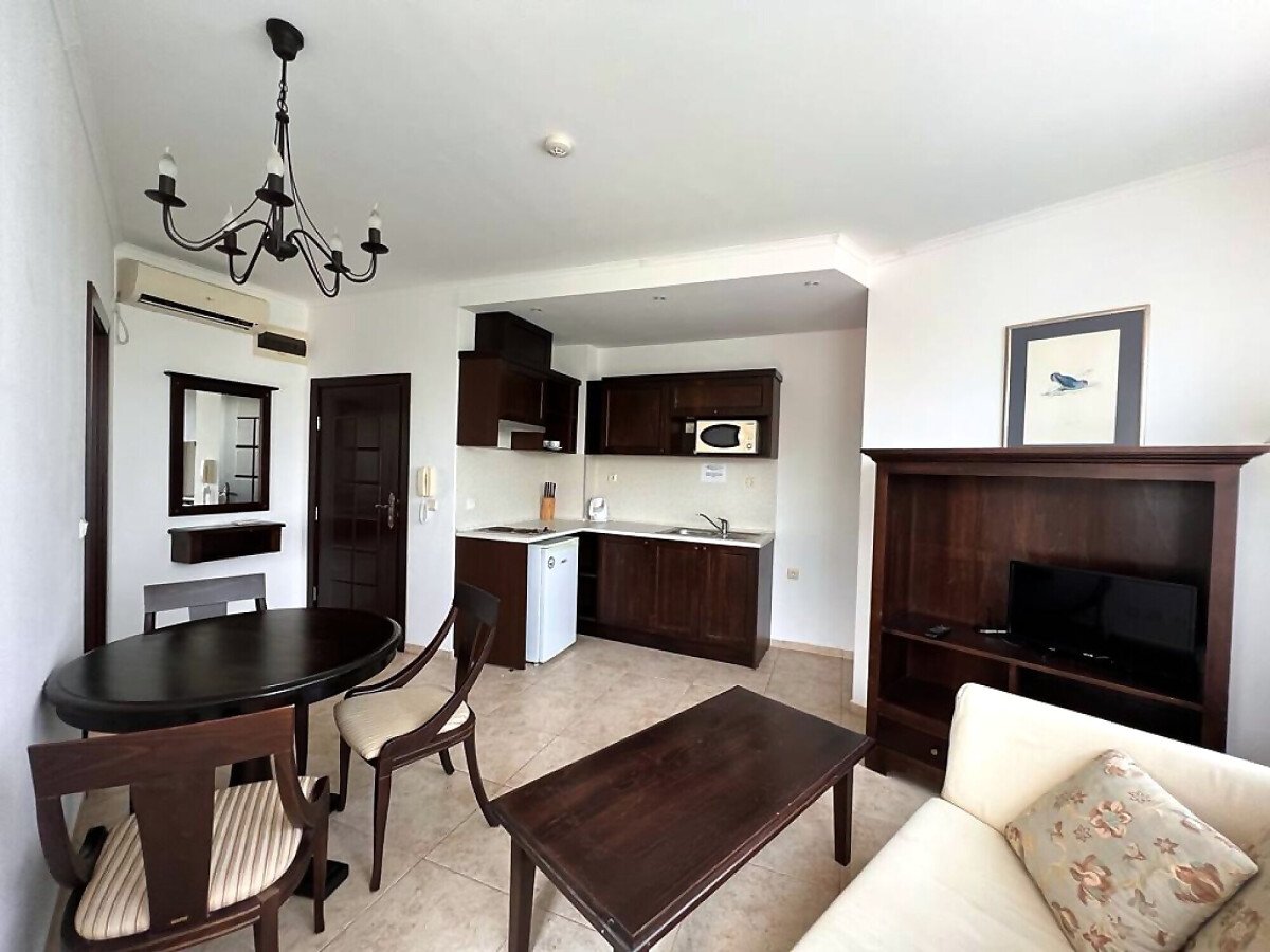 Апартаментът е малък и компактен, със следното разпределение – всекидневна с обособен кухненски бокс и кът за хранене, спалня, баня с тоалетна, тераса с красив изглед към басейна и озеленения двор. Продава се напълно обзаведен и оборудван, в отлично състояние, готов за живеене.