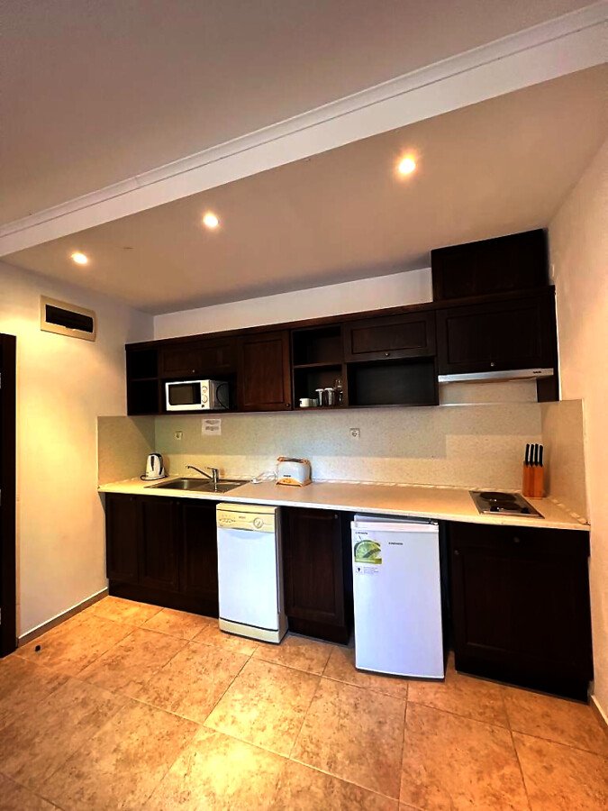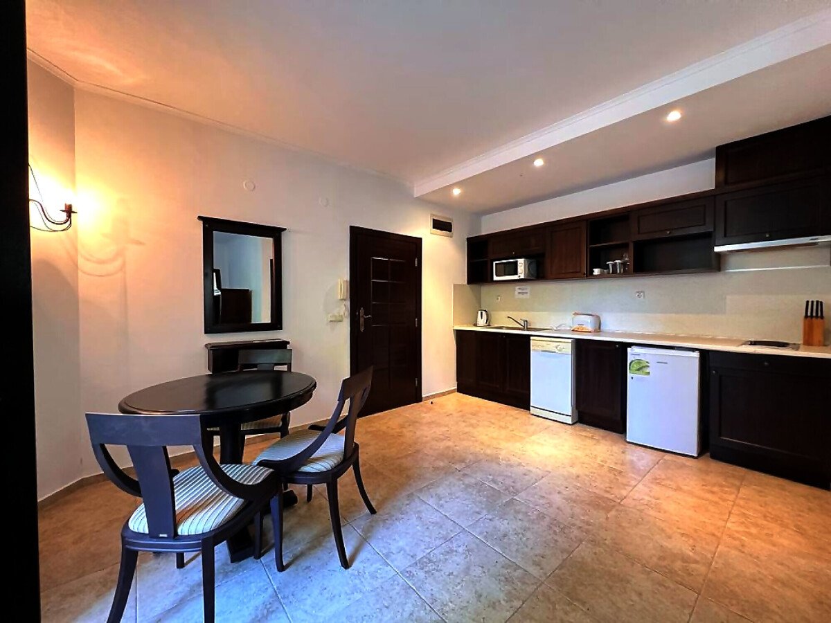 Апартаментът е много функционален, със следното разпределение – голяма всекидневна с обособена зона за хранене и кухненски бокс, спалня, баня с тоалетна, малка тераса.