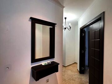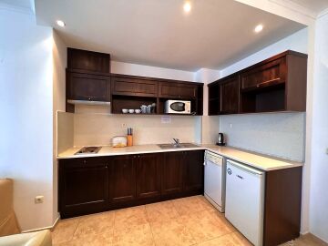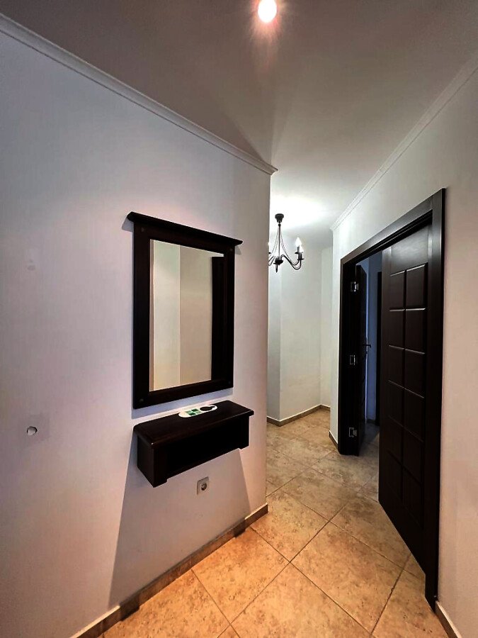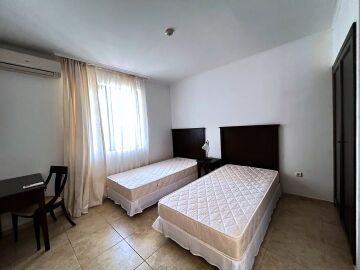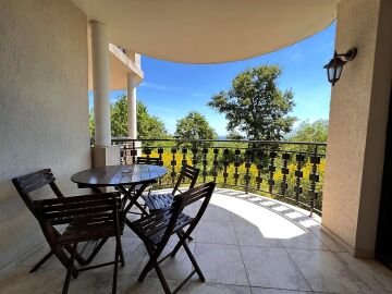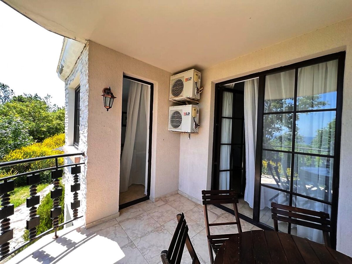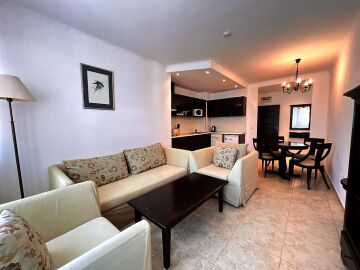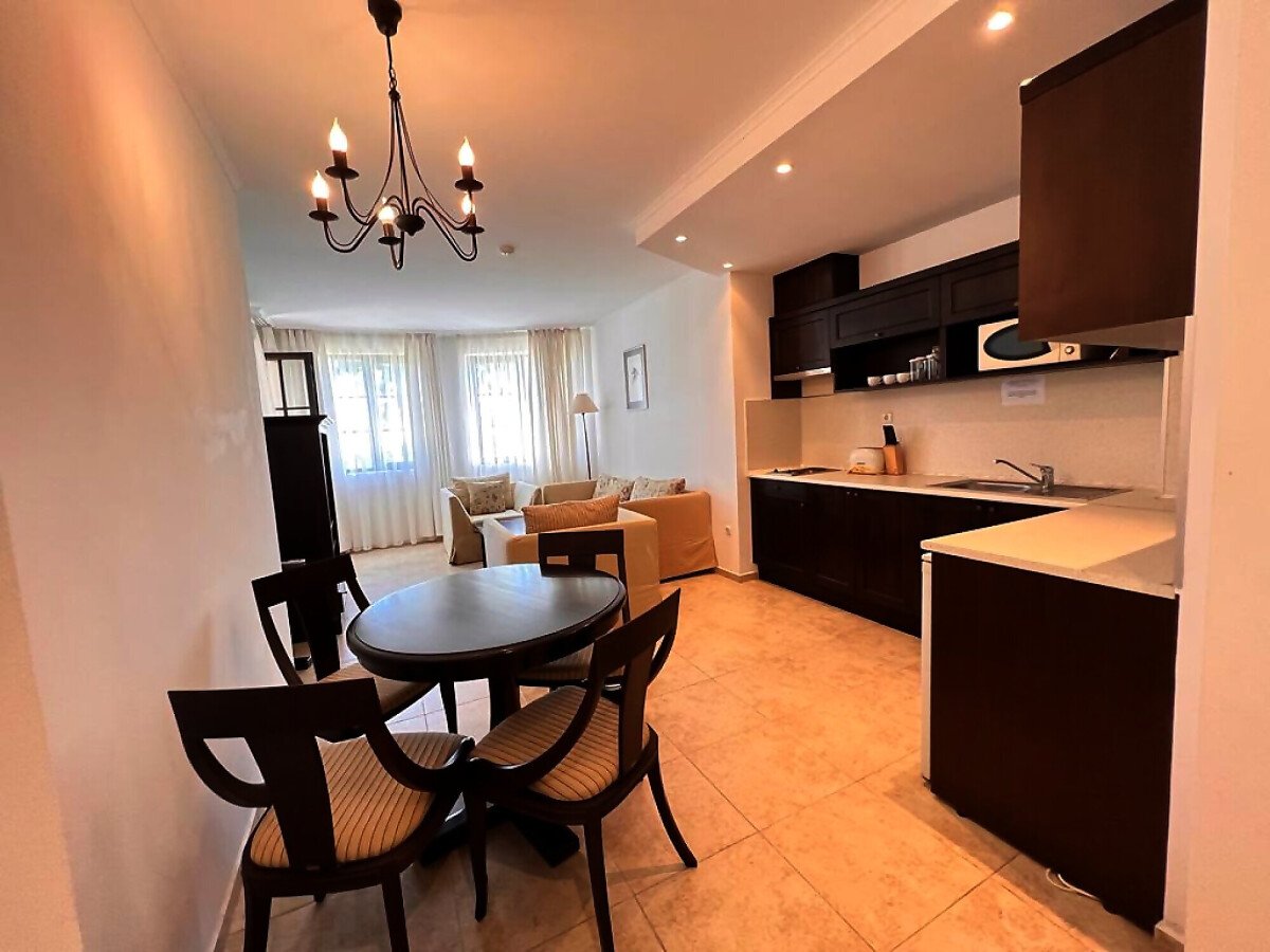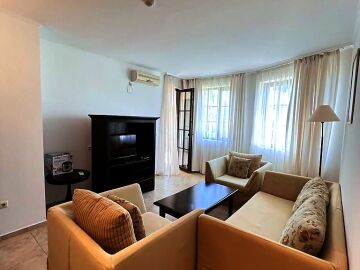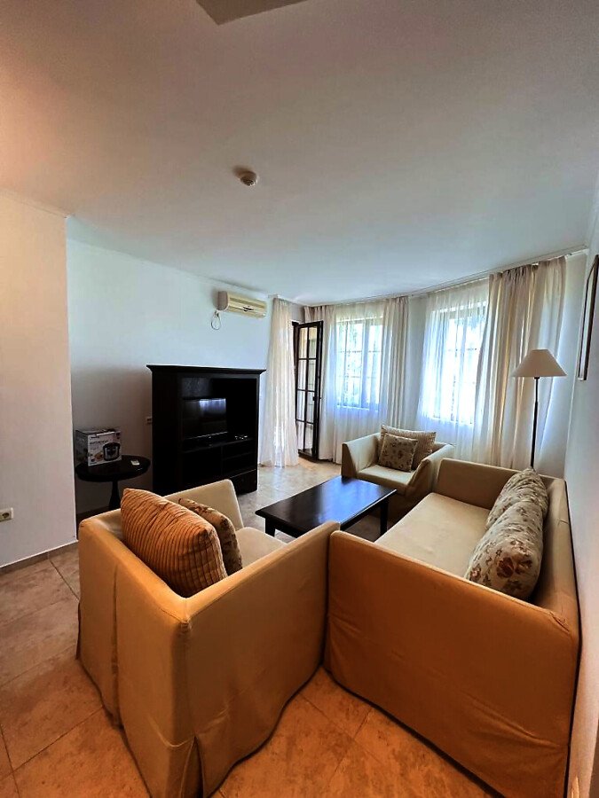 Апартаментът е напълно обзаведен и оборудван с качествени мебели и техника, готов за нанасяне. Състои се от входно антре, голяма всекидневна с кухненски бокс и зона за хранене, спалня, баня с тоалетна и душ кабина към нея, още една спалня с баня и тоалетна с вана към нея, тераса с частична гледка към морето и към озеленения двор.