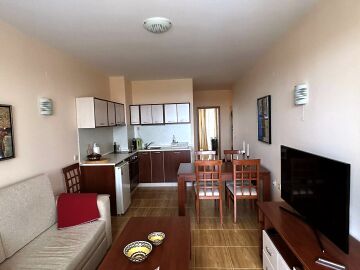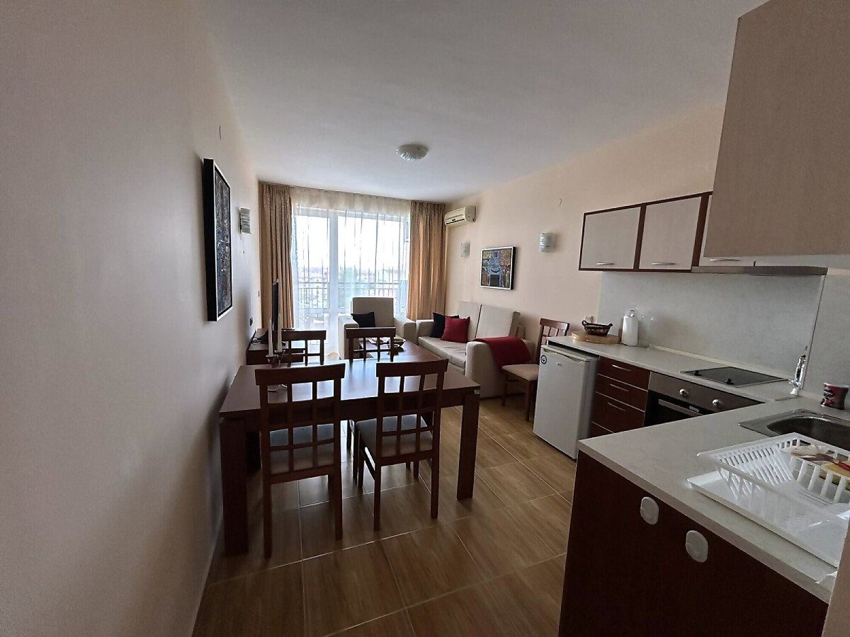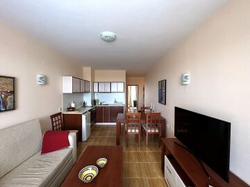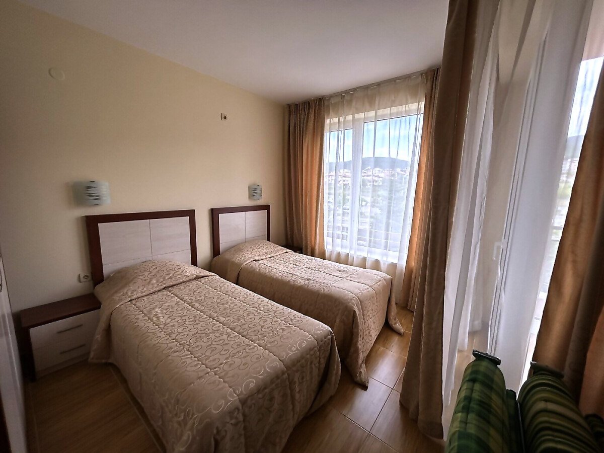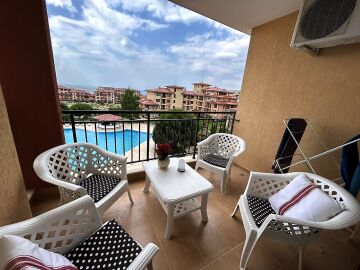 Апартаментът е готов за нанасяне, обзаведен с хубави мебели и оборудван с качествена домакинска електротехника. Жилището е много просторно и функционално, със следното разпределение – входно антре, всекидневна с обособен кът за хранене и кухненски бокс, тераса с красива гледка към басейна и морето, две спални, баня с тоалетна и вана, още една баня с тоалетна и душ кабина към спалнята, тераса с гледка към планината.
