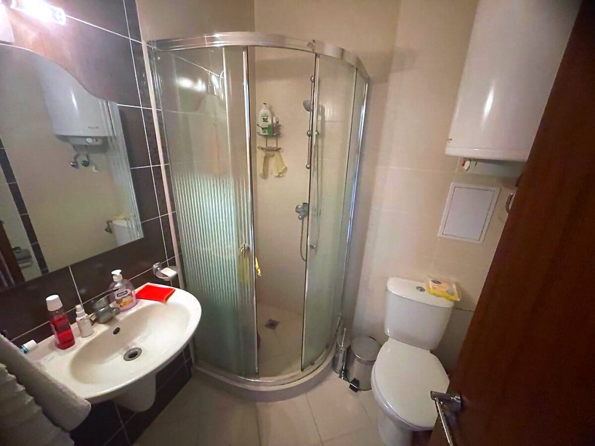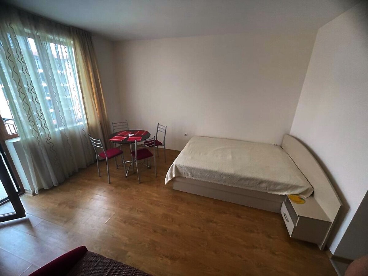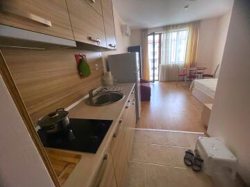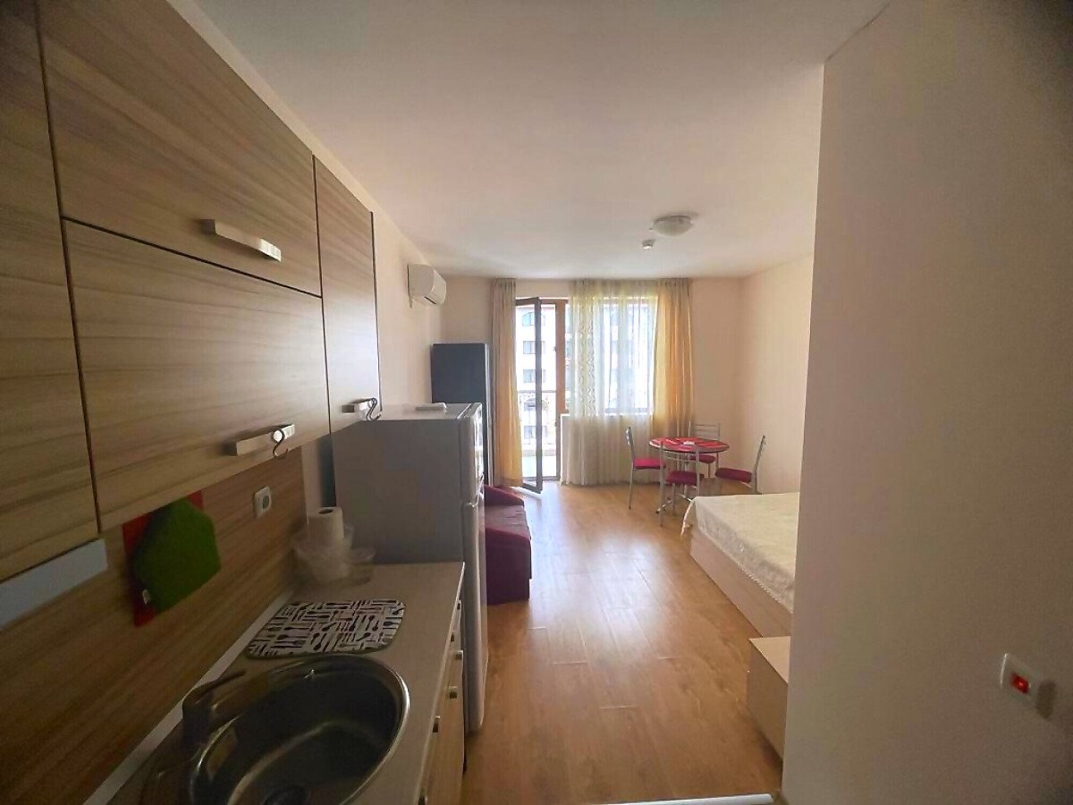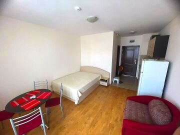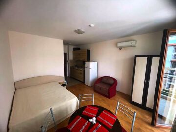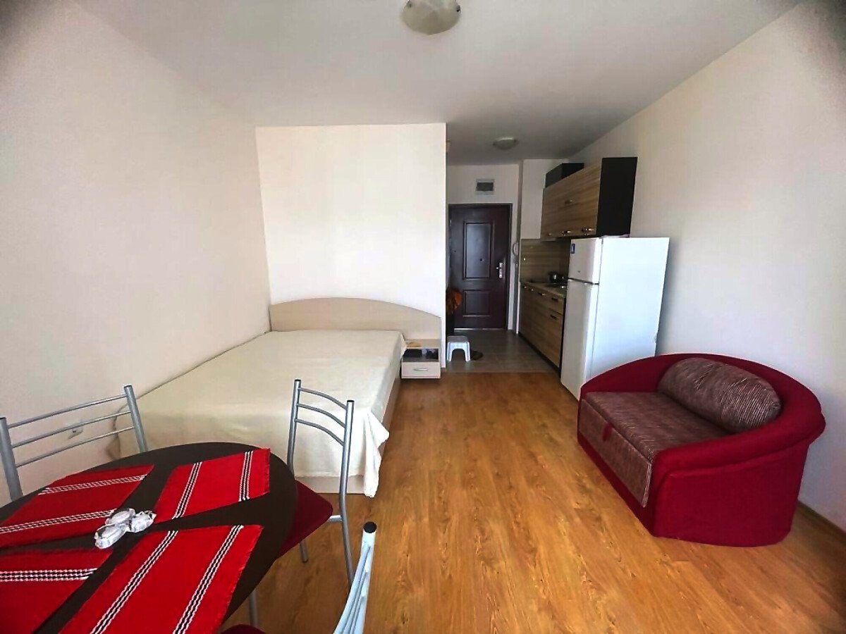 Студиото, което предлагаме, е много подходящо както за сезонно отдаване под наем и лятна почивка, така и за целогодишно живеене. Имотът е много функционален, със следното разпределение – входно антре, всекидневна с кът за хранене, обособена спалня и кухненски бокс, баня с тоалетна и душ кабина, тераса с красива гледка към басейна и вътрешната част на комплекса. Годишната такса поддръжка за този прекрасен комплекс е в размер от 9,6 евро на кв.м.