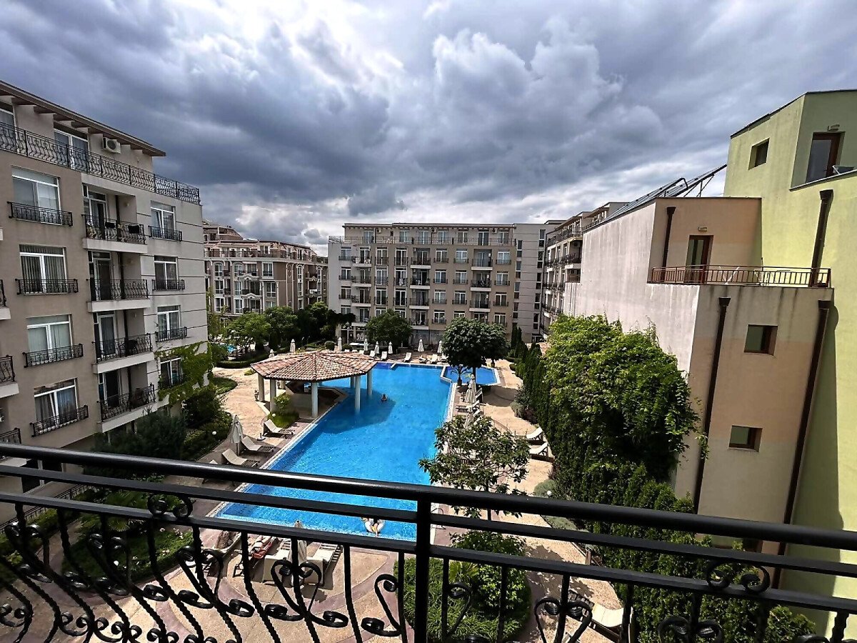 Предлагаме за продажба прекрасен двустаен апартамент с гледка към басейна в комплекс „Даун Парк“, разположен в западната, тиха част на един от най-атрактивните морски курорти – Слънчев бряг, на 10 минути пешеходно разстояние от морето и плажа.