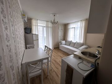 Апартаментът е стилно обзаведен, много функционален, със следното разпределение – входно антре, всекидневна с кухненски бокс, спалня, баня с тоалетна и душ кабина, тераса с красива гледка към басейна и вътрешната част на комплекса. Имотът се продава готов за живеене, обзаведен с качествени мебели, оборудван с техника, в много добро състояние.