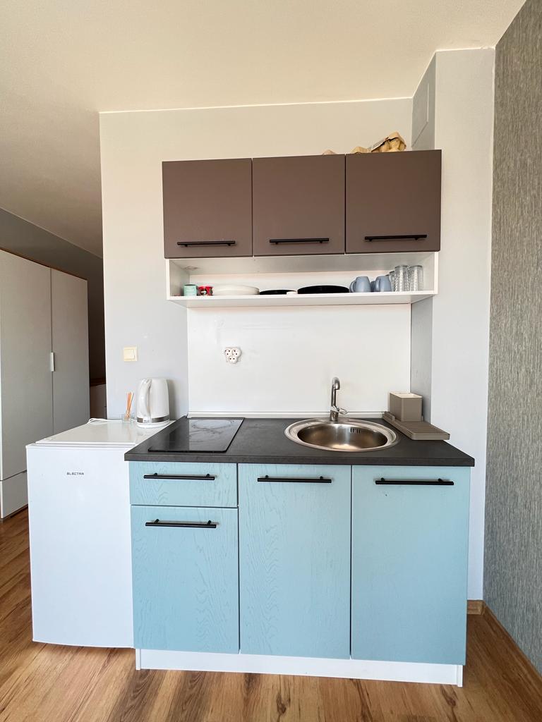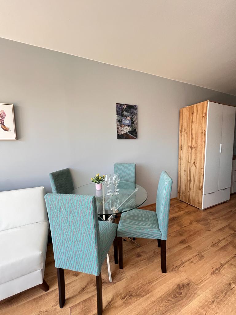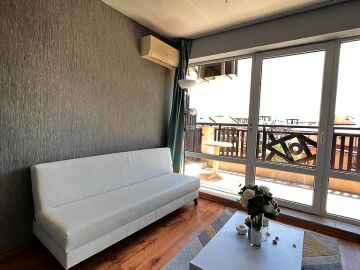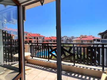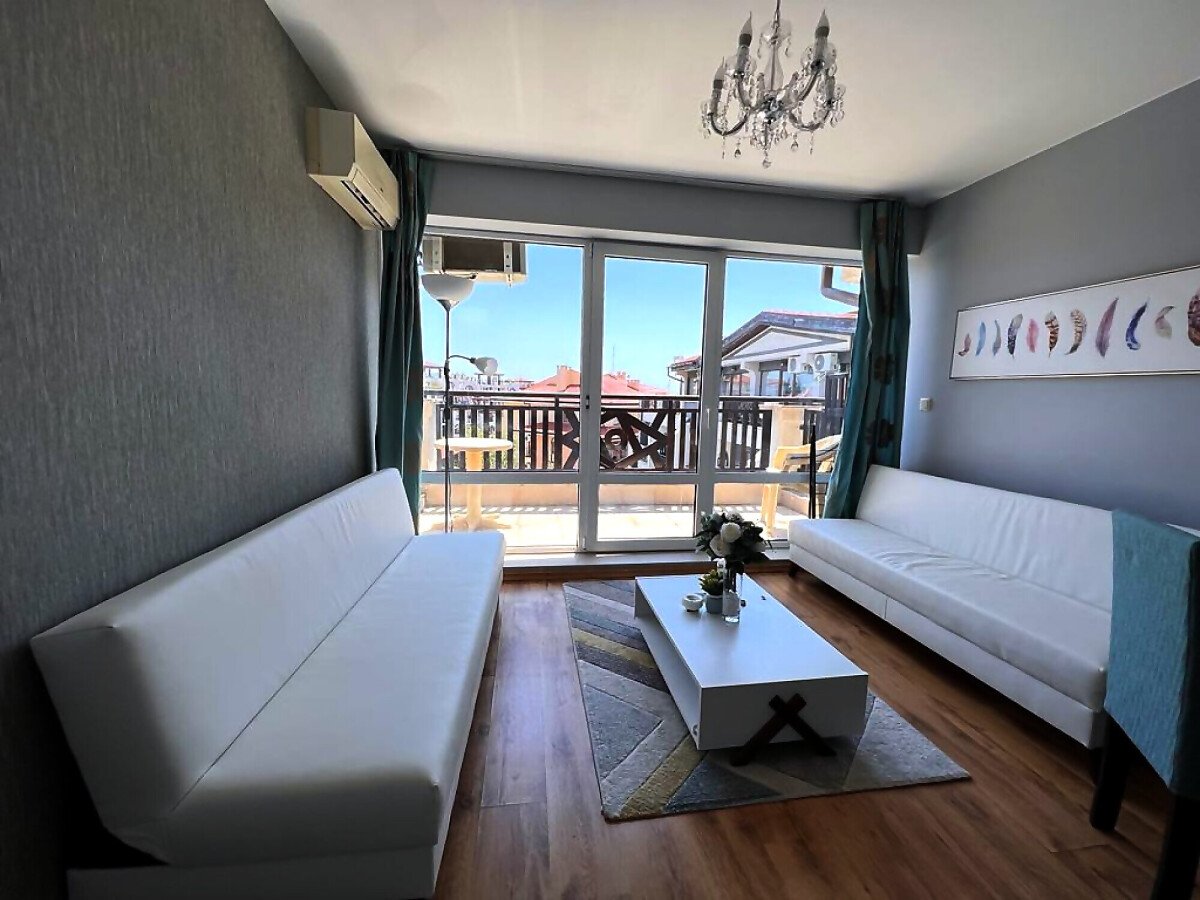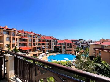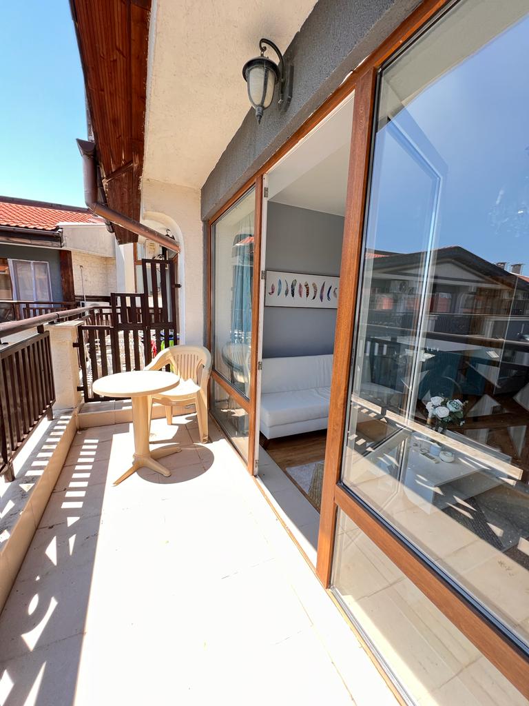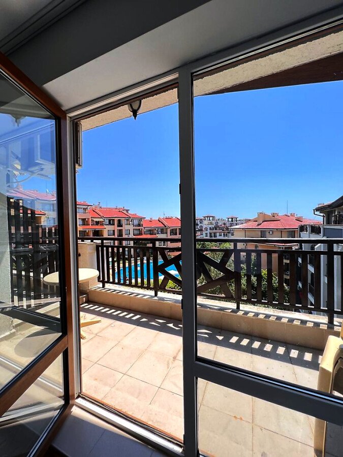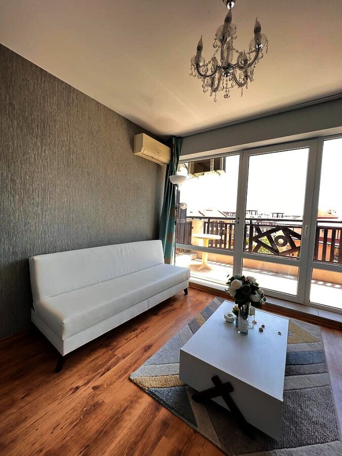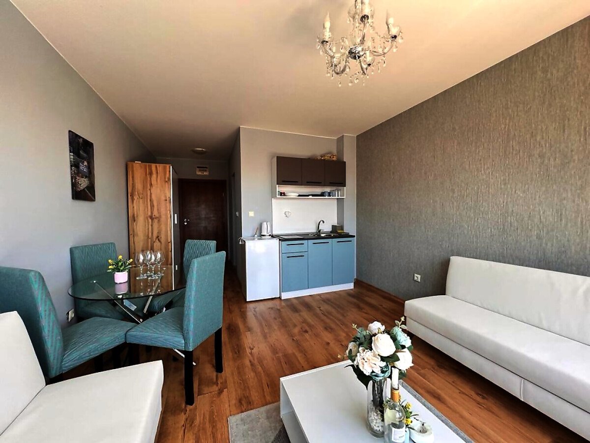 Жилището е функционално, със следното разпределение – входно антре, всекидневна с кухненски бокс и обособен кът за хранене, баня с тоалетна и душ кабина, тераса с прекрасна гледка към басейна и вътрешната територия на комплекса.