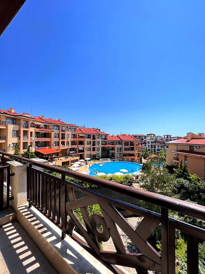 Предлагаме за продажба прекрасно студио с гледка към басейна в комплекс „Роял Палм“, разположен на 300 метра пешеходно разстояние от плажната ивица и морето в елитния курорт Свети Влас. Комплексът впечатлява с модерна архитектура и стилно изпълнение. На разположение на собствениците и гостите има открит плувен басейн с детска секция, красиво озеленена градина, частен паркинг, детска площадка, зони за релакс и слънчеви бани.
