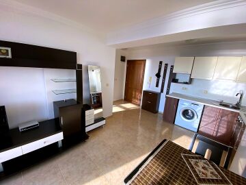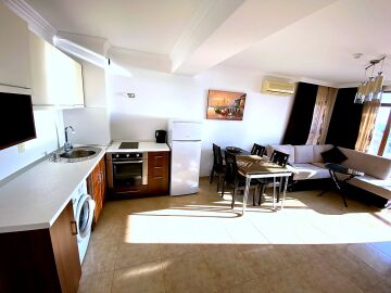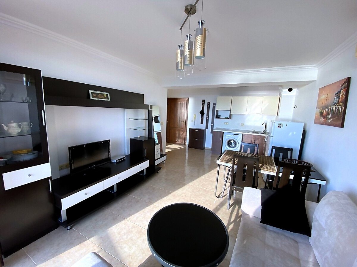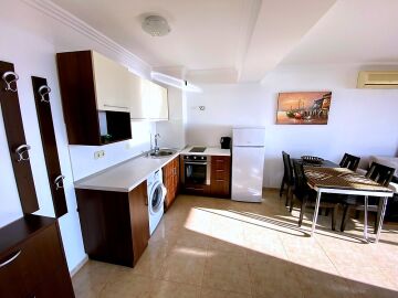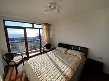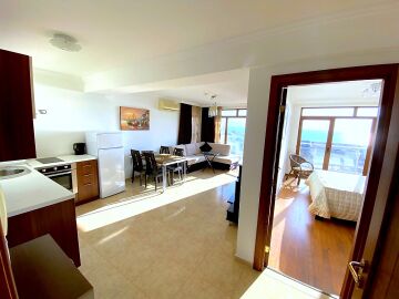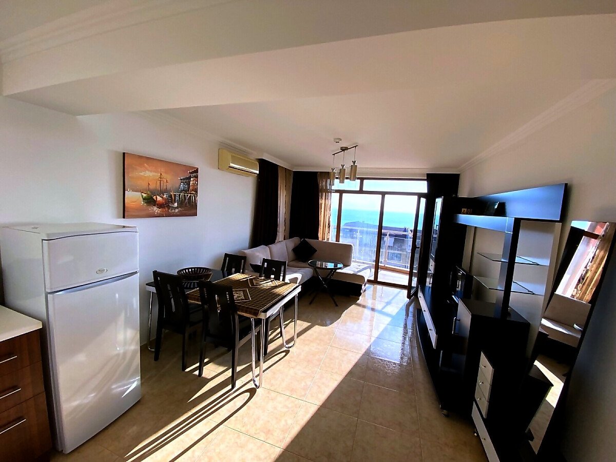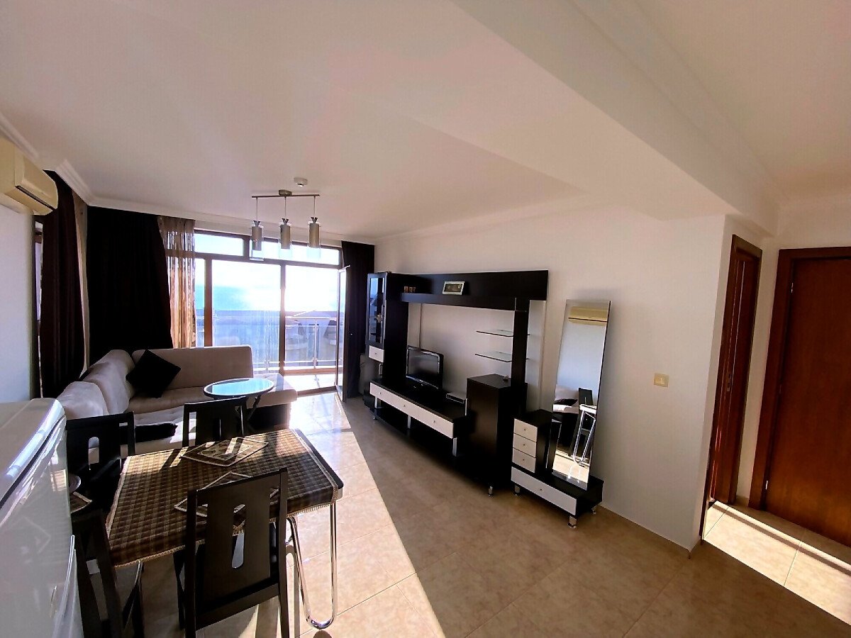 Апартаментът е просторен и функционален, със следното разпределение – всекидневна с обособена зона за хранене и кухня, баня с тоалетна и душ кабина, спалня, тераса с красива панорамна гледка към морето и басейна. Продава се в отлично състояние, добре мебелиран и оборудван, готов за живеене.