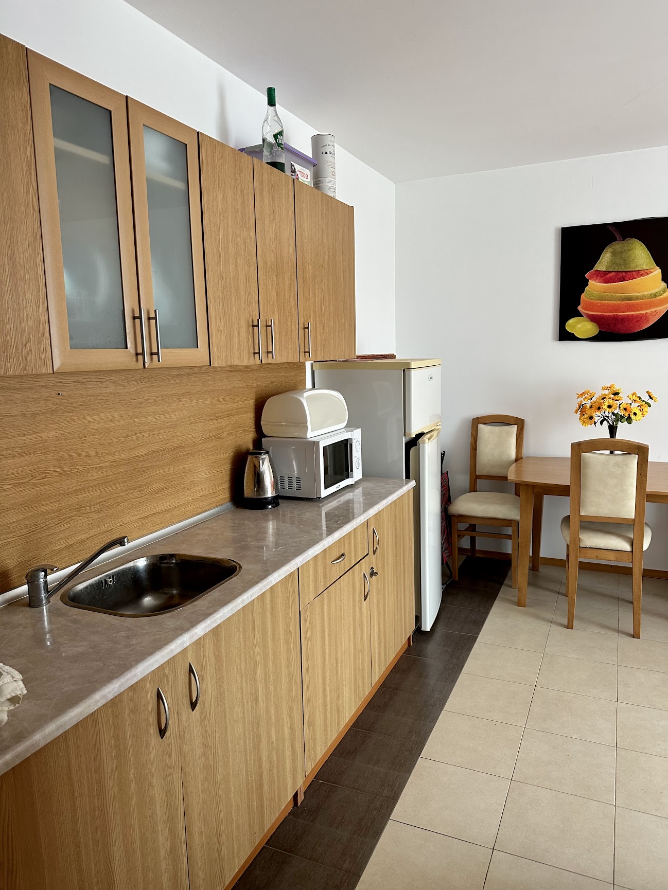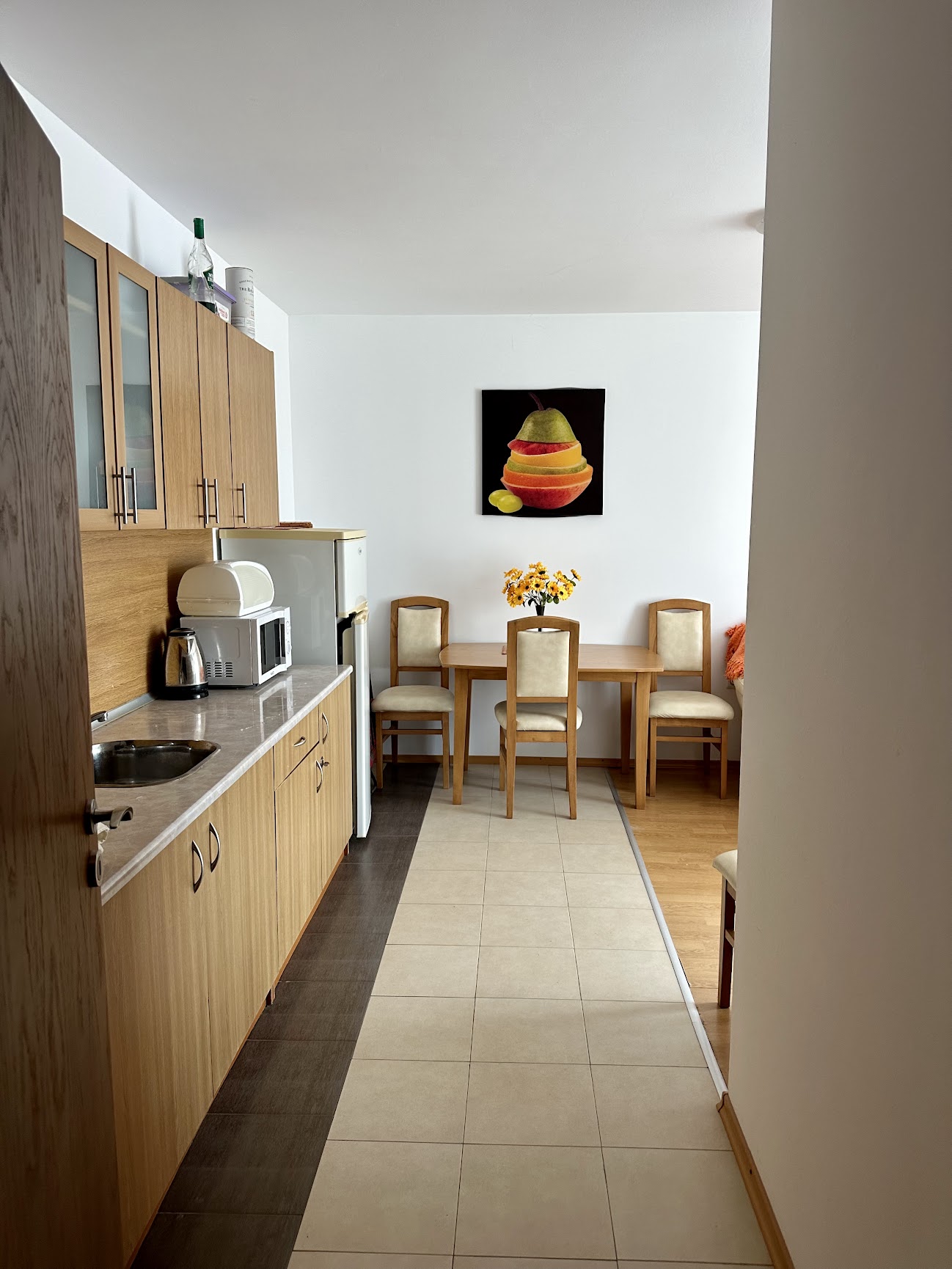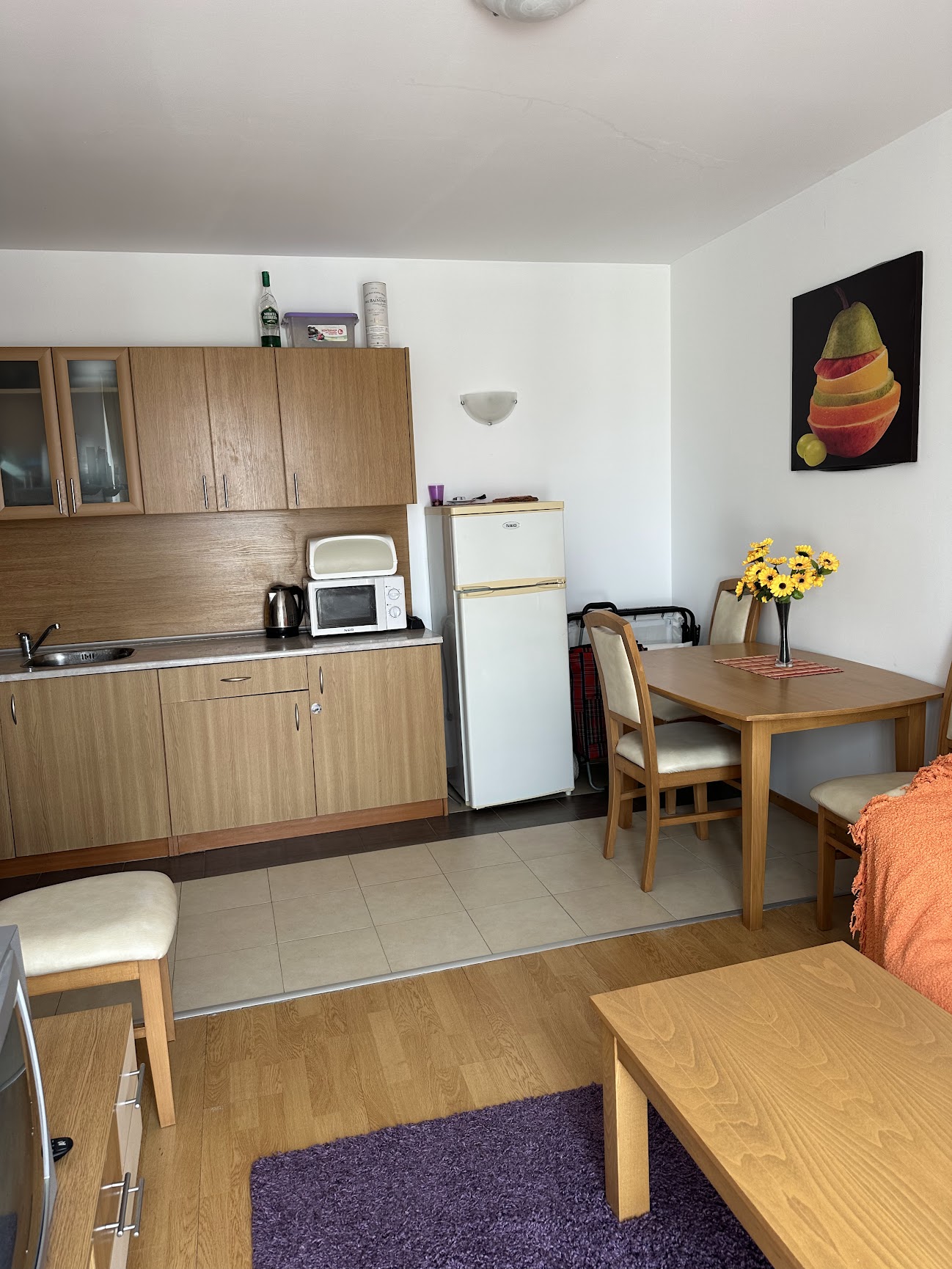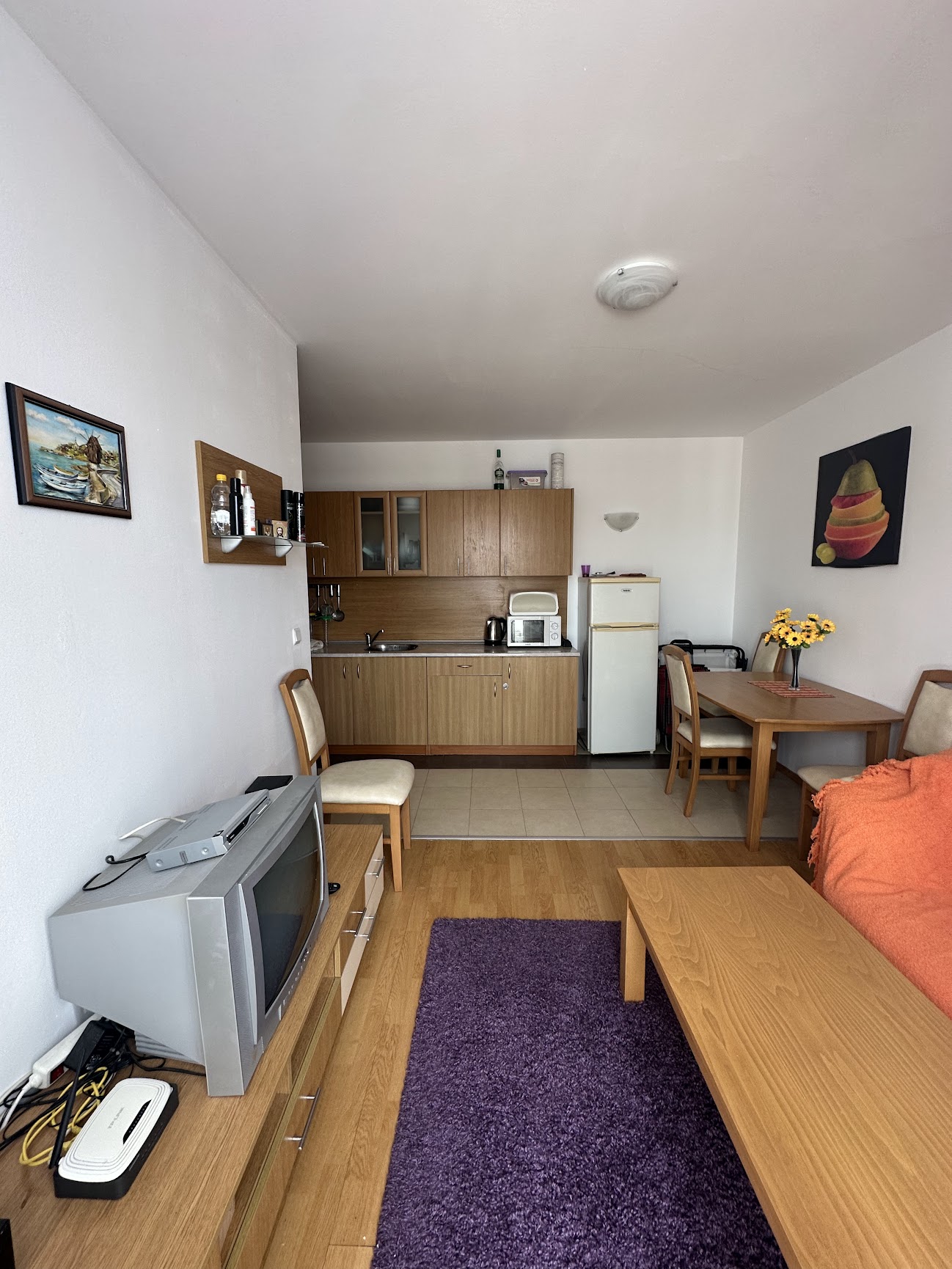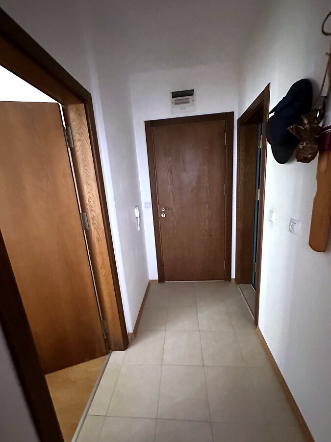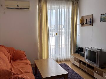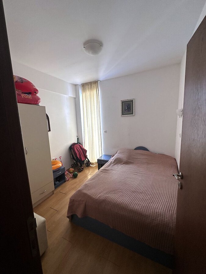 Апартаментът се продава обзаведен и оборудван, със следното разпределение – входно антре, всекидневна с кухненски бокс, спалня, баня с тоалетна, просторна тераса с красива гледка към вътрешната част на комплекса и към басейна.