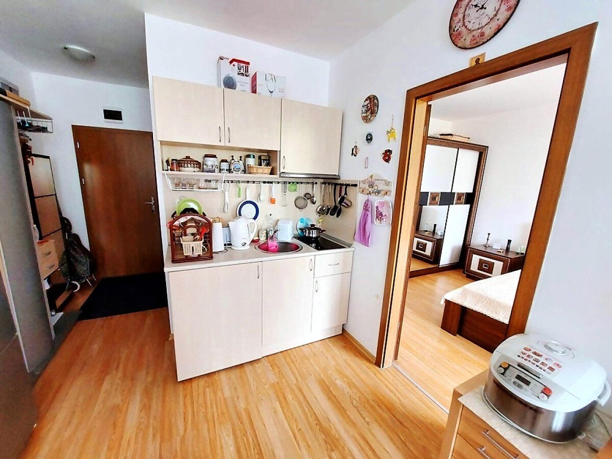 Апартаментът е малък, но функционален, разположен на пети, последен етаж от сградата. Състои се от входно антре, всекидневна със зона за хранене и кухненски бокс, спалня, баня с тоалетна и вана, тераса.