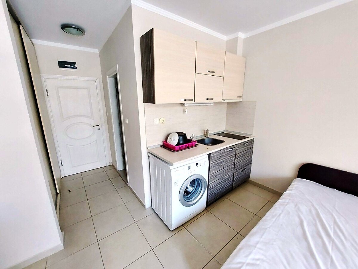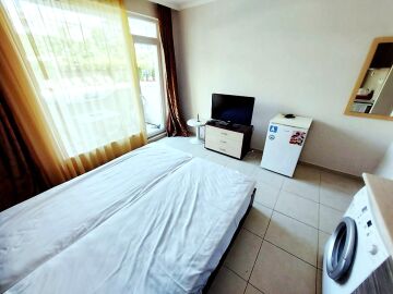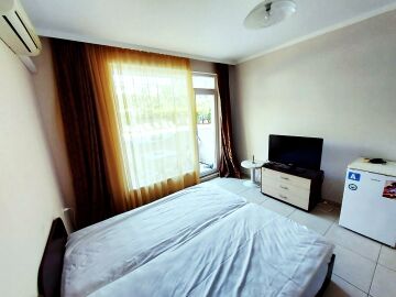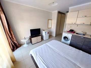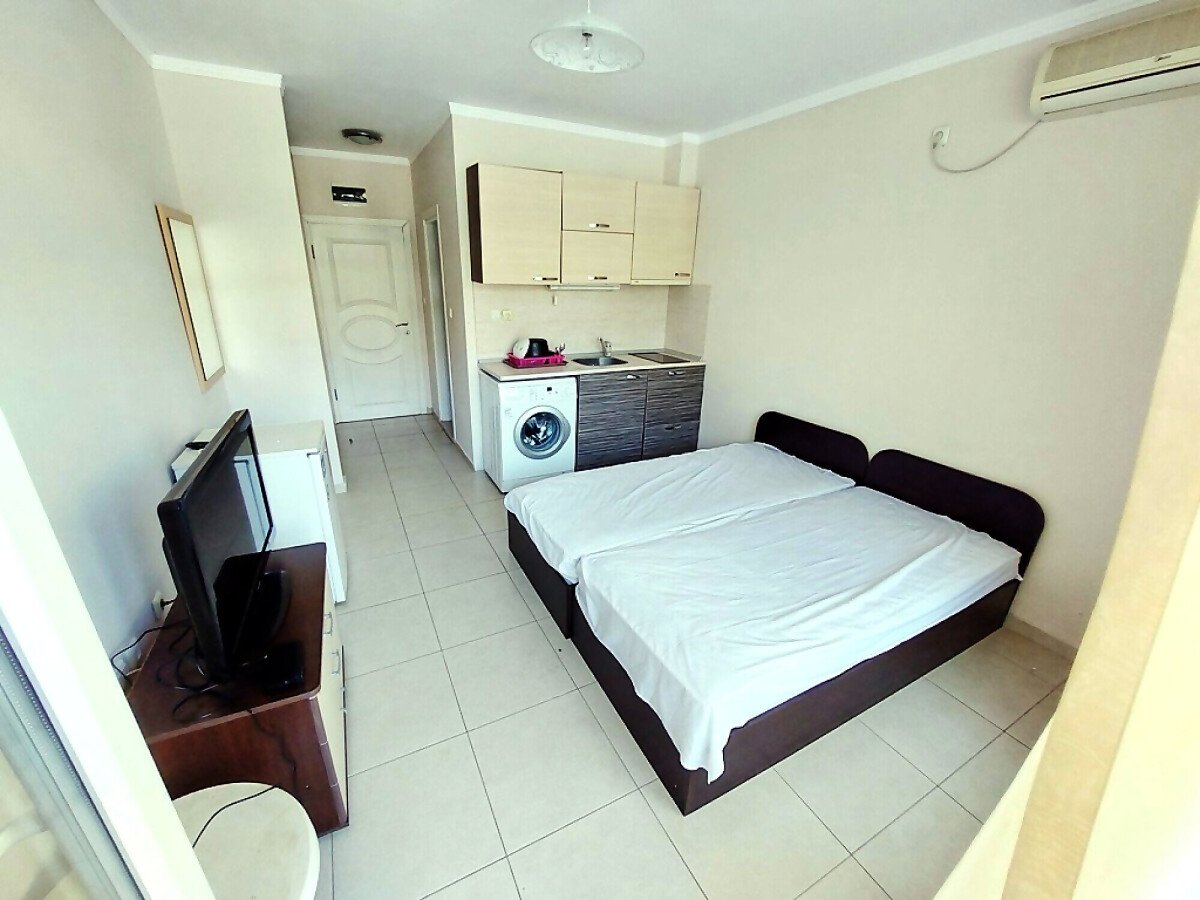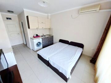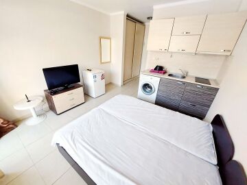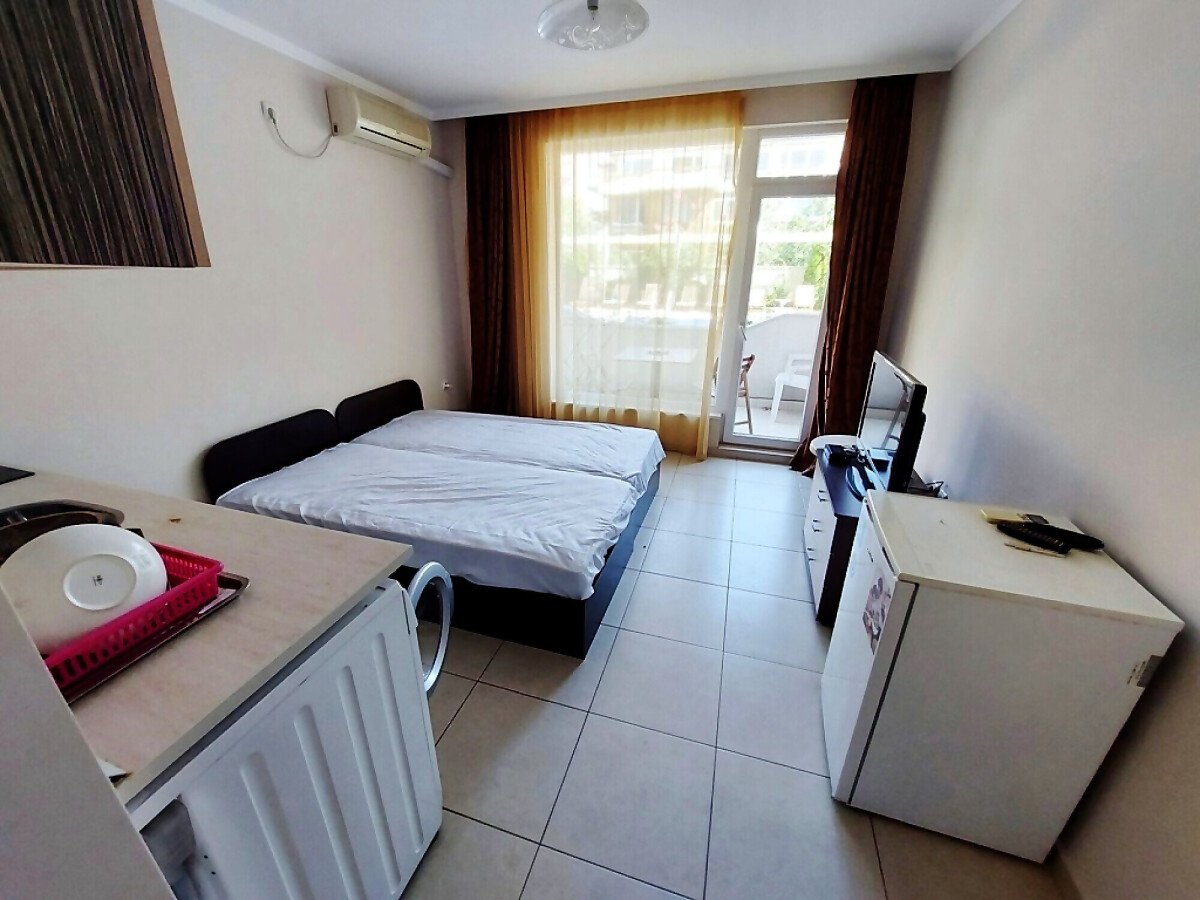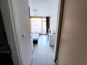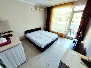Студиото е функционално и светло, със следното разпределение – входно антре, всекидневна с обособена спалня и кухненски бокс, баня с тоалетна, тераса с прекрасна гледка към басейна и вътрешната част на комплекса.