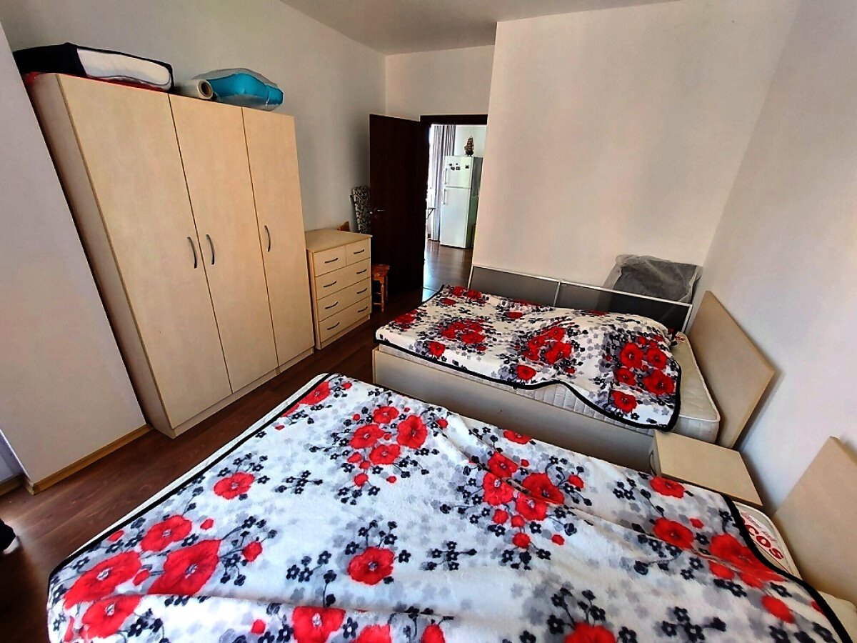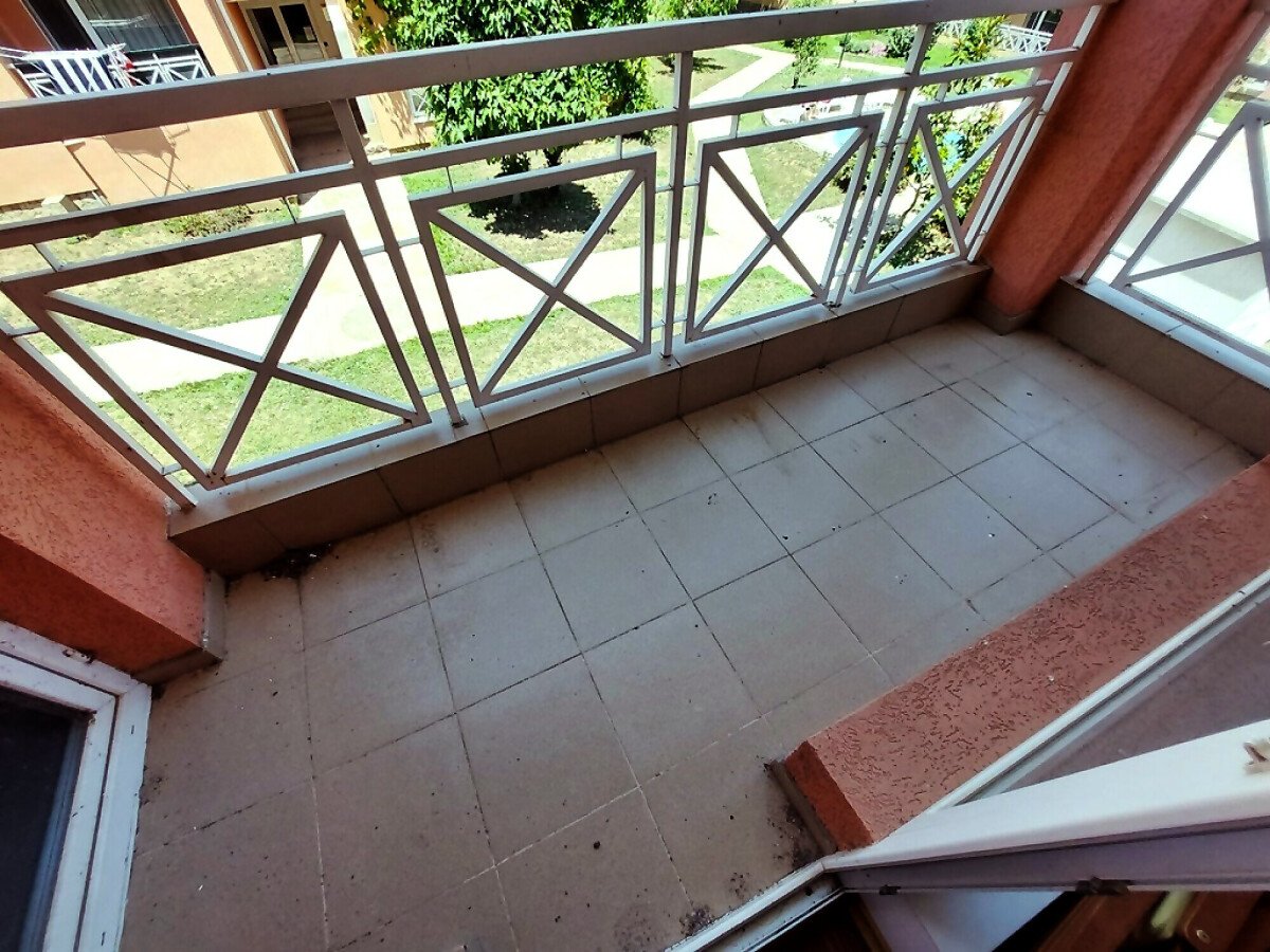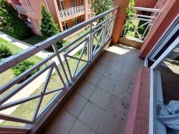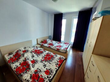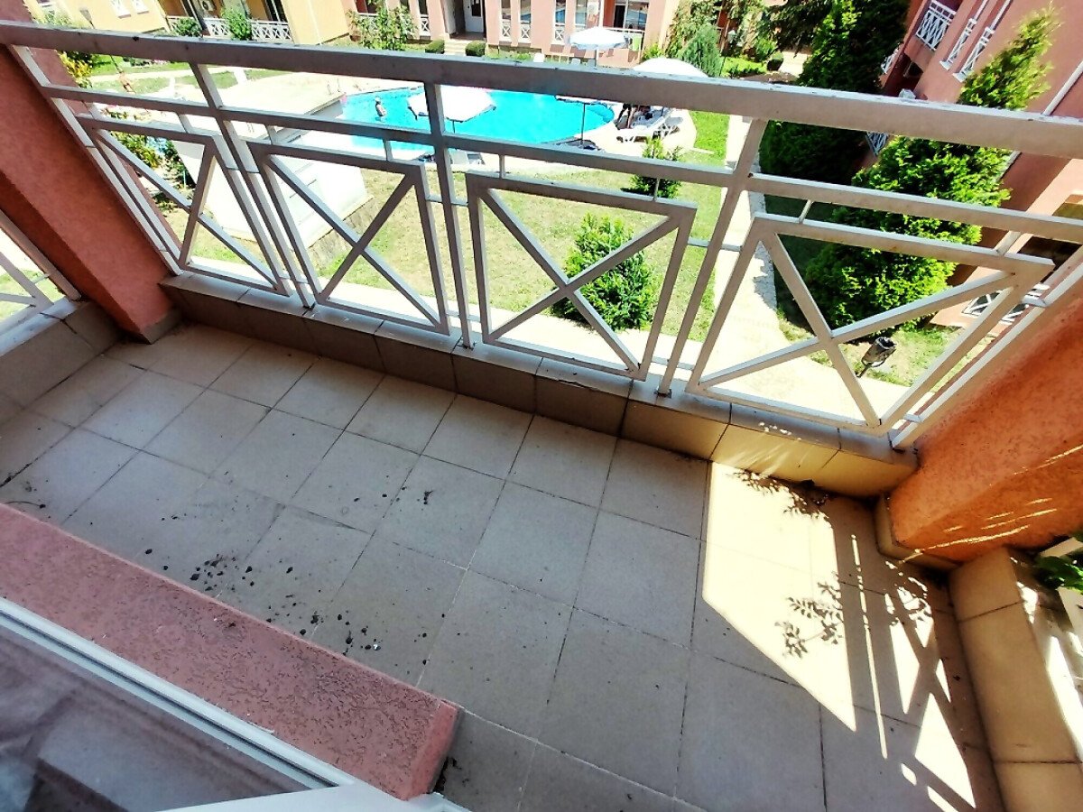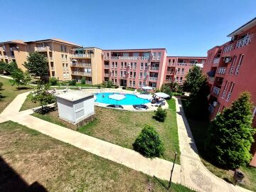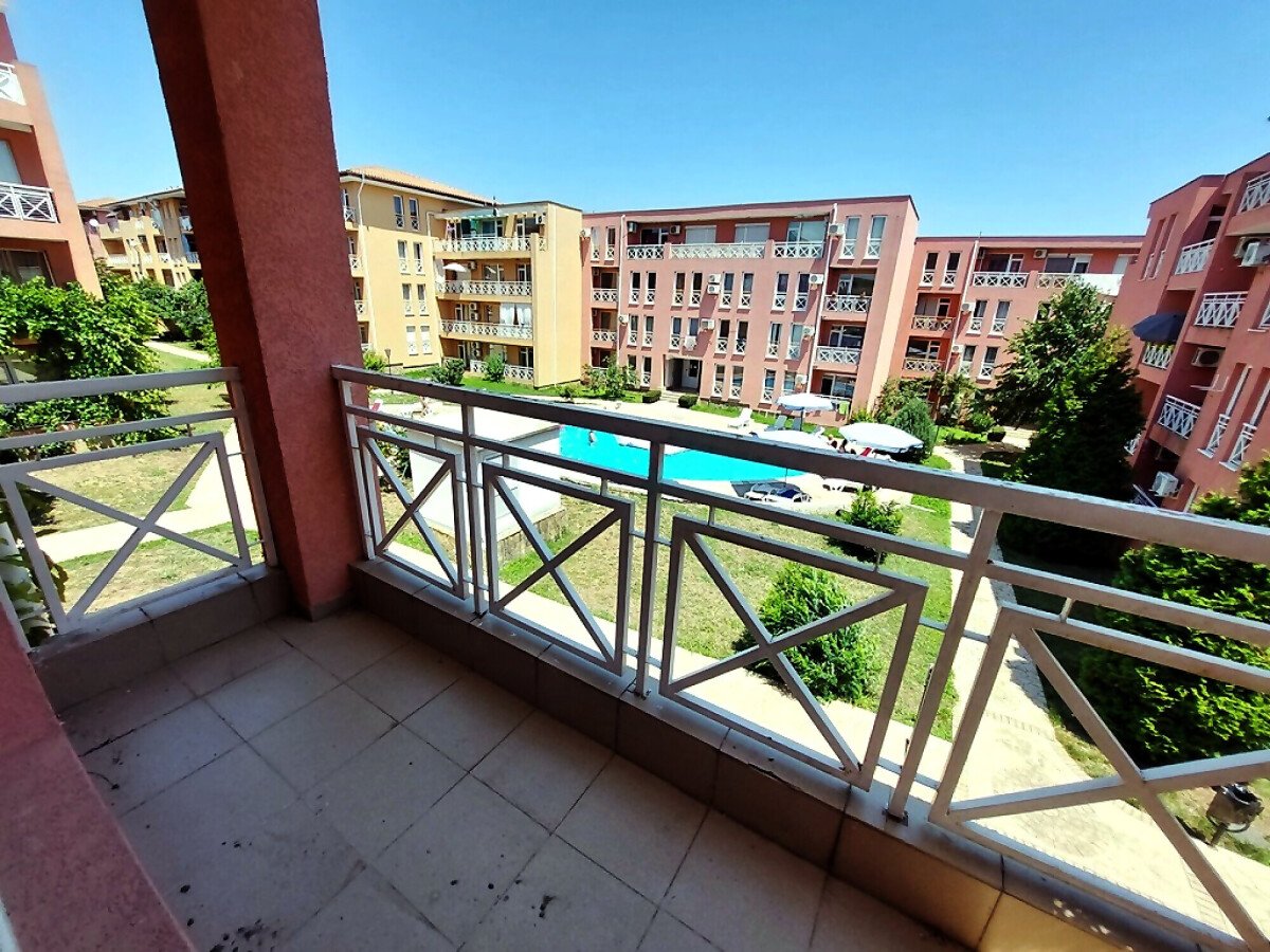 Ние Ви предлагаме страхотен тристаен апартамент с гледка към басейна в този комплекс. Жилището е разположено на втори етаж и има следното разпределение – всекидневна с кухненски бокс и зона за хранене, две спални, баня с тоалетна, две тераси. Едната от терасите разкрива невероятна гледка към басейна, а другата – към озеленения двор на комплекса.