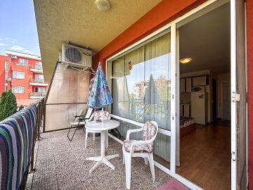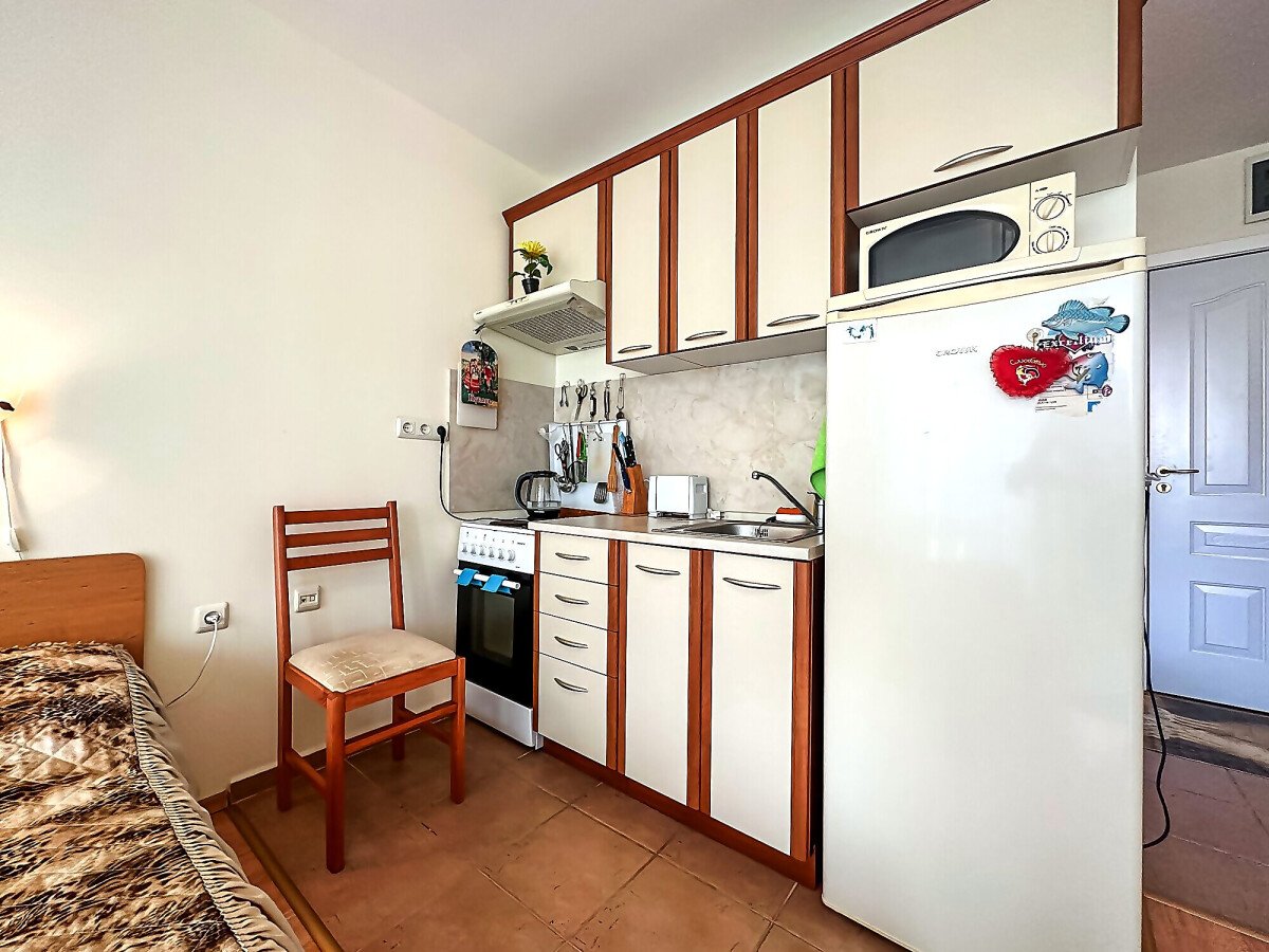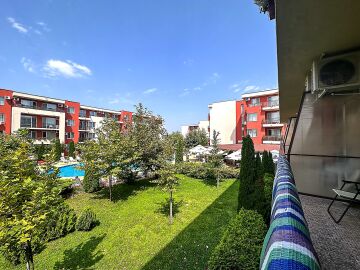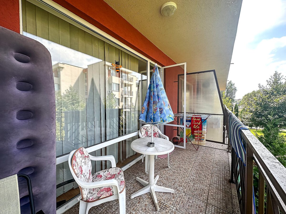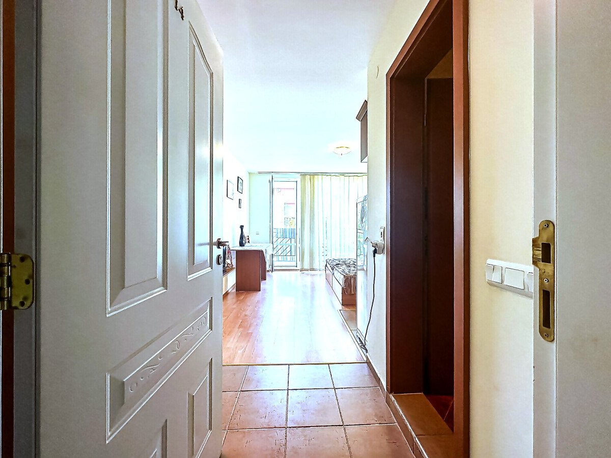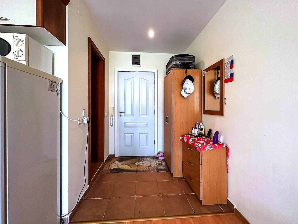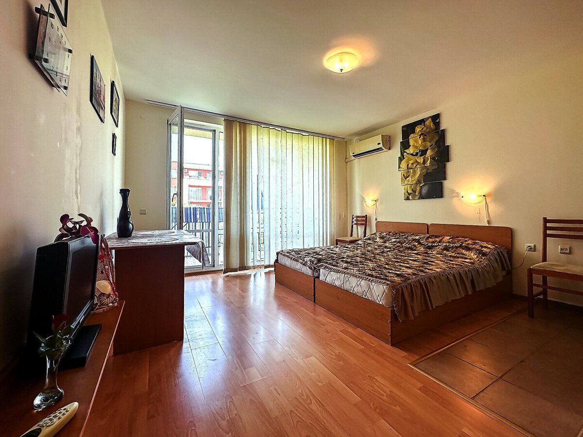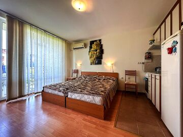Студиото е разположено на втори етаж и има следното разпределение – входно антре, всекидневна с кухненски бокс и обособена спалня, баня с тоалетна и душ кабина, просторна тераса с гледка към озеленения двор и към басейна. Жилището е оборудвано с домакинска техника, напълно обзаведено с качествени мебели, готово за живеене.