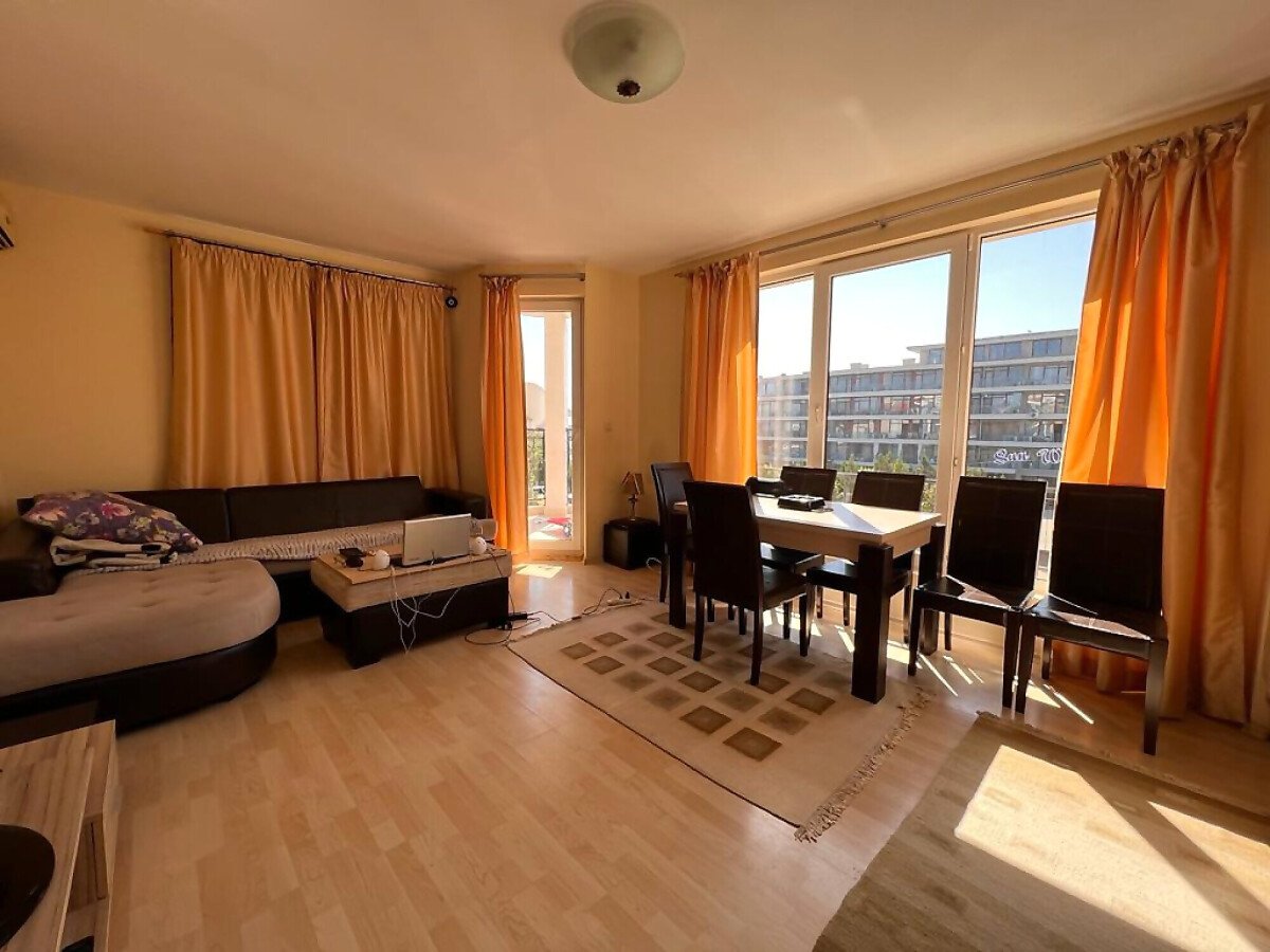 Жилището е разположено на втори етаж и има следното разпределение – входно антре, просторна всекидневна с обособена зона за хранене и кухненски бокс, баня с тоалетна и душ кабина, спалня, тераса с красива гледка към басейна и вътрешната част на комплекса, както и частична гледка към морето. Апартаментът се продава в много добро състояние, обзаведен с хубави мебели, оборудван с качествена домакинска техника, готов за живеене.