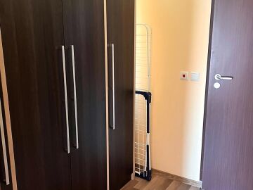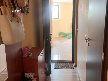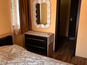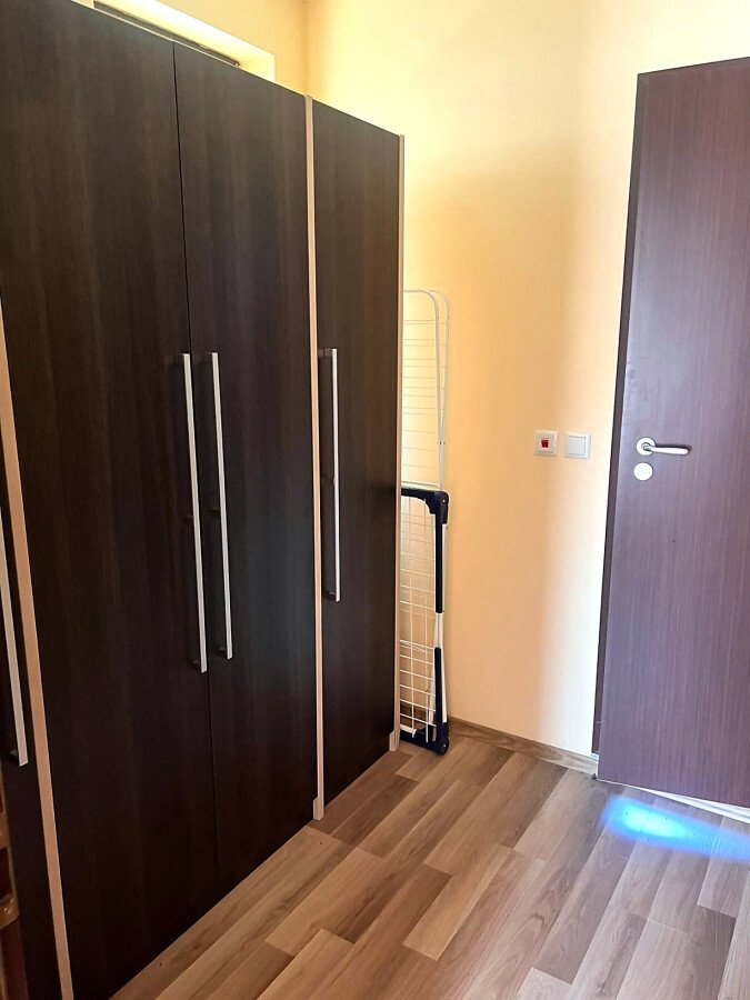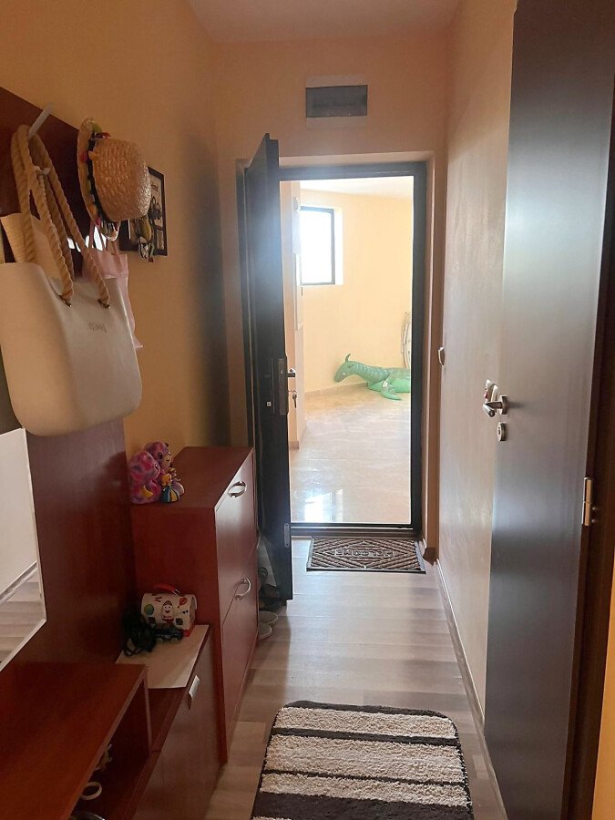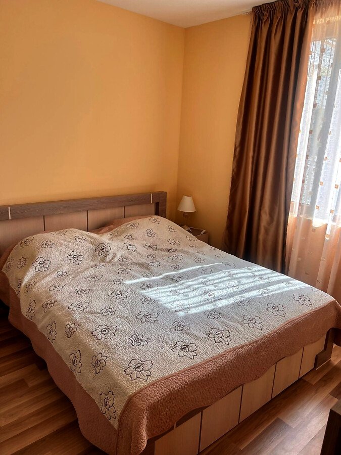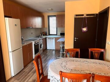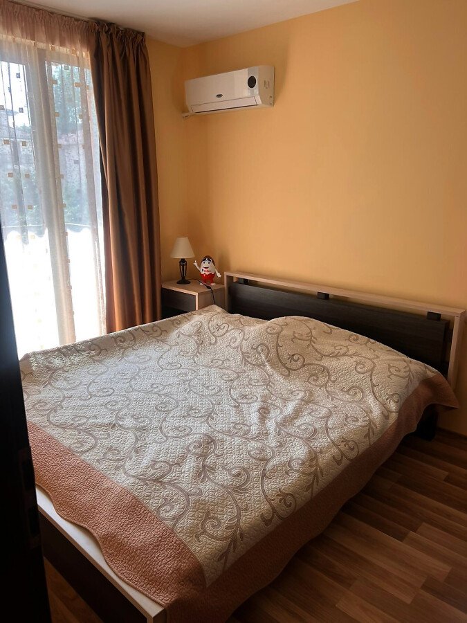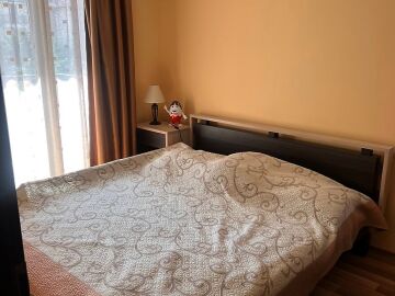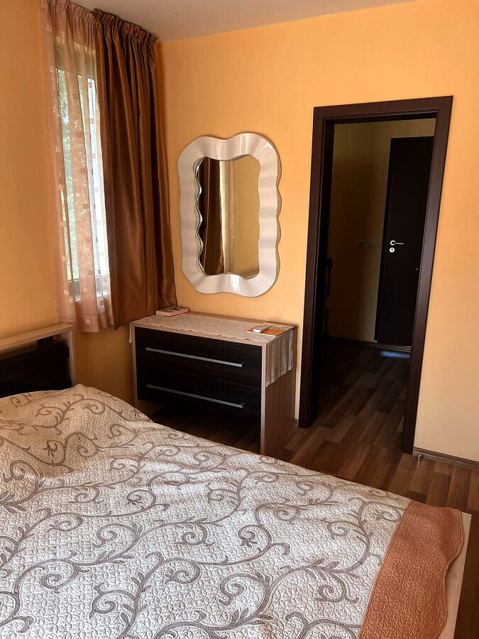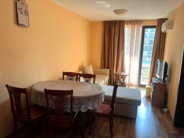 Апартаментът е разположен на втори етаж в сграда с асансьор и има следното разпределение – входно антре, всекидневна с обособен кът за хранене и кухненски бокс, две спални, баня с тоалетна и душ кабина, тераса с централна гледка към басейна и вътрешната част на комплекса. Продава се в отлично състояние, добре обзаведен с хубави мебели, оборудван с качествена домакинска електротехника, готов за живеене.