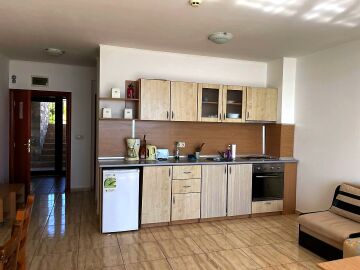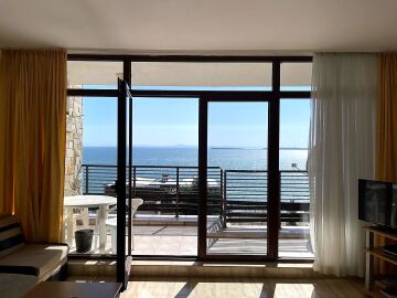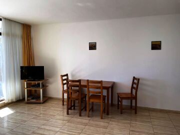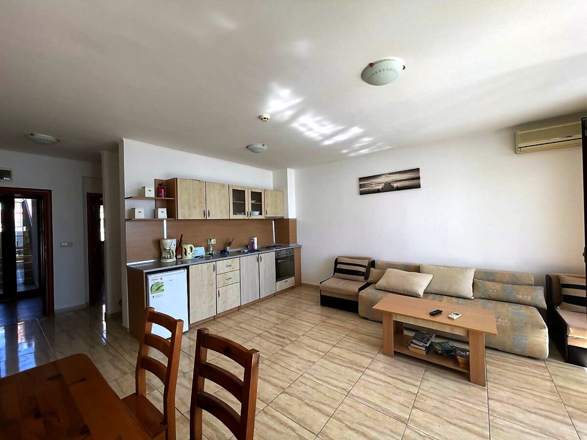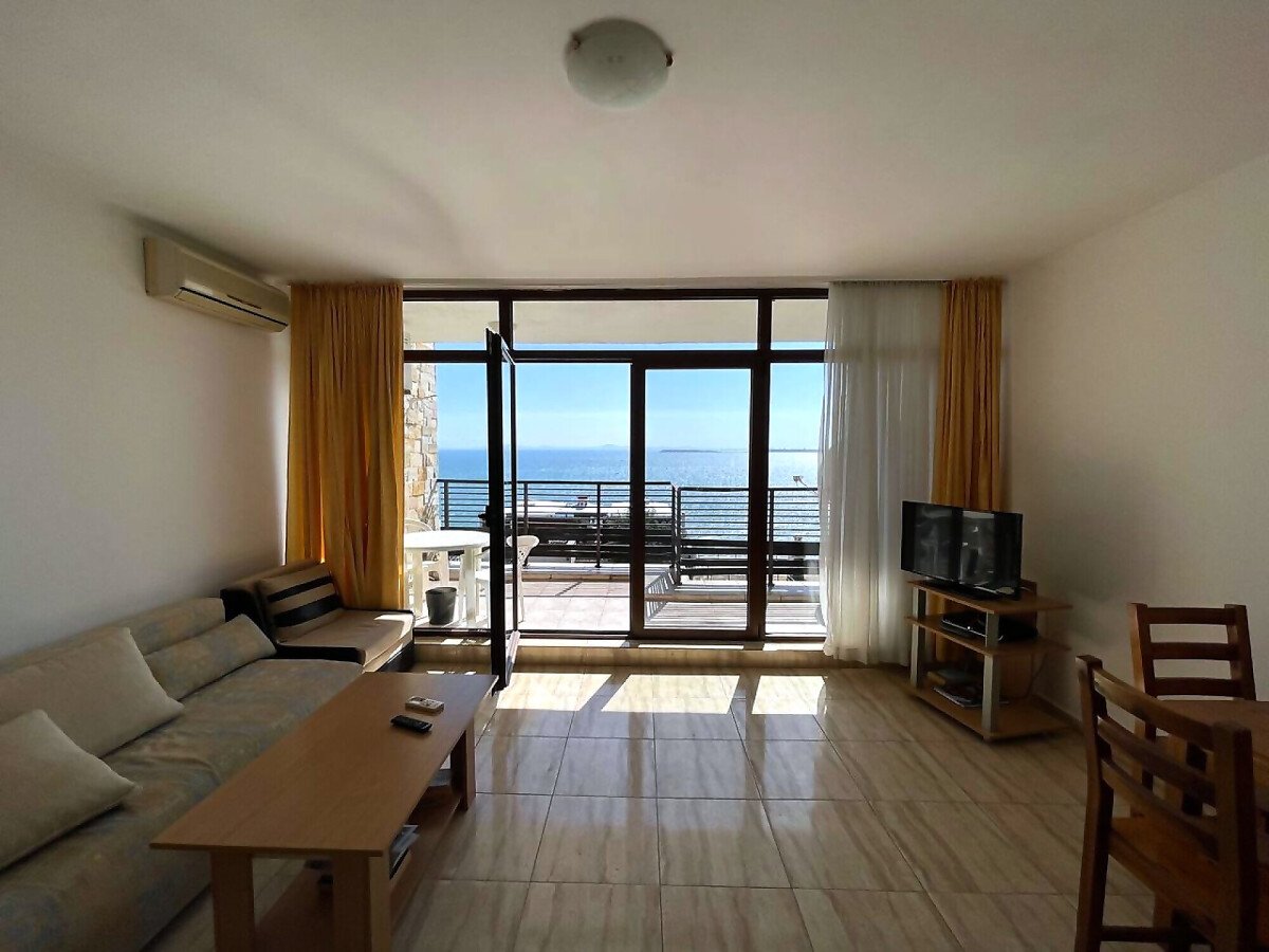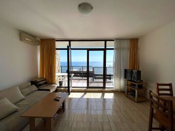 Апартаментът е разположен на трети етаж и разкрива прекрасна панорамна гледка към морето. Разположението на жилището е следното – голяма всекидневна с кухня и обособена зона за хранене, тераса с гледка към морето, спалня, баня с тоалетна и вана. Продава се в отлично състояние, добре обзаведен и оборудван с домакинска електротехника, готов за живеене.
