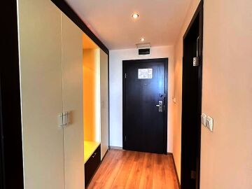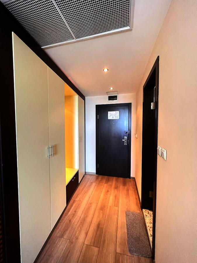Студиото е разположено на четвърти етаж, с площ 43 кв.м. и следното разпределение – входно антре, всекидневна с обособена спалня и кухненски бокс, голяма баня с тоалетна и душ кабина, тераса с красива панорамна гледка към морето и басейна. Продава се напълно оборудвано и обзаведено, в отлично състояние, готово за нанасяне.