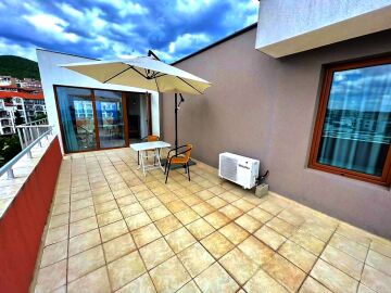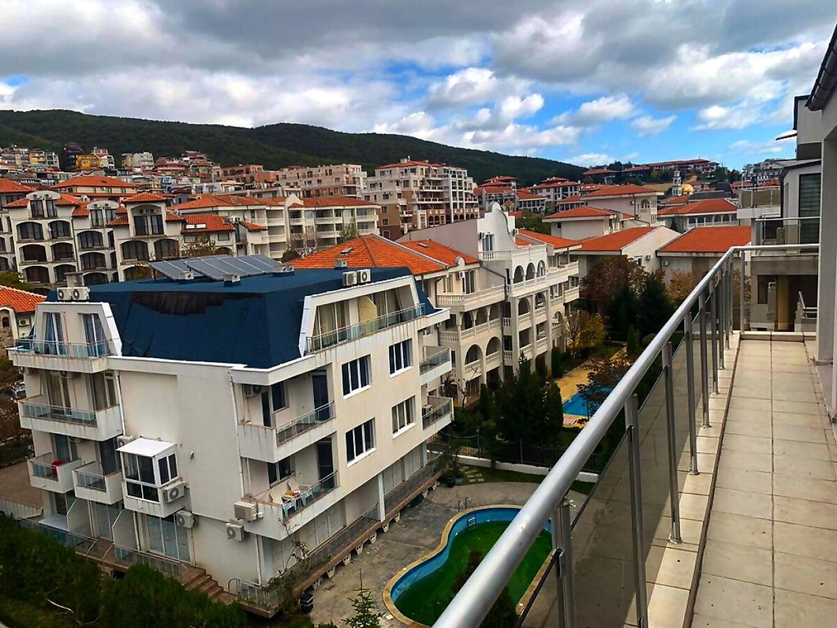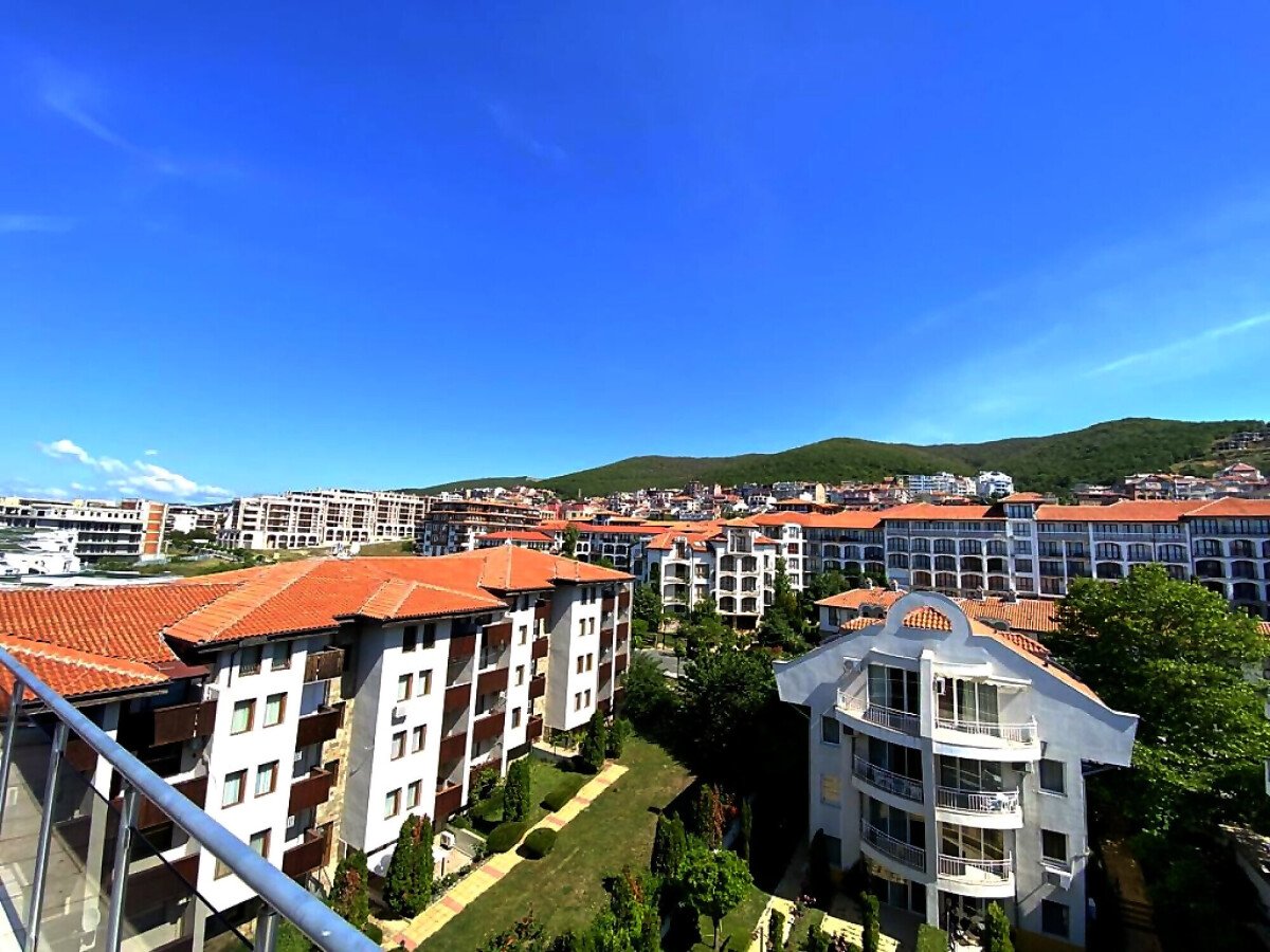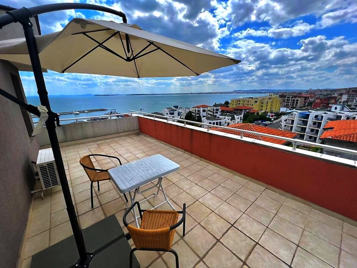 Ние Ви предлагаме да станете собственик на уникален пентхаус с две спални и панорамна гледка към морето в този комплекс. Апартаментът е много слънчев и функционален, със следното разпределение – входно антре, всекидневна с кухненски бокс, две спални, баня с тоалетна и душ кабина, огромна тераса с гледка към морето, басейна и планината. Жилището се продава обзаведено и оборудвано, има всичко необходимо за целогодишно живеене или комфортен престой!