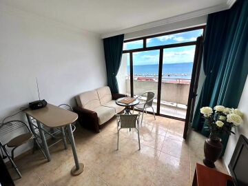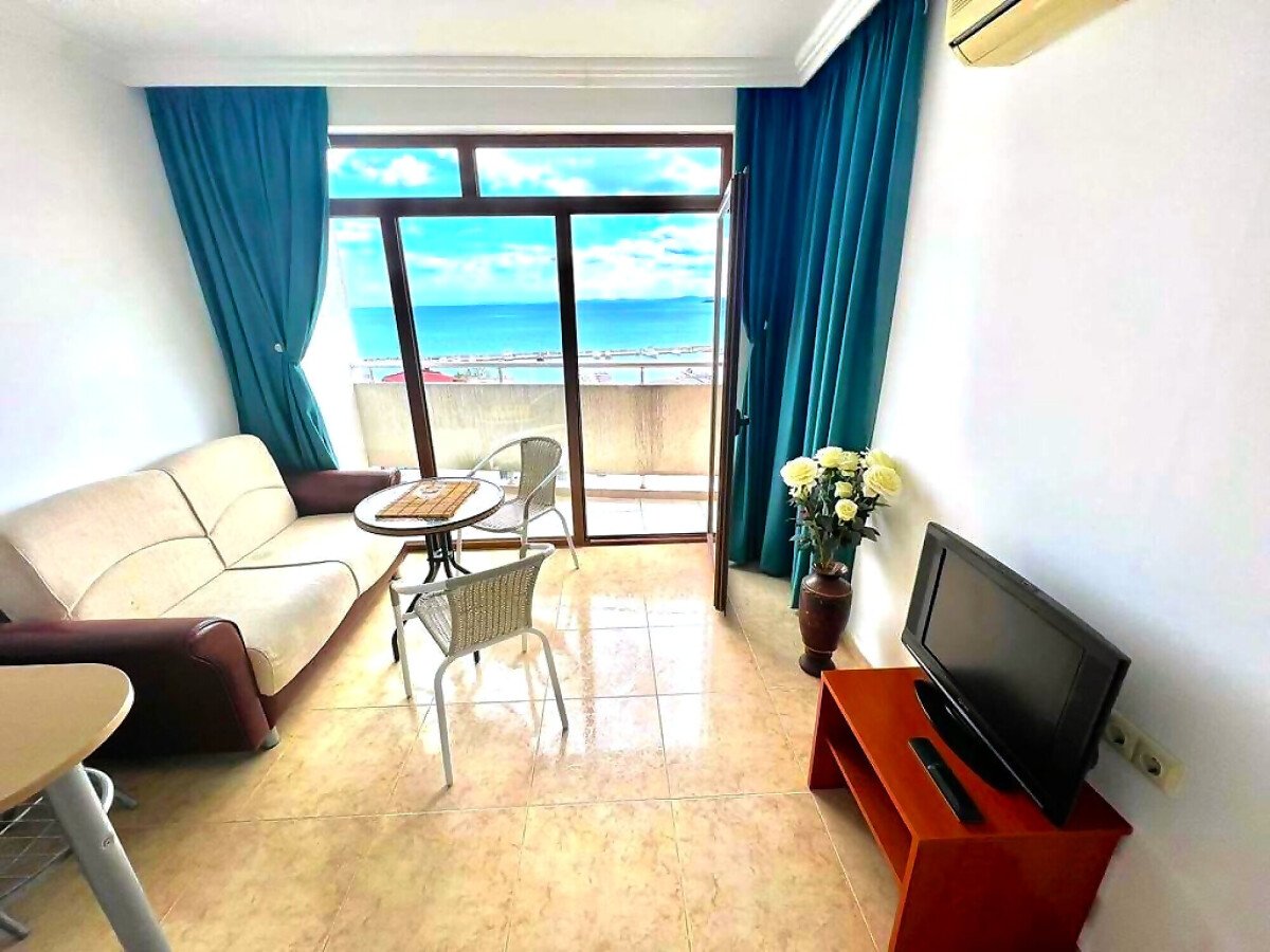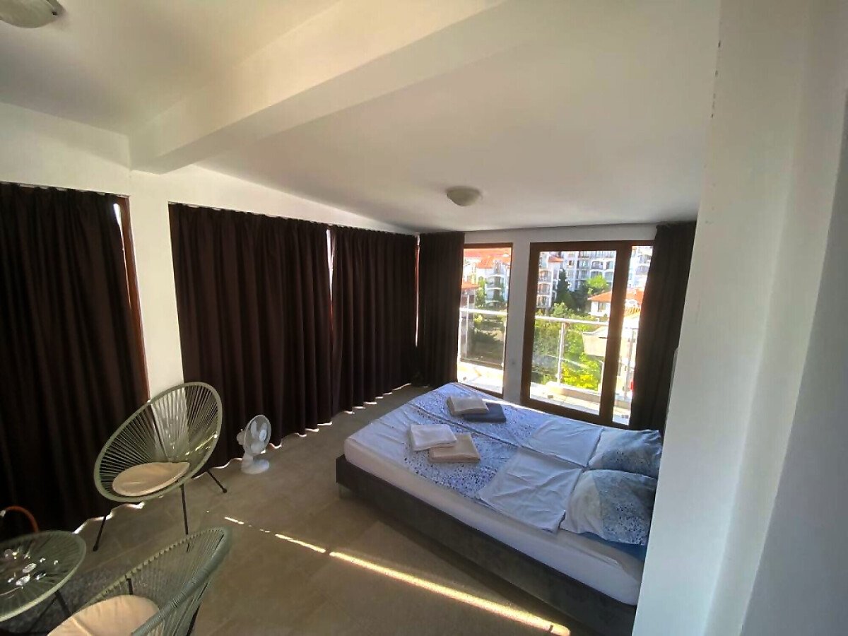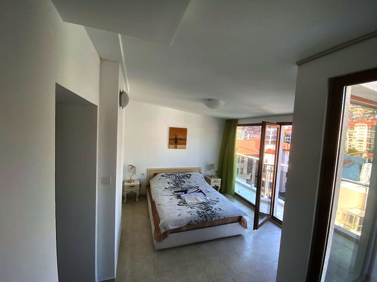 Ние Ви предлагаме да станете собственик на уникален пентхаус с две спални и панорамна гледка към морето в този комплекс. Апартаментът е много слънчев и функционален, със следното разпределение – входно антре, всекидневна с кухненски бокс, две спални, баня с тоалетна и душ кабина, огромна тераса с гледка към морето, басейна и планината. Жилището се продава обзаведено и оборудвано, има всичко необходимо за целогодишно живеене или комфортен престой!