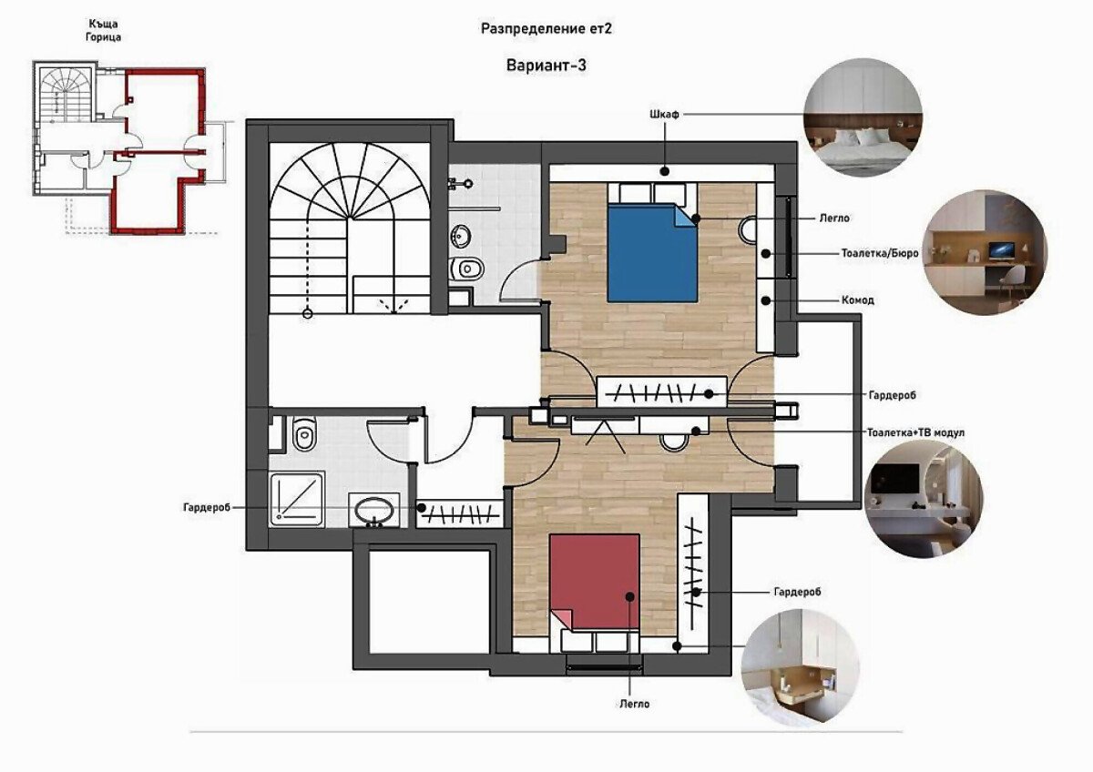 Втори етаж – две спални, две бани с тоалетни, дрешник, тераса.