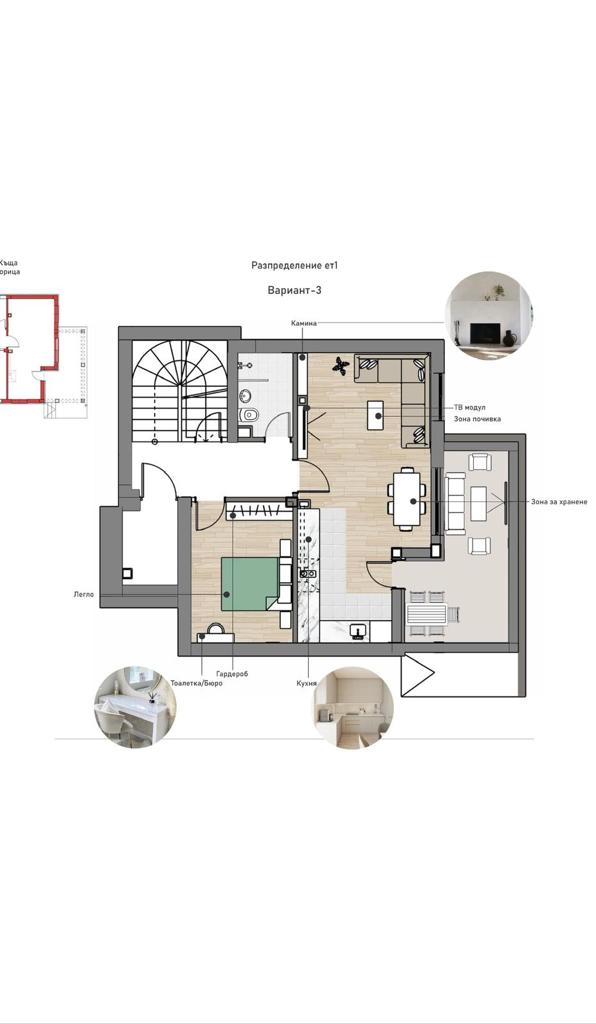 Първи етаж – входно антре, просторна всекидневна с кухня и обособена зона за хранене, спалня, баня с тоалетна, коридор и вътрешно стълбище, голяма веранда с площ 20 кв.м. Верандата може да се приобщи към всекидневната.