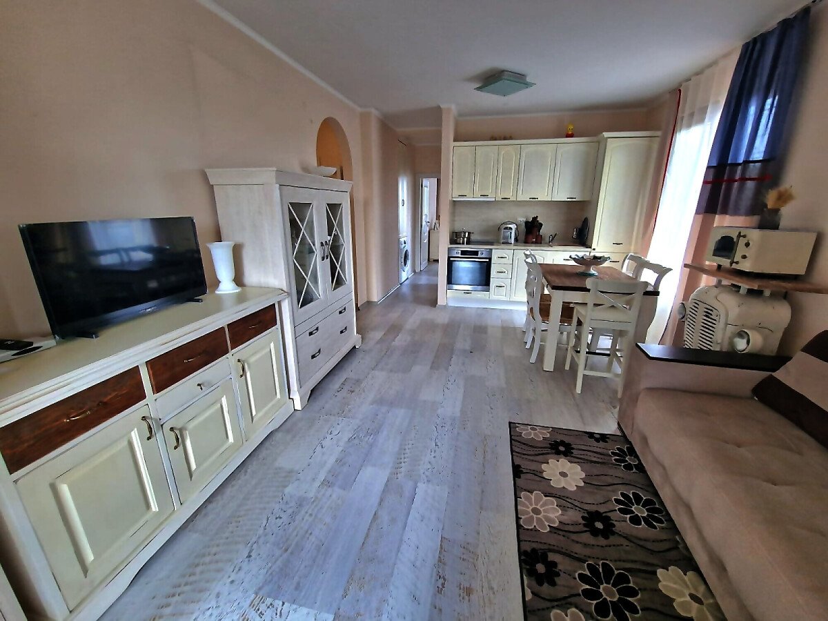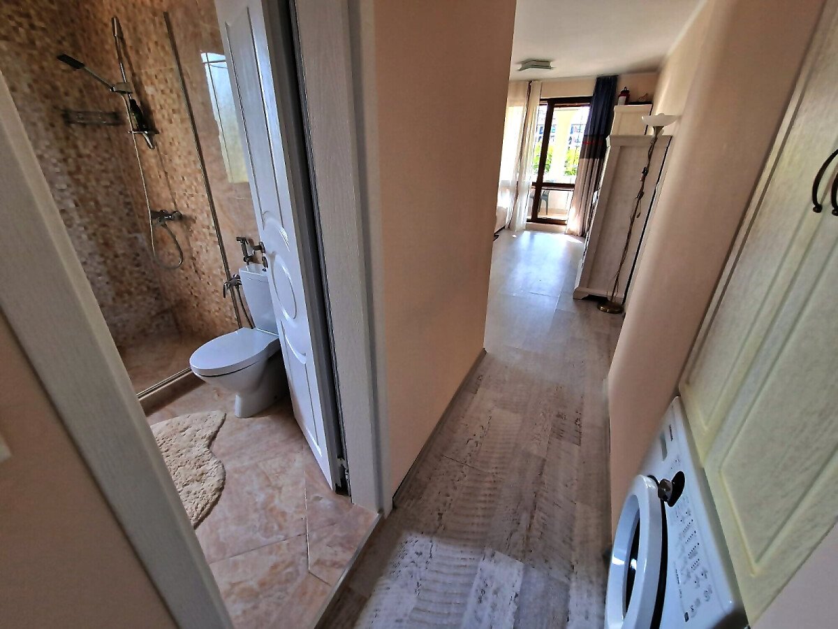 Апартаментът е функционален и просторен, със следното разпределение – входно антре, всекидневна с обособен кът за хранене и кухня, две спални, две бани с тоалетна и душ кабина, тераса с гледка към басейна и озеленената вътрешна територия на комплекса.