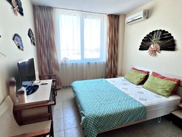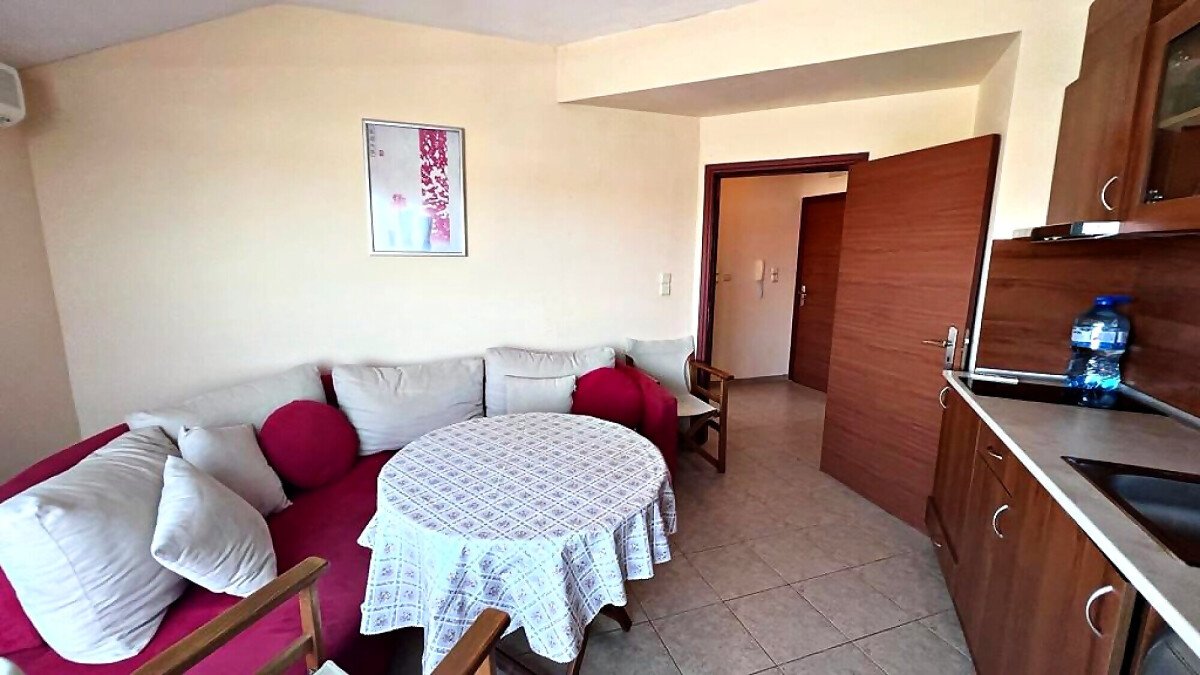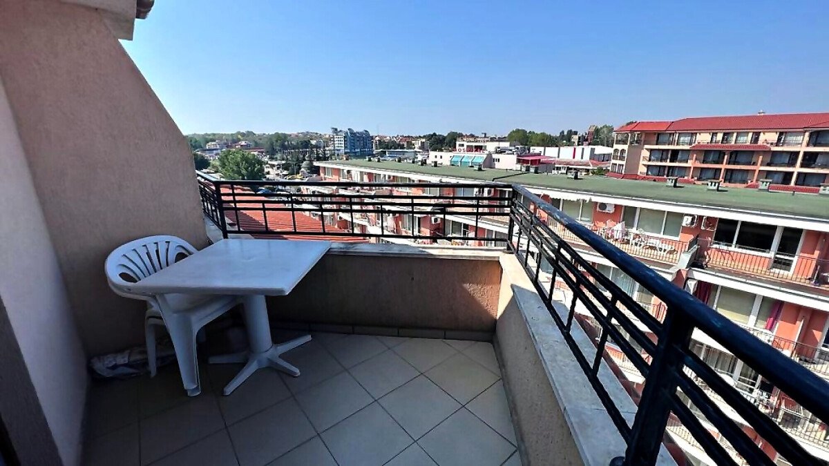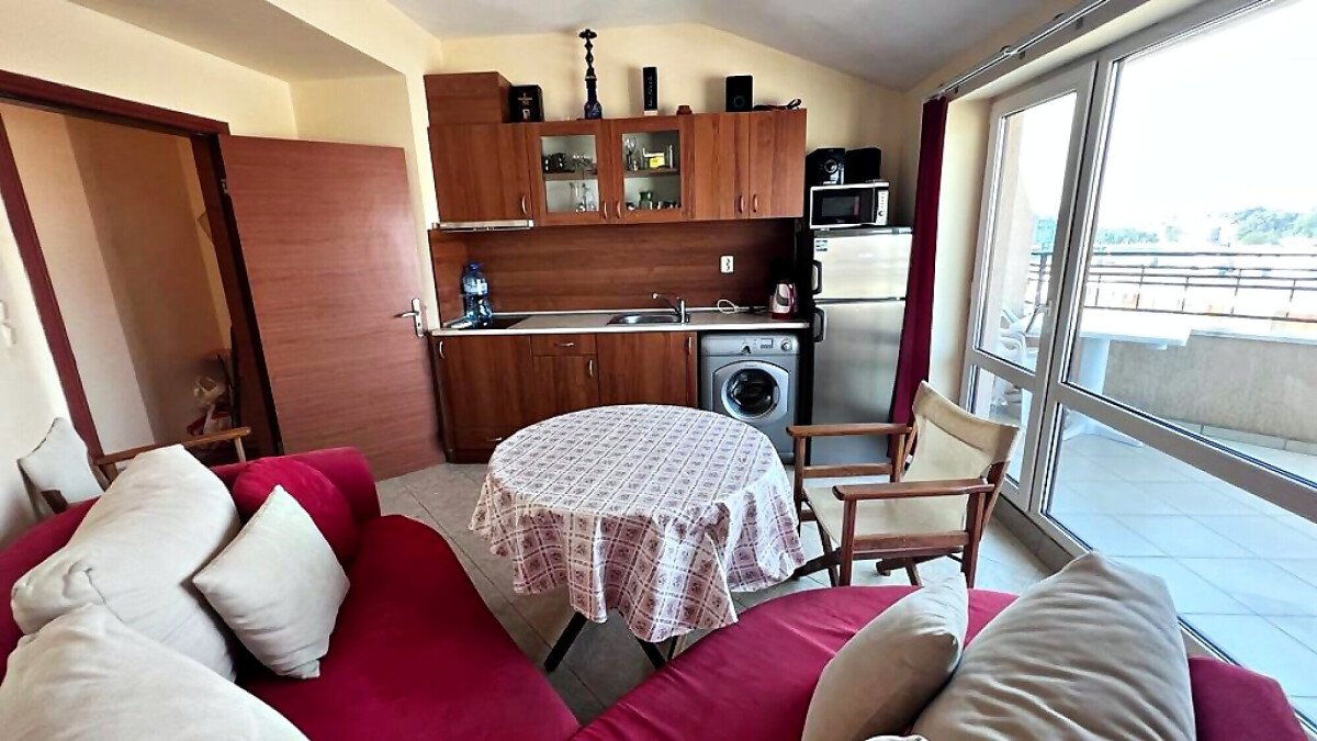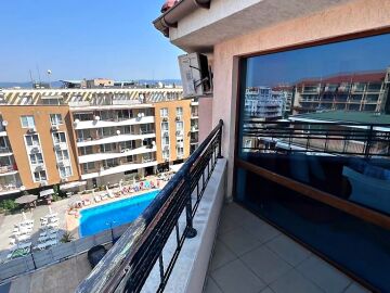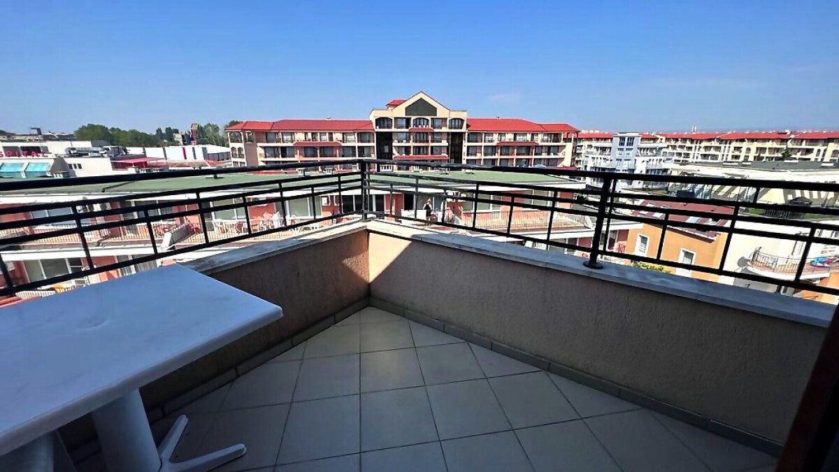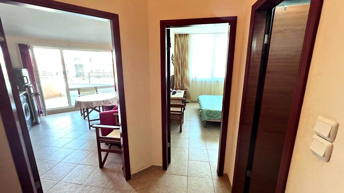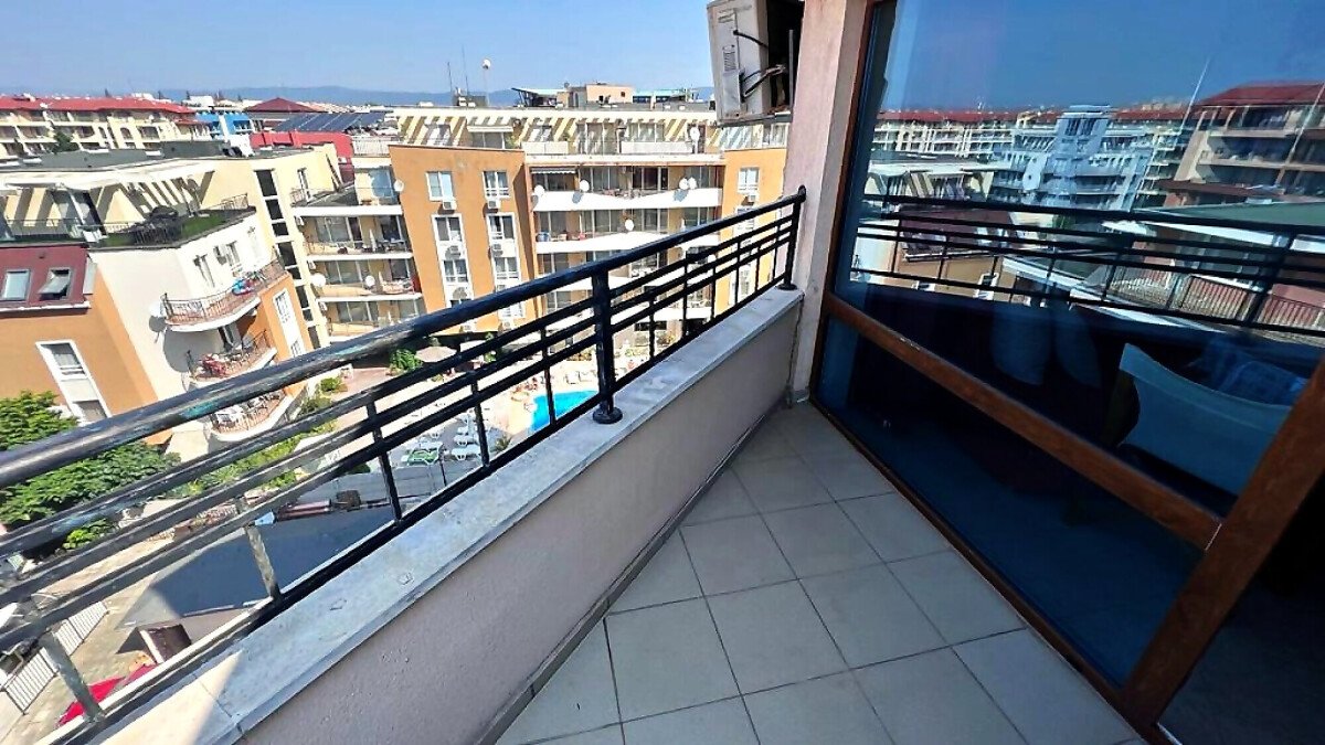 Апартаментът е слънчев и много функционален, разположен на последен етаж, със следното разпределение – входно антре, всекидневна с кухненски бокс, спалня, баня с тоалетна и душ кабина, тераса с гледка към басейна и вътрешната част на комплекса.