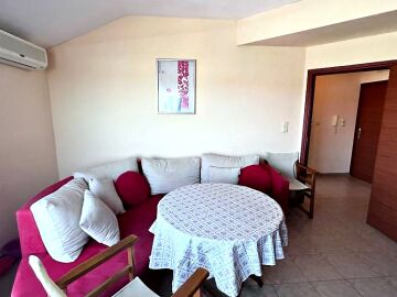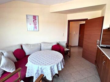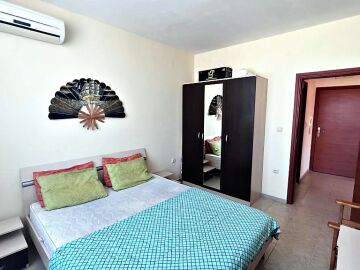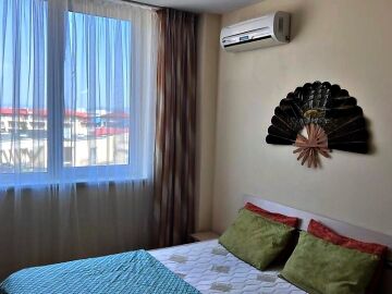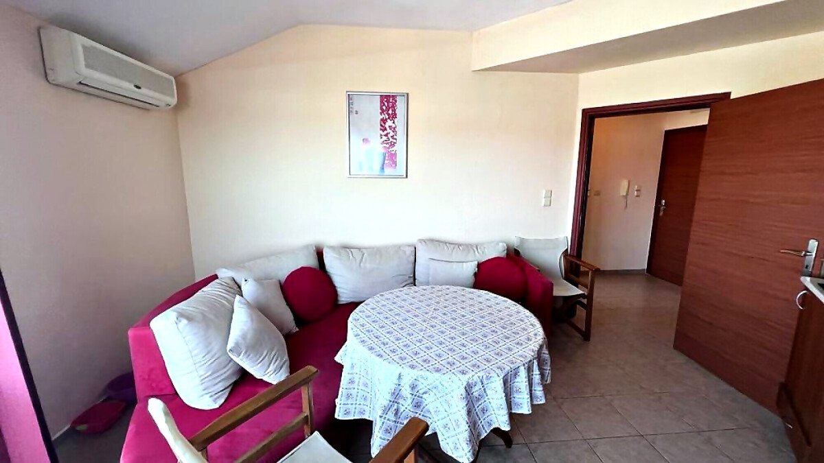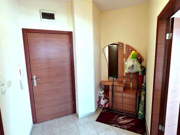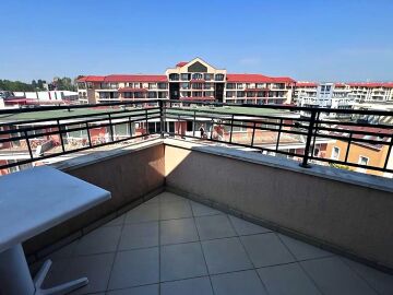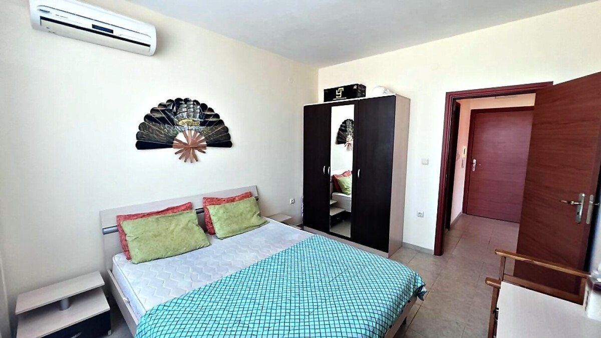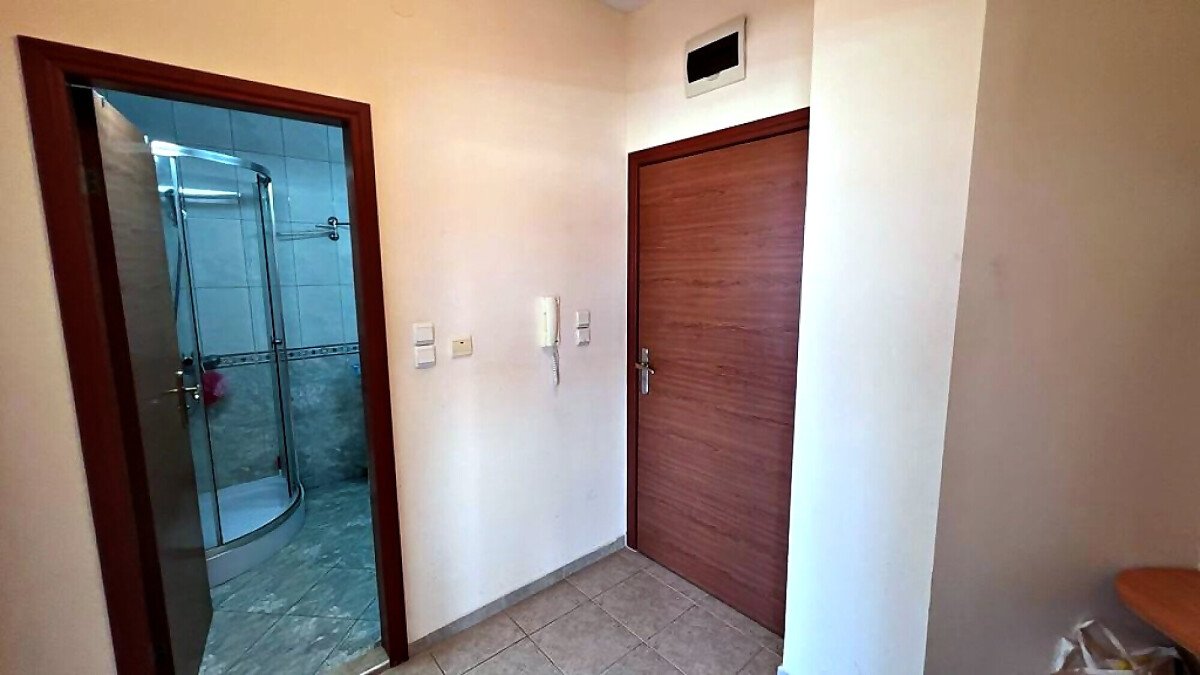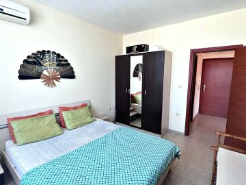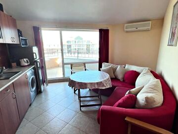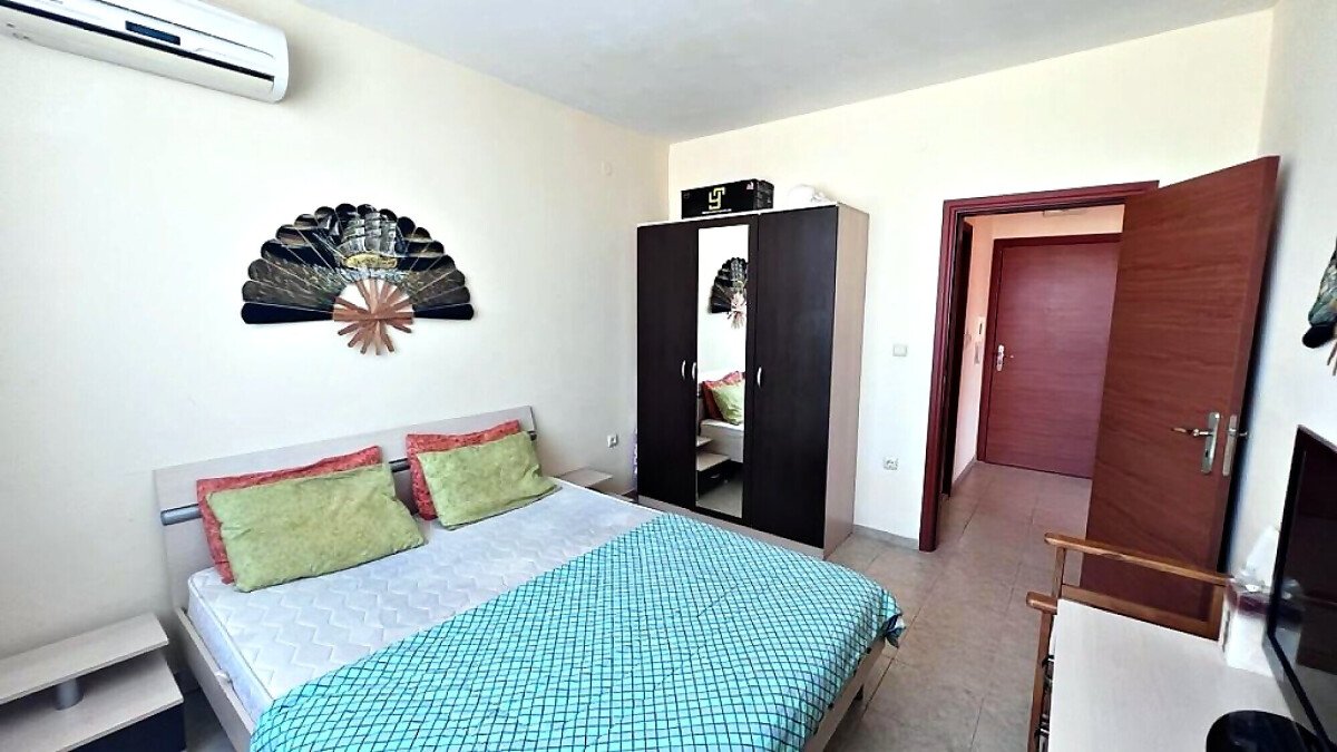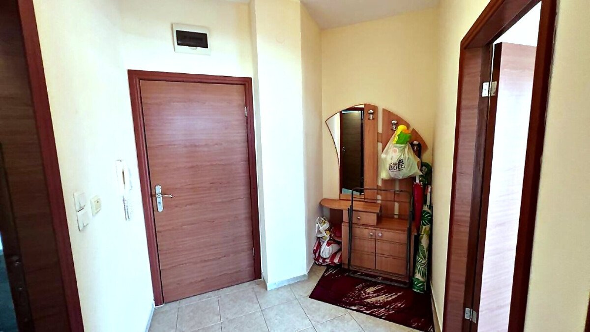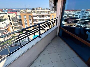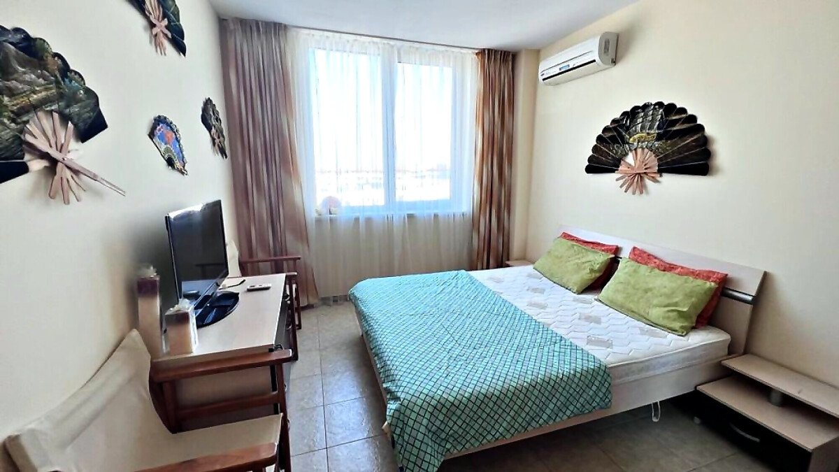Апартаментът е слънчев и много функционален, разположен на последен етаж, със следното разпределение – входно антре, всекидневна с кухненски бокс, спалня, баня с тоалетна и душ кабина, тераса с гледка към басейна и вътрешната част на комплекса.
