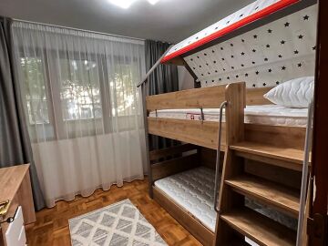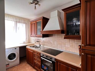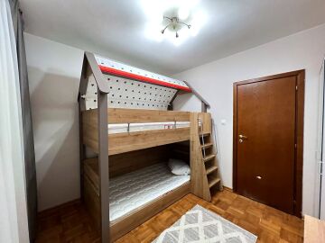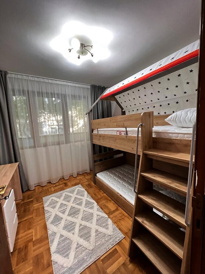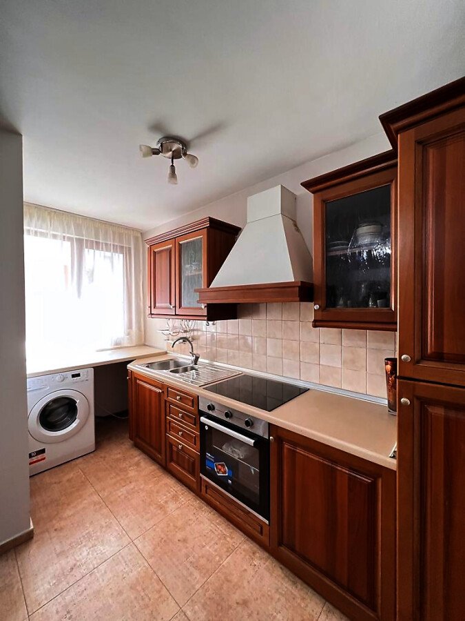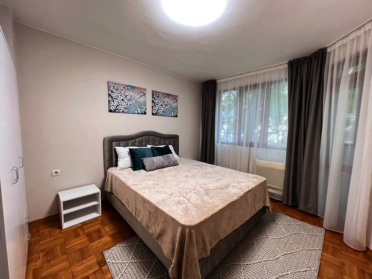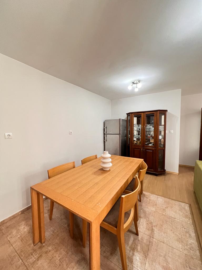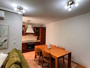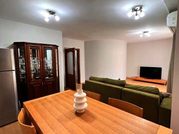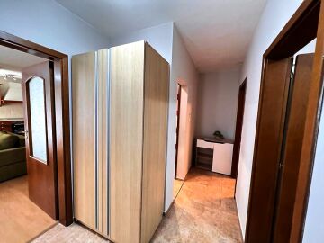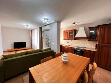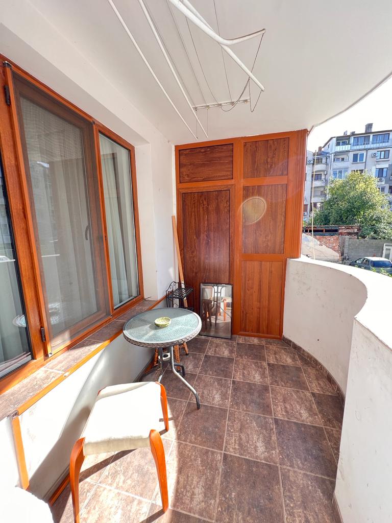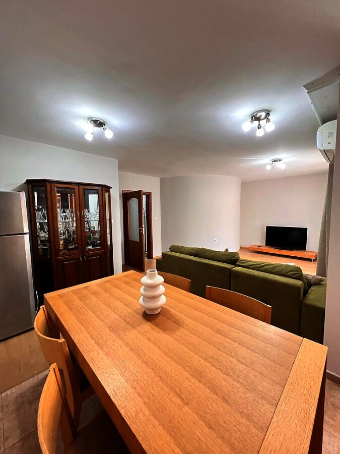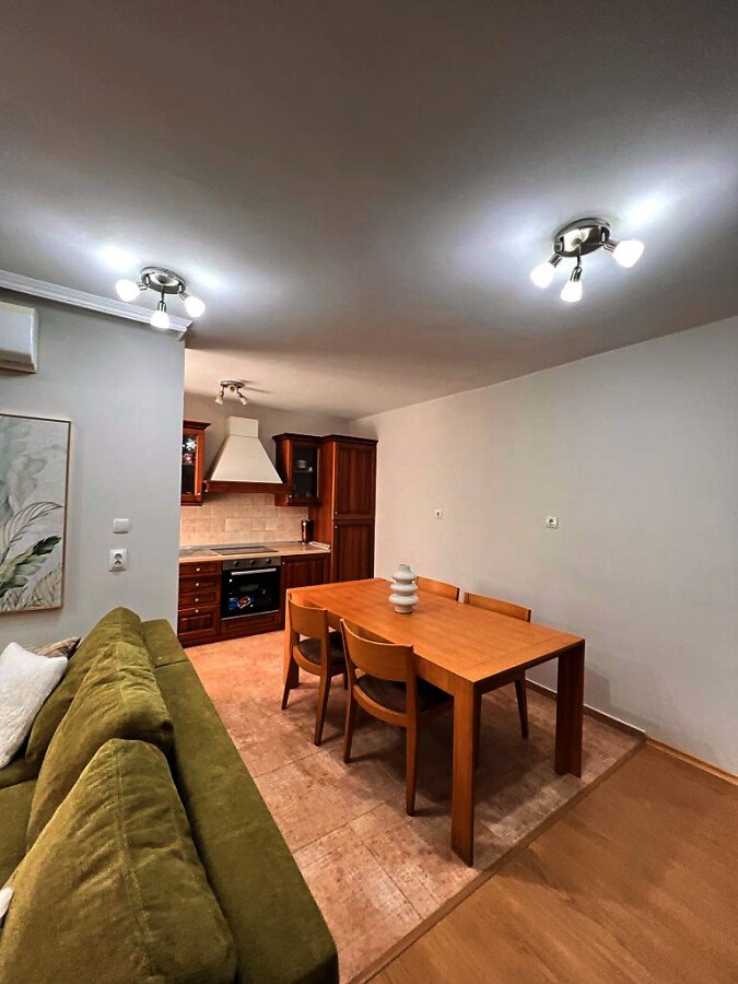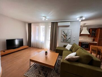 Апартаментът е разположен на първи жилищен етаж и има следното разпределение – входно антре, голяма всекидневна с обособена кухня и зона за хранене, две спални, баня с тоалетна и душ кабина, две тераси, едната от които е затворена. Имотът е след основен ремонт, обзаведен с чисто нови мебели и качествена нова електротехника. Жилището впечатлява с хубав интериорен дизайн, завършено е с висококачествена дограма и паркет, а климатиците „Дайкин“ са от най-висок клас.