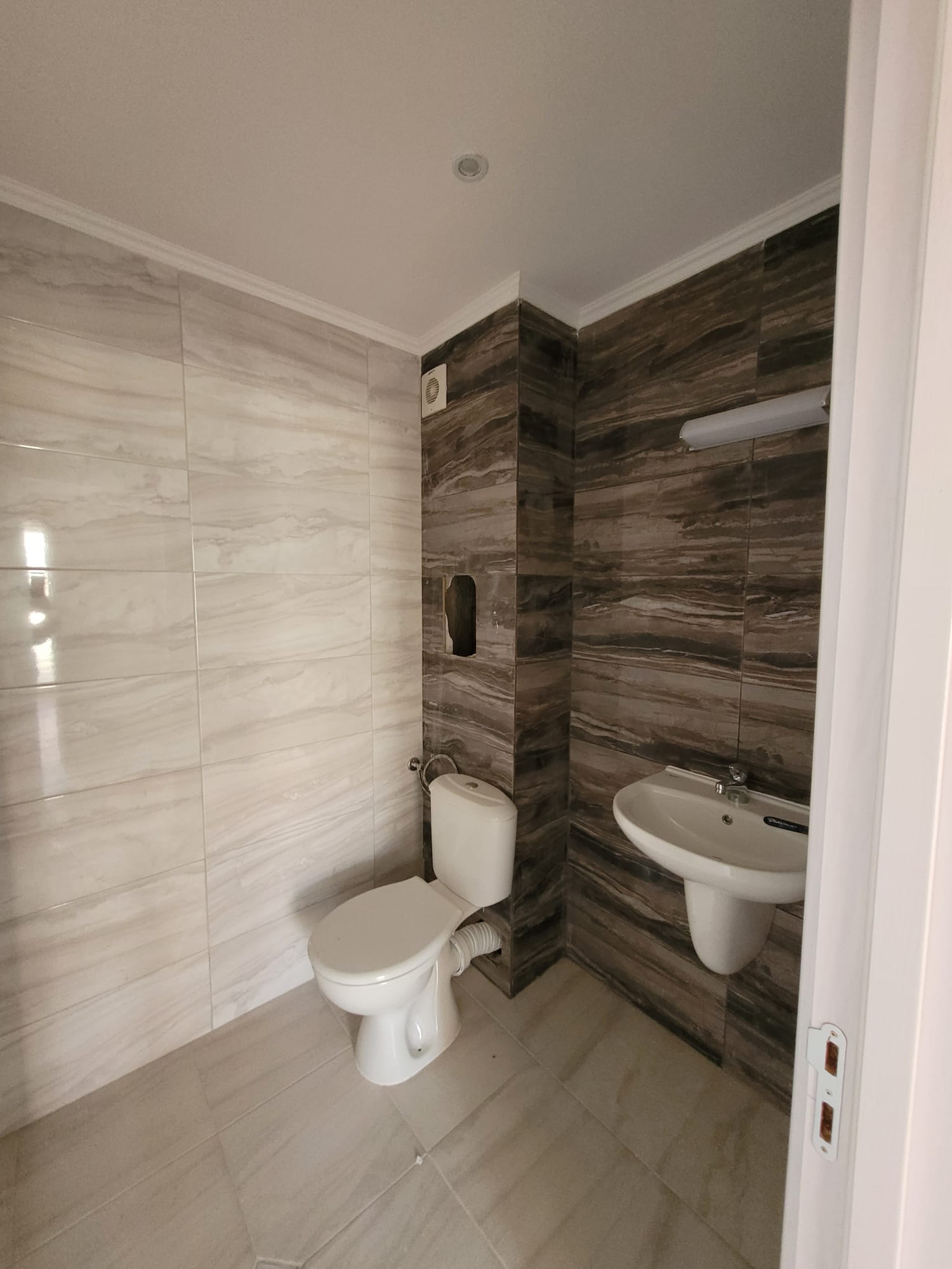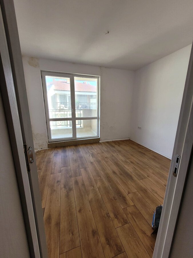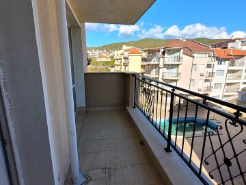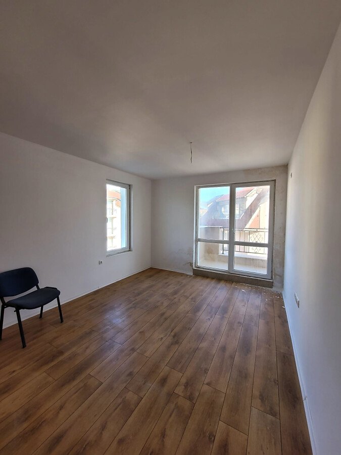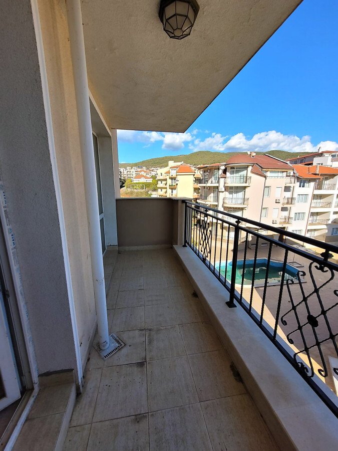 Апартаментът е светъл и функционален, със следното разпределение – входно антре, две стаи, баня с тоалетна, тераса с гледка към басейна, морето и планината. В жилището има подови настилки и качествена дограма, както и врати. Банята е напълно завършена.