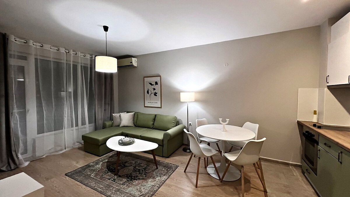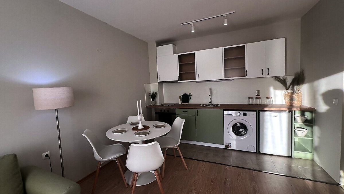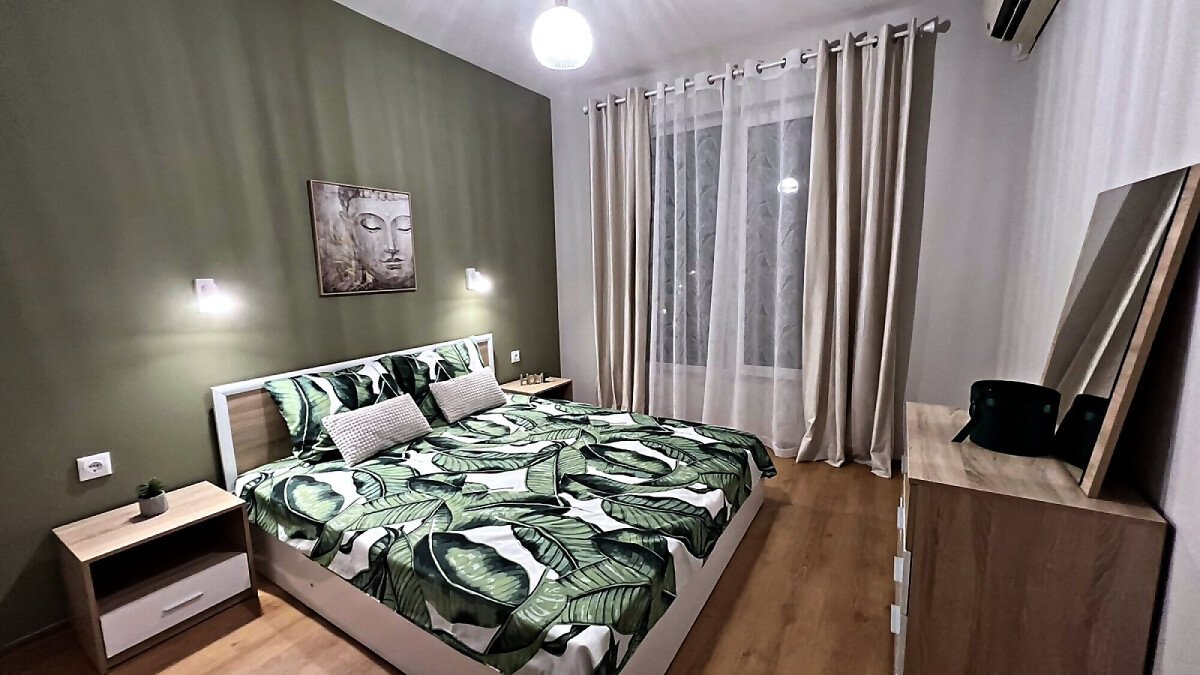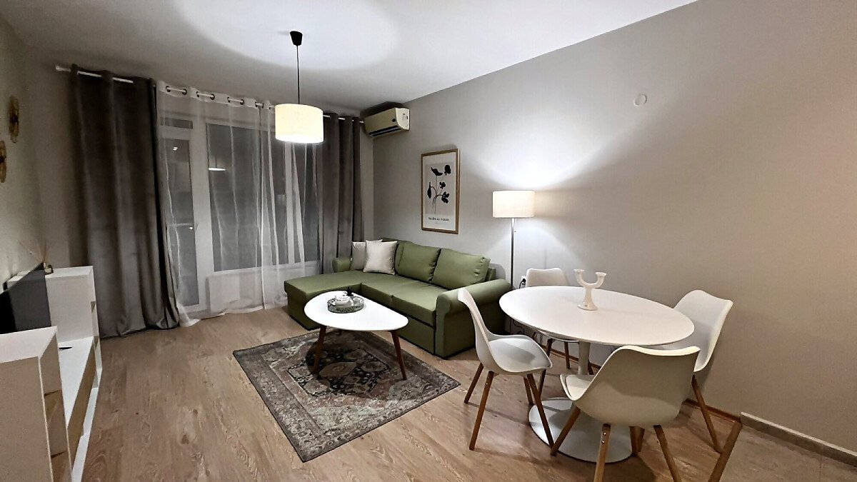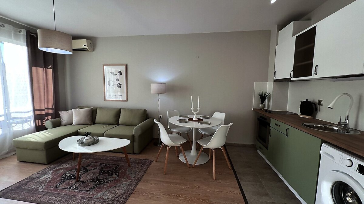 Апартаментът е разположен на трети етаж, като сградата разполага с асансьор и има следното разпределение – входно антре, всекидневна с кухненски бокс, спалня, баня с тоалетна и душ кабина, тераса. Продава се в отлично състояние, обзаведен с нови и стилни мебели, оборудван с качествена домакинска електротехника, готов за живеене или отдаване под наем.