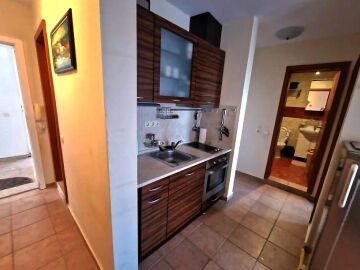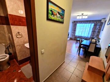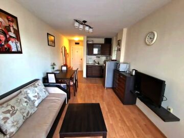 Апартаментът се състои от входно антре, всекидневна с кухня и трапезария, малък коридор, две спални, тоалетна, баня с тоалетна и душ кабина, тераса с гледка към басейна. Годишната такса поддръжка е в размер от 12,5 евро на кв.м.